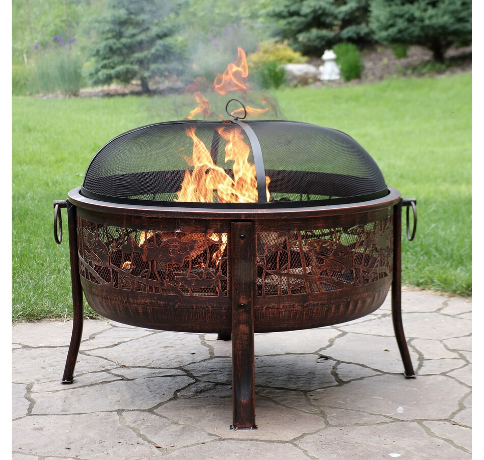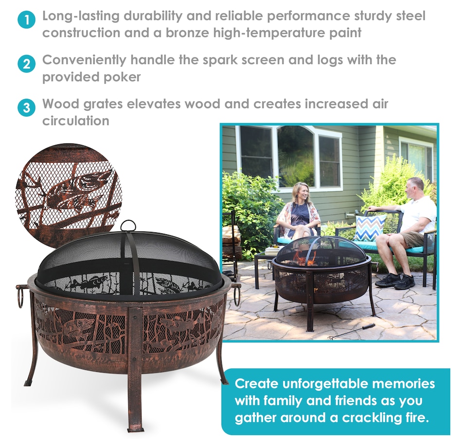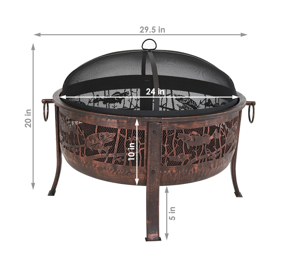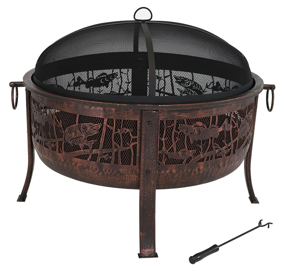 This Northwoods fishing fire pit is the perfect addition to a cabin, camper, or backyard with an included spark screen for further protection and convenience. Featuring a charming fishing theme, this outdoor, wood burning fire pit design provides ample of room for the perfect size fire and is easy to tend to and clean. The overall fire pit handle to handle is 34" diameter with a large 30" diameter bowl that is 11" deep. It is accented with a decorative fishing pattern that gets beautifully illuminated at night. Each fire pit includes a log poker to safely maintain your embers, spark screen for protection against the embers, cover for longevity, and a wood grate just for added fun. This is a wood burning fire pit and with all fire pits, is not designed to burn on a deck unless a fireproof pad is used. Enjoy this sturdy steel fire pit with the decorative design in any backyard or patio today.