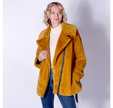 • Fabric: 90% polyester, 10% spandex (shell, lining); 100% polyester (filling, pocket lining); 79% acrylic, 2% modacrylic, 9% polyester (faux fur)
