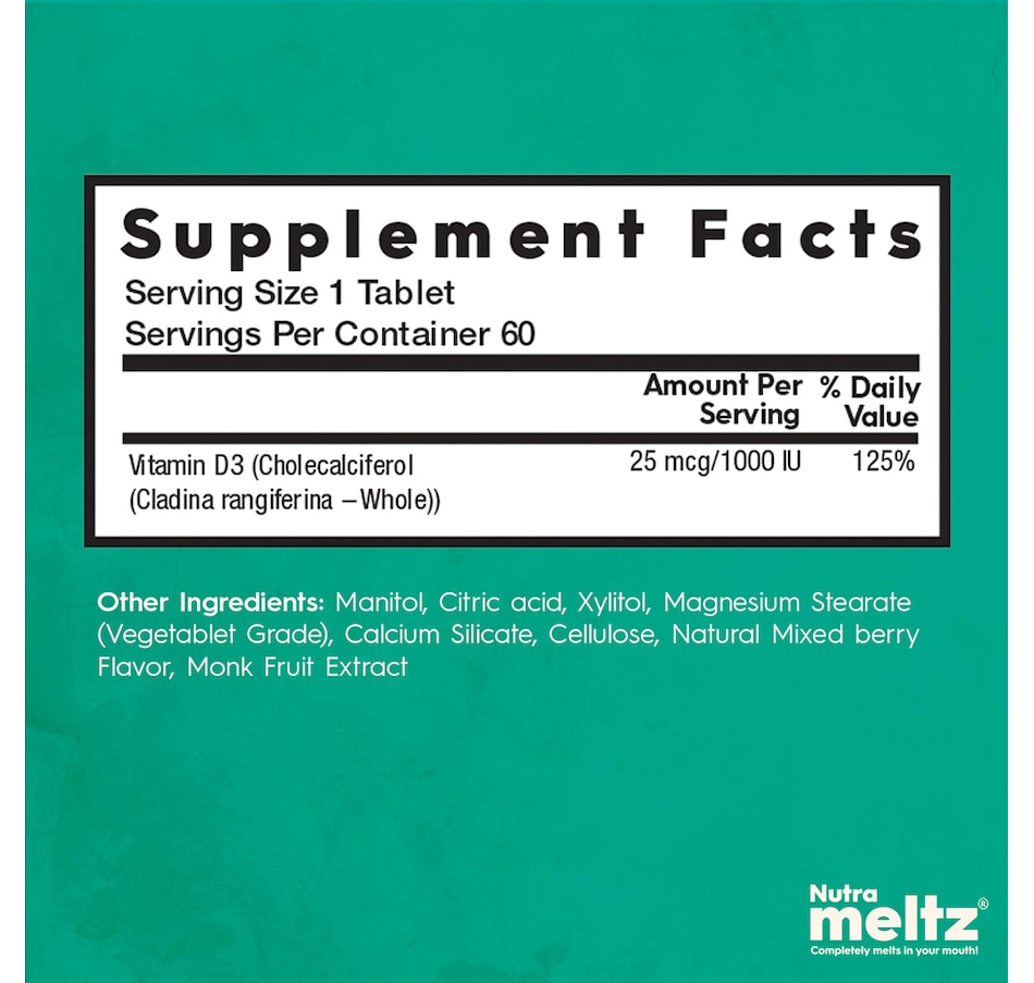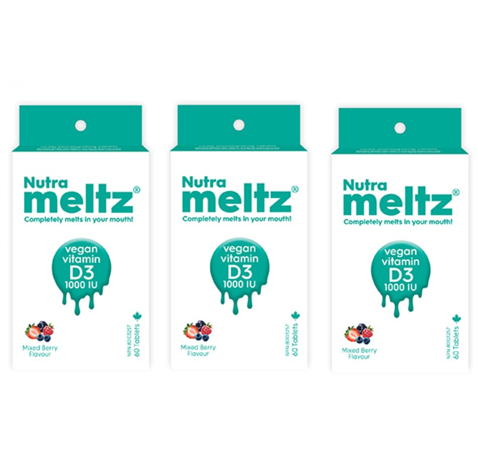 • (3) Nutrameltz Vegan Vitamin D3 1000iu (60ct)—valued at $22.99 each