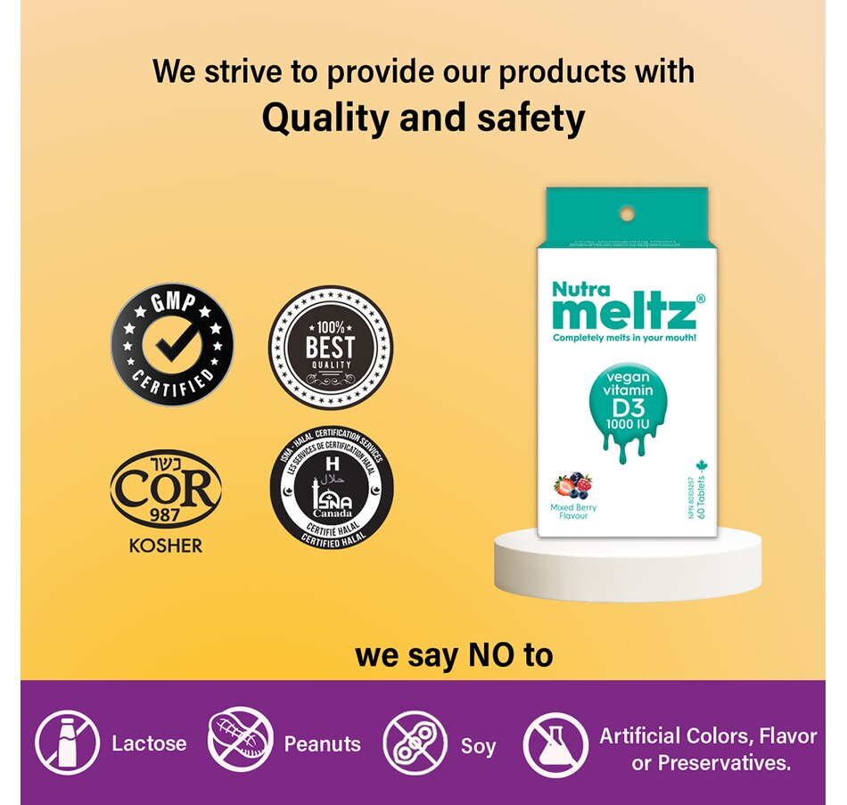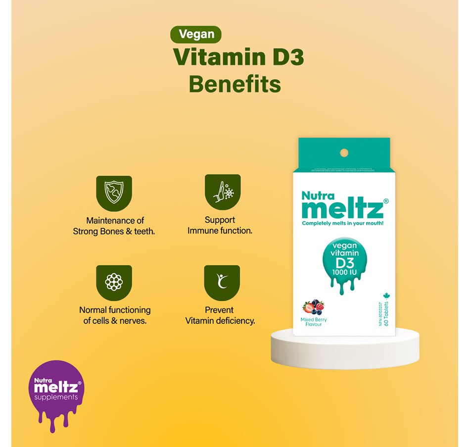 Nutrameltz Vegan Vitamin D3 1000 IU is an effective supplementation for those with vitamin D deficiency and want proper immune function. Vitamin D enhances calcium absorption, building strong bones. This vitamin is not readily available in most foods like most vitamins. The most prevalent source of vitamin D is the sunlight. When exposed to sunlight human body produces Vitamin D. Nevertheless, vitamin D deficiency is quite a common occurrence in many individuals leading to the need for dietary supplements.