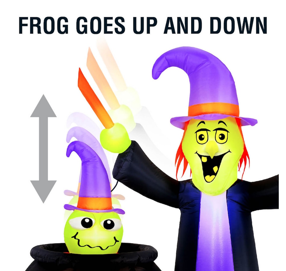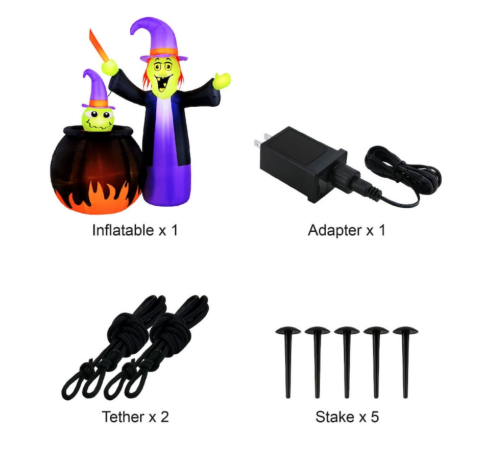 Create a bewitching Halloween scene with the Occasions Halloween five foot inflatable animated witch with cauldron! This enchanting decoration self-inflates in seconds with the included blower, making set-up a breeze. Crafted from weather-resistant materials, it's perfect for both indoor and outdoor use. The lights add an eerie glow to your spooky display, while the animated features bring this whimsical scene to life. After the festivities, it easily deflates for compact storage. Add this charming witch and cauldron to your Halloween decorations for a touch of magical fun!