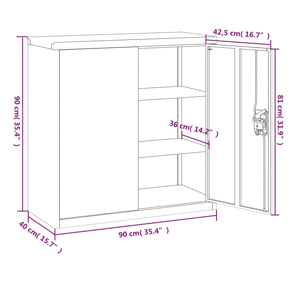 This office cabinet, with its simple and elegant design, will be ideal for storing files and other office supplies, but it also makes an exceptional decorative addition to your office. With 2 adjustable shelves, this cabinet allows you to neatly sort your files in several categories. This cabinet fits any office decor with its classic design. Made of steel, this cabinet is not only sturdy, but also easy to clean and maintain. Assembly is very easy as the necessary accessories are included in delivery.