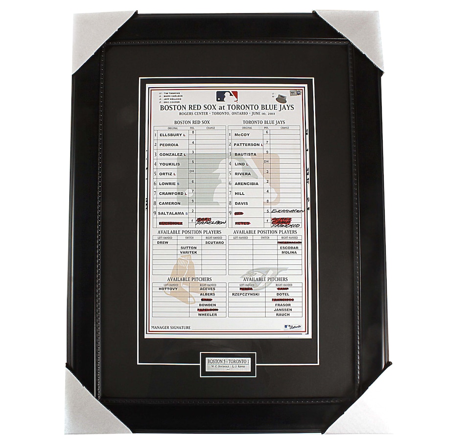 Very rare and almost impossible to obtain, this game used dugout Toronto Blue Jays Lineup Card from a series of games at the Rogers Centre in Toronto from the 2011 season versus the Boston Red Sox with the actual line up changes directly on the card. The lineup card is nicely framed and matted with a plate detailing the score of the game and the winning and losing pitchers. Comes with a certificate of authenticity from DPI Sports unconditionally guaranteeing the authenticity of the line up card.  The Shopping Channel has secured a series of 5 of these game used lineup cards so don't miss out!