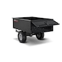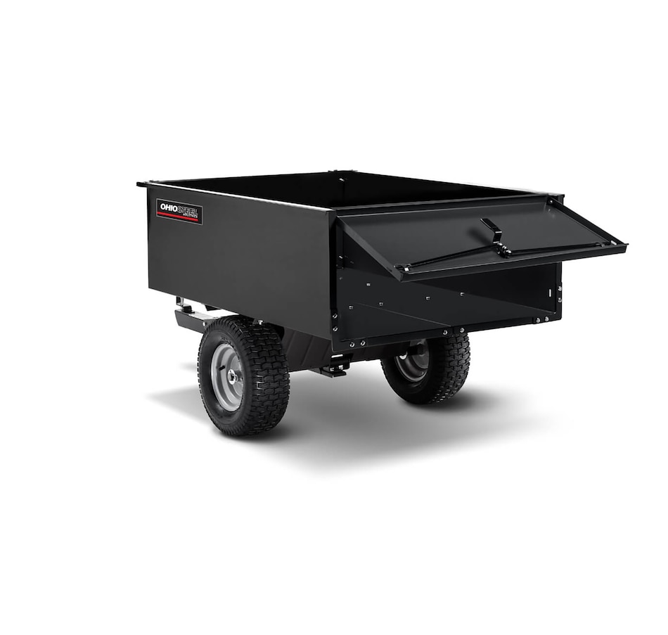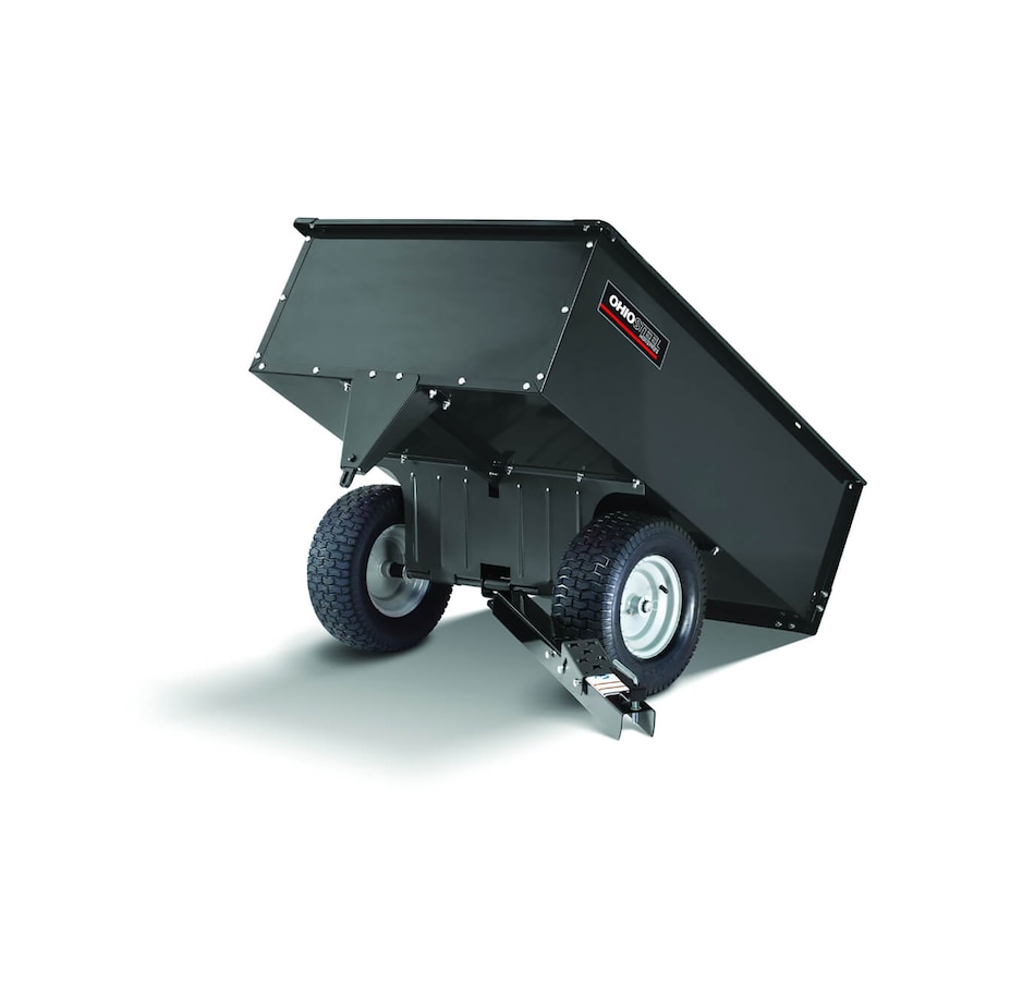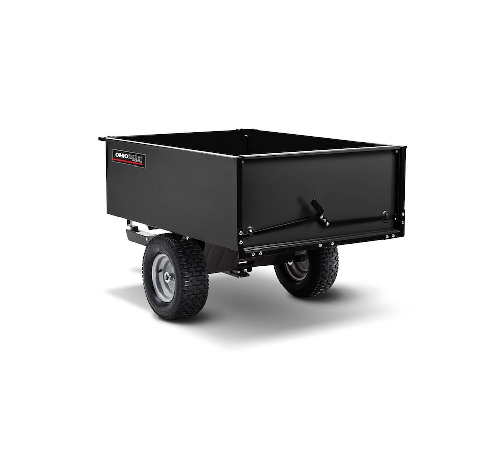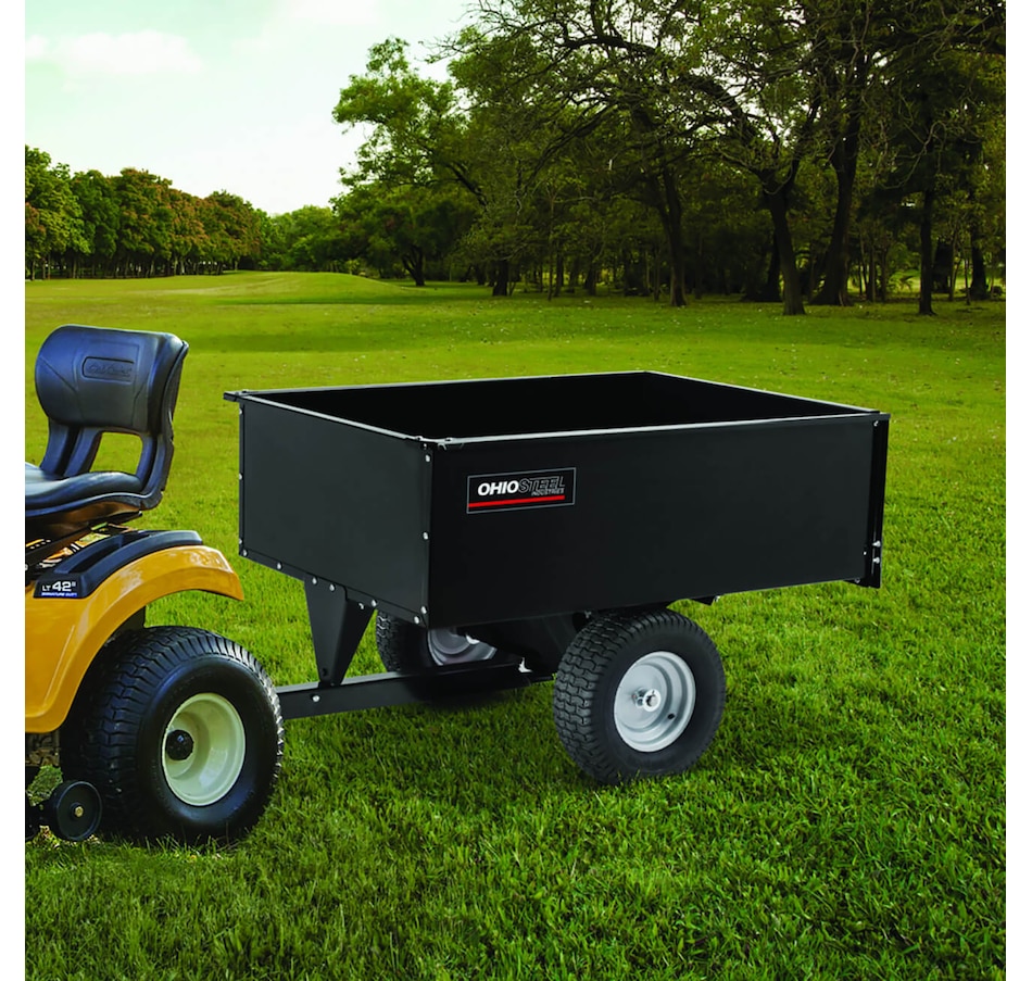 This patented steel swivel dump cart is ideal for extra-large hauling jobs around your yard, farm or estate. The 16 cubic foot bolt-together steel bed will hold an impressive 1250 pounds! Upon activation of the step-on dump release pedal, the bed tilts and swivels to empty the load anywhere within a 105-degree radius. Ohio Steel's exclusive spring-loaded hitch pin with integrated handle allows for easy hook-up to riding mowers and zero turn mowers equipped with pin hitch receiver. It hauls mulch, dirt, rocks, firewood and other gardening, farming and landscaping materials with ease.