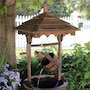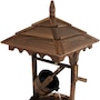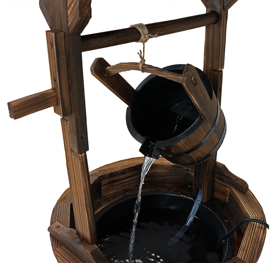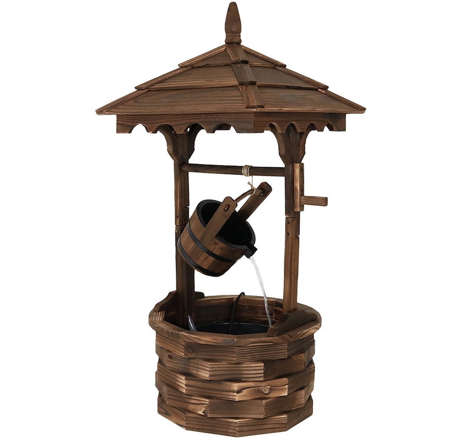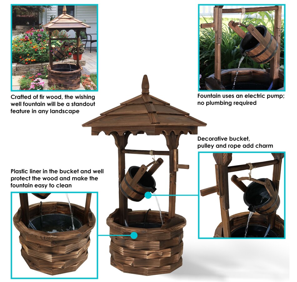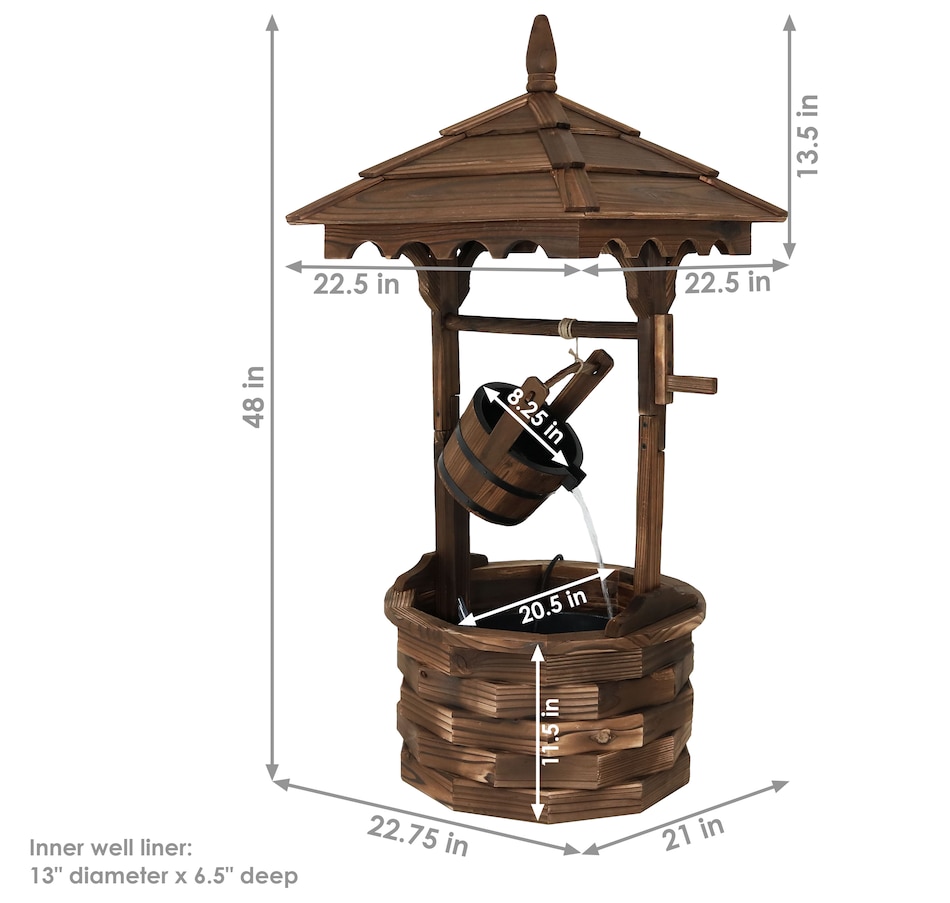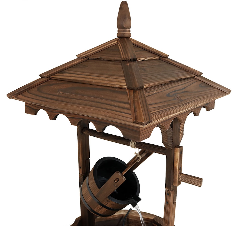 Add whimsical appeal to any garden, patio, entryway, front porch, or yard with this outdoor, electric, wooden wishing well fountain. Constructed of real fir, this wishing well fountain features durable, plastic liners in the bucket and well. Embellishments on the roof give this fountain added appeal including the scalloped trim and the ornamental finial at the top. The basket at the bottom also features wicker-like details to ensure style and grace. A decorative pulley also adds a realistic detail to this wishing well fountain. The included electric, submersible, JR-350 pump circulates the water through the fountain and is easy to set up. Once the fountain is assembled, simply fill it up with water, plug the pump into a standard outdoor electrical outlet, and watch your space transform with relaxing soundscapes and a beautiful focal point. This fountain is sure to be a graceful figure. And, don't forget to make a wish! It might just come true.