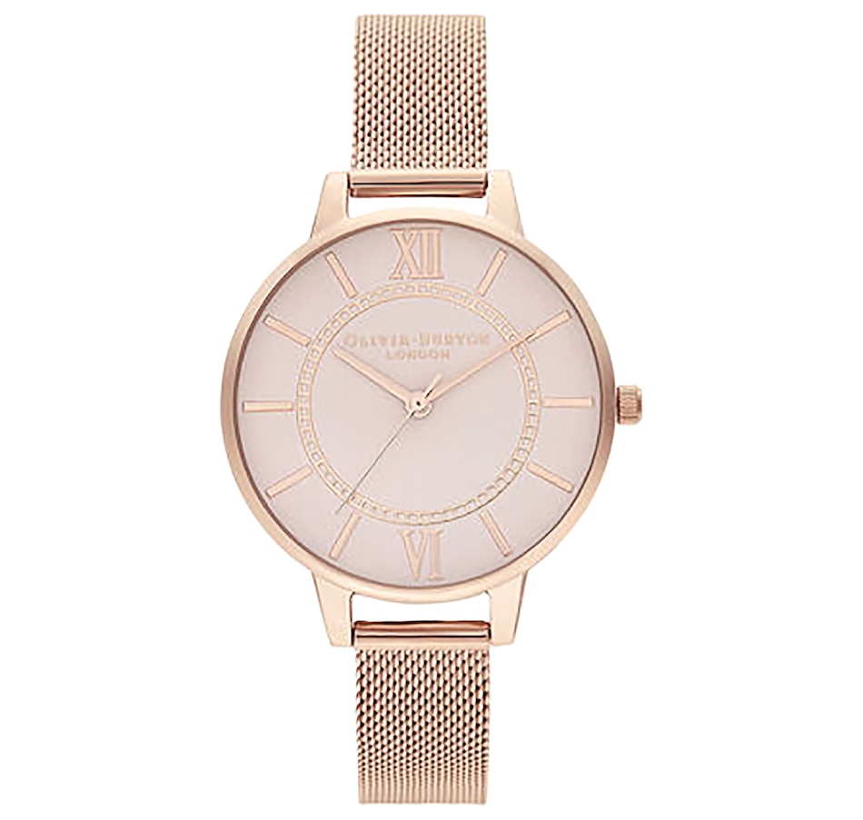 • Rose gold mesh strap, blush dial, rose gold case, stick and Roman numeral markers
