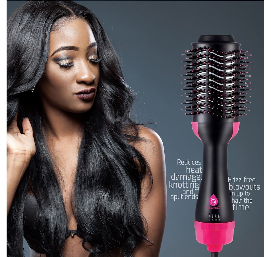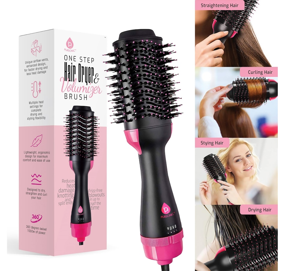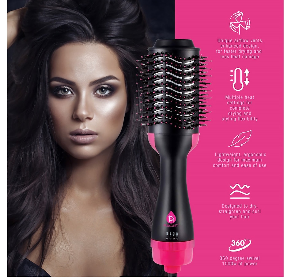 The Pursonic One Step Volumizing Hair Dryer is a hot air brush designed to deliver wonderful volume and brilliant shine in one step. Quick styling, great results for all hair types, check. A comfortable style experience. The lightweight design and soft-touch finish provide a relaxed grip. For voluminous blows, place the brush under the hair near the roots and roll out to the ends. To curl, place the hairbrush under the ends and hold or for 2-3 seconds before twisting. Reduces heat damage, knots and split endsFeaturesUnique air flow vent, improved design for faster drying and less heat damageNo frizz in up to half the time. Multiple heat settings for complete drying and styling flexibilityDelivers wonderful volume and brilliant shine in one stepLightweight and ergonomic design for maximum comfort and ease of useDesigned to dry, straighten and curl your hairIt rotates 360 degrees. 1000 W powerModel Number:Â TCA1900