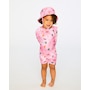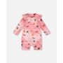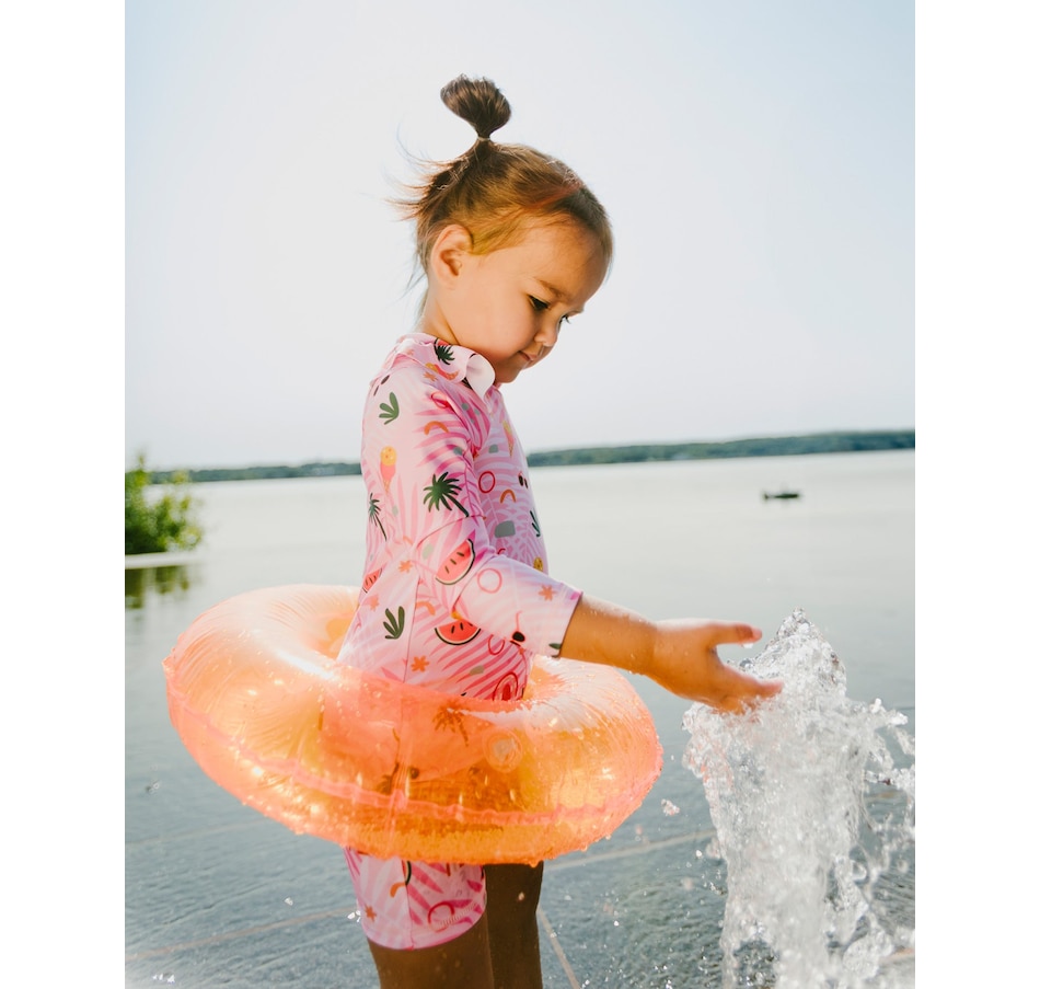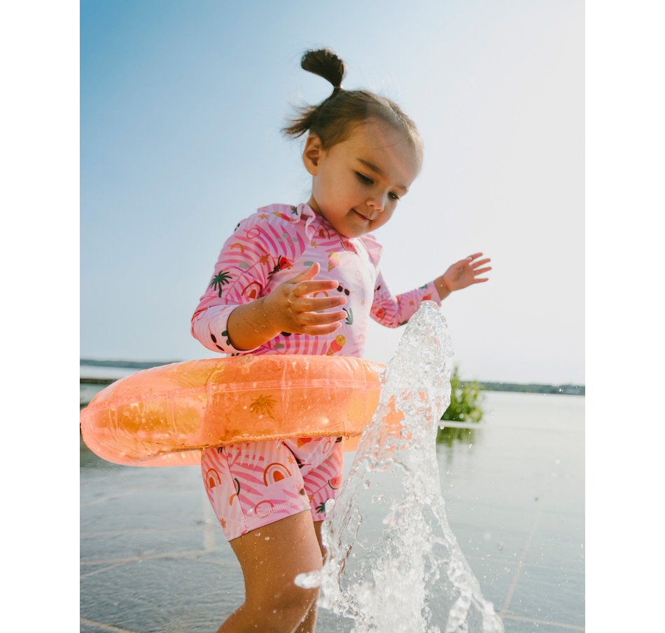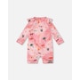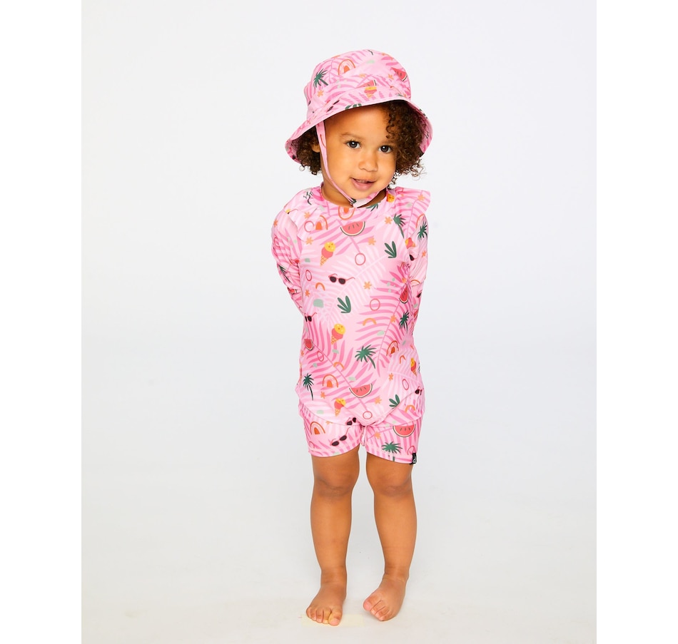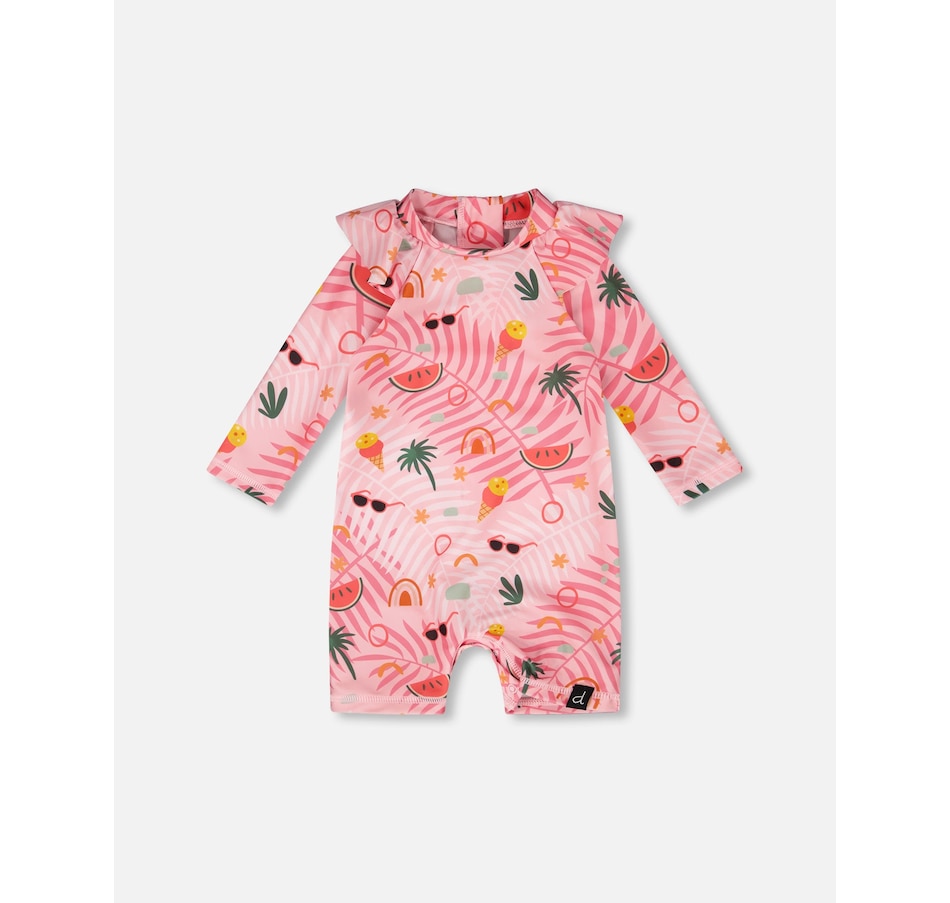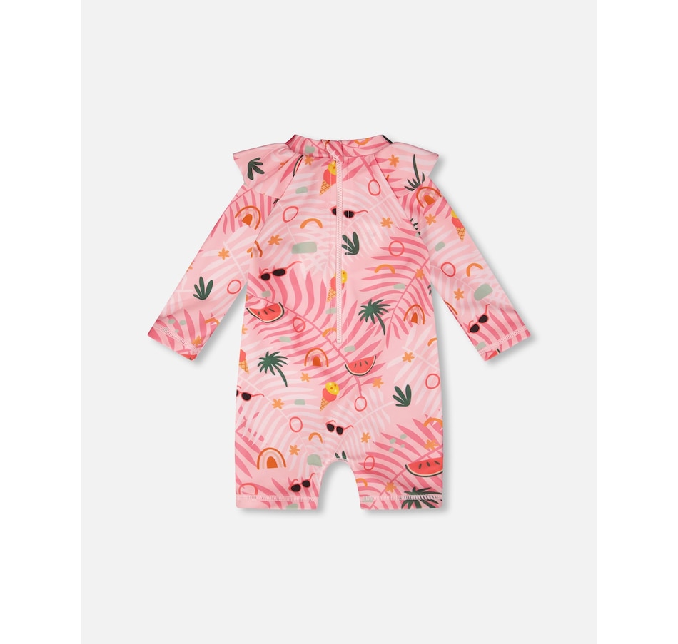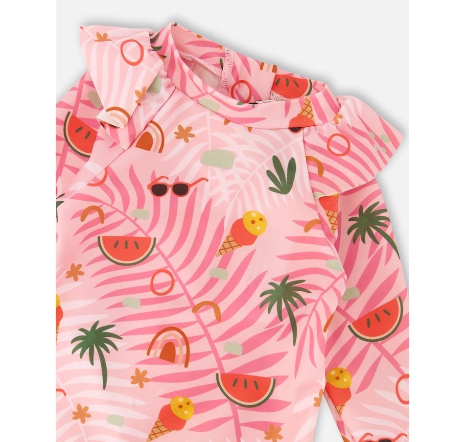 The baby and toddler one-piece long sleeve rashguard in pink with beach print is designed for sun-filled days at the beach or pool. This long-sleeve swimsuit features a vibrant beach print, playful ruffle details at the shoulders, a back zipper for easy dressing, and bottom snap closures for practicality. Crafted from recycled polyester with added stretch, it offers comfort and protection while splashing under the sun.