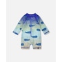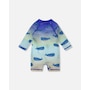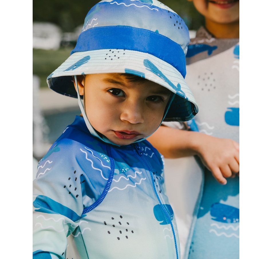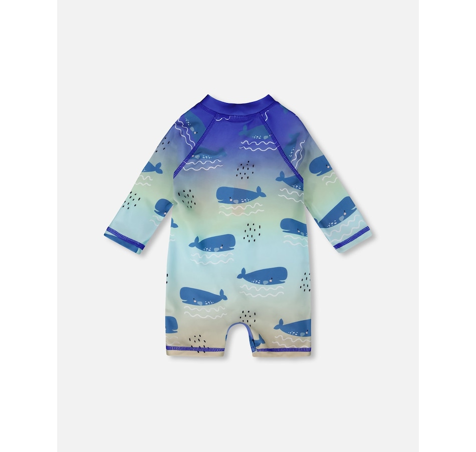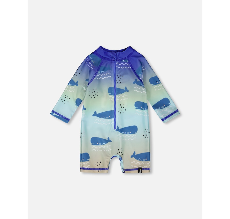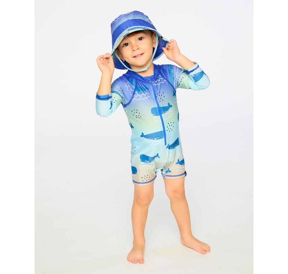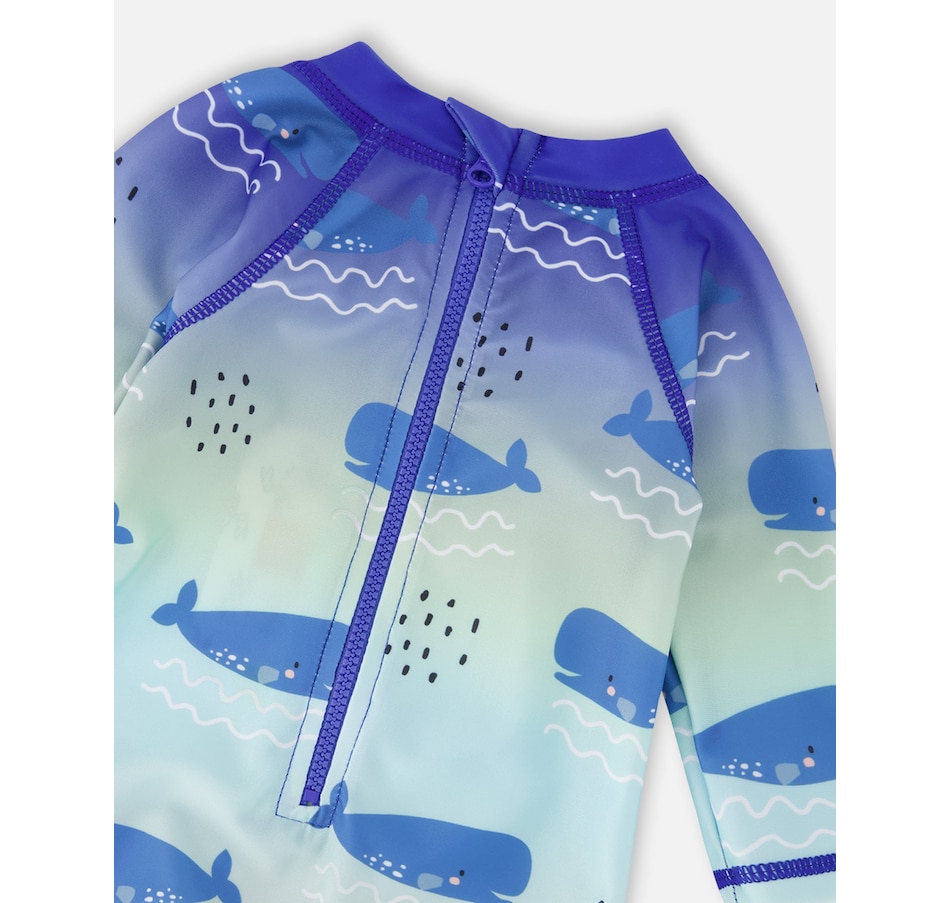 Our baby and toddler one-piece long sleeve rashguard in blue with whale print makes a splash in summer style. This one-piece swimsuit features long sleeves and a playful allover whale pattern in shades of blue, made from recycled polyester with added stretch for comfort and easy movement. A front zipper makes dressing simple while providing extra protection under the sun for boys and baby boys.