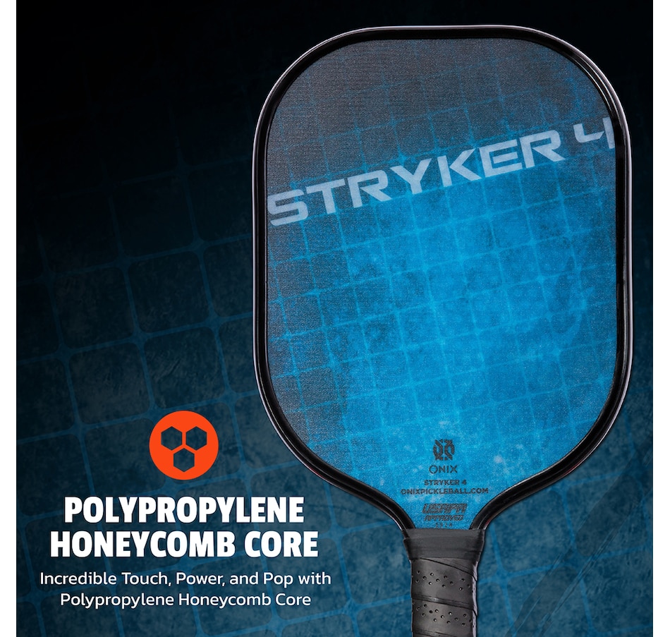Plan your attack with the Onix Stryker 4. This composite pickleball paddle gives its player the advantage by creating the perfect balance of both touch and power. The oversized shape offers a calculated and larger sweet spot that's perfect for beginner to intermediate players, the polypropylene core provides the Stryker's incredible touch at the net, and the paddle's graphite face fuels the power.