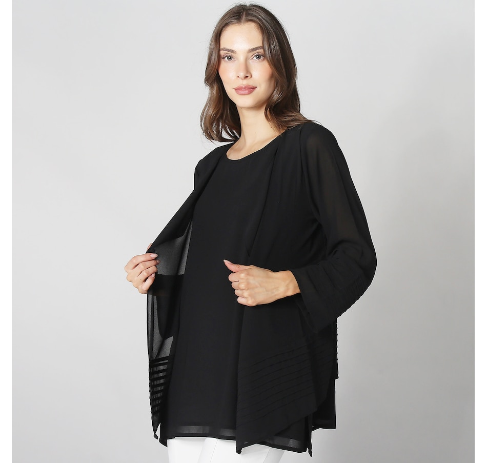 Available in a wide selection of fabulous colours, you're going to finish every look in easy style with this chiffon pleat detail open cardigan from Orange Fashion Village.