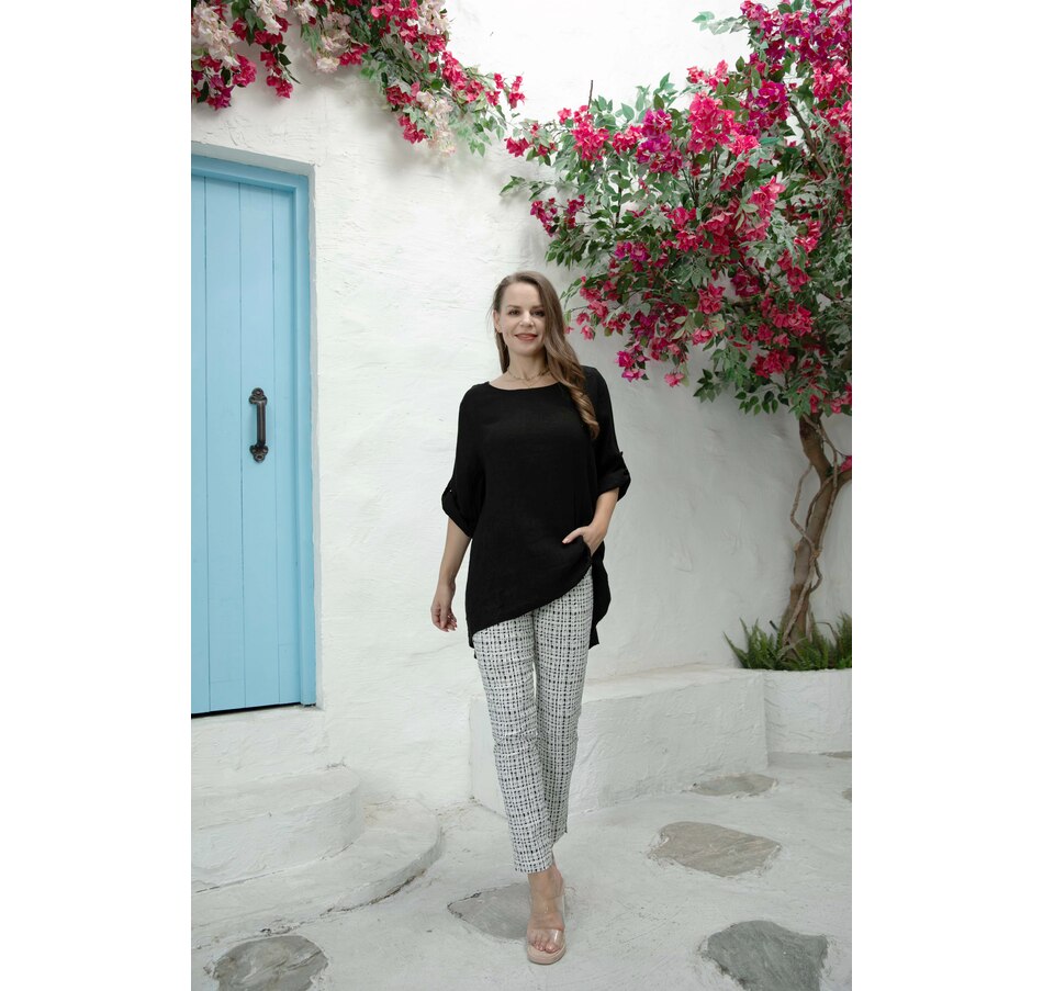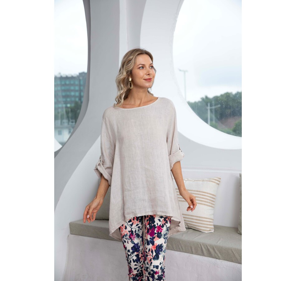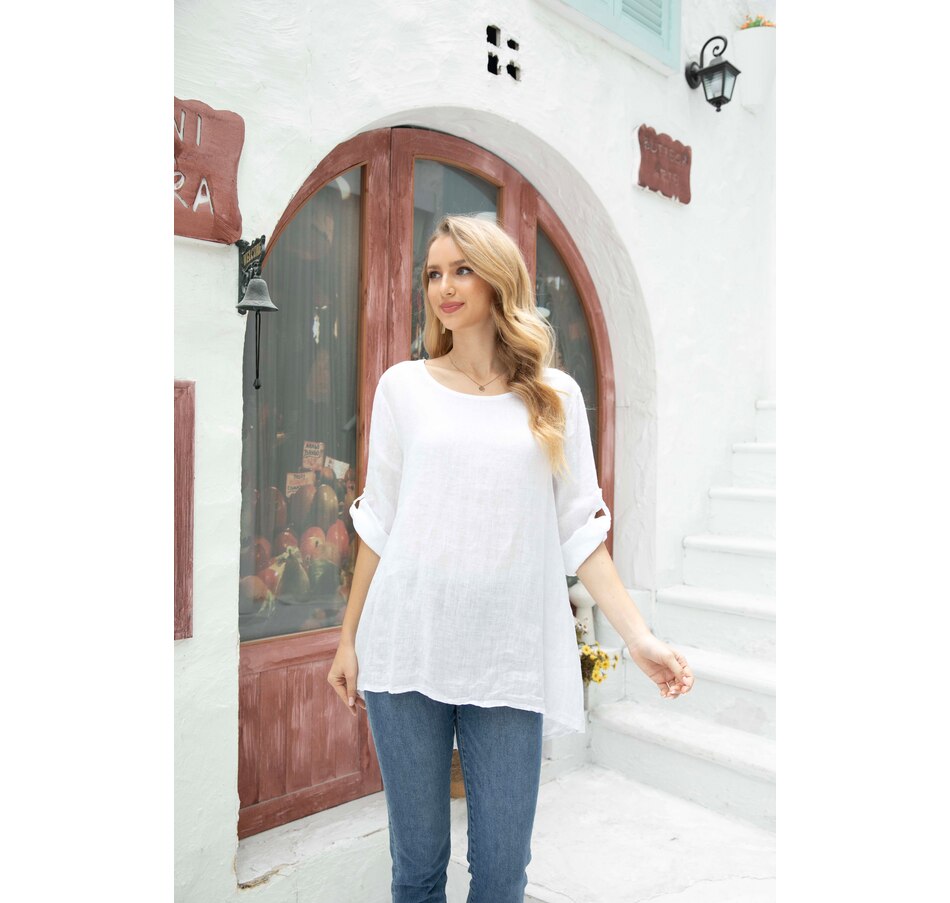 Linen Roll Tab Sleeve Tunic Blouse