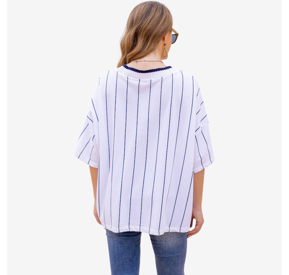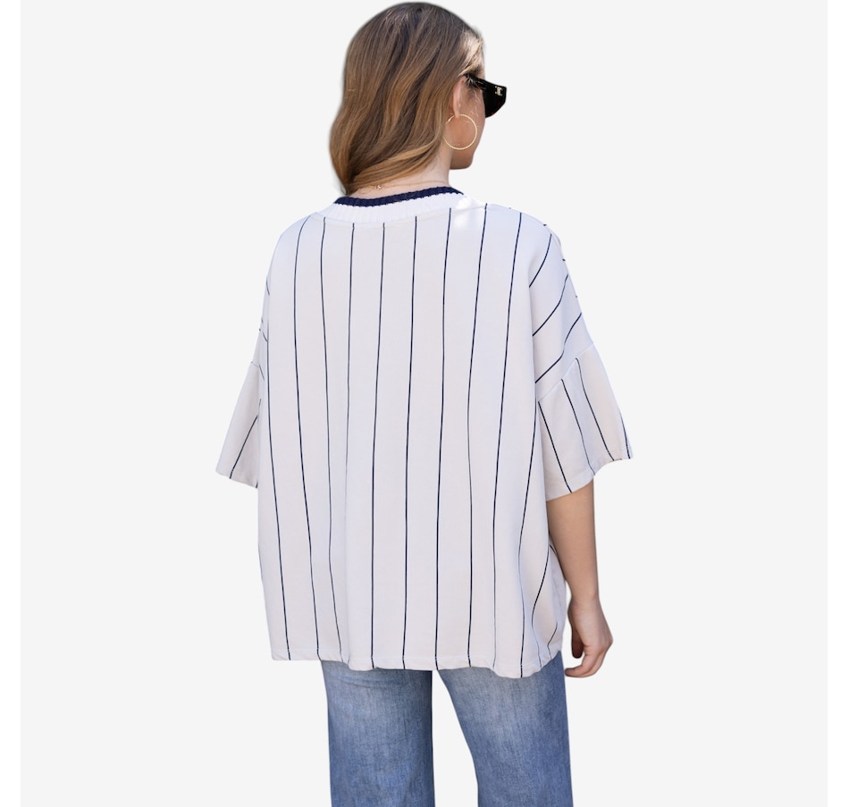 Add a touch of refined sporty elegance to your wardrobe with the Varsity shirt from Orange Fashion Village, a timeless piece that blends classic athletic inspiration with modern sophistication. The v‑neckline, framed by finely knit ribbed detailing, creates a polished, flattering silhouette, while the subtle striped accents elevate the look with a nod to vintage charm. Designed in a loose, easy‑wear fit, this top delivers all‑day comfort without compromising style.