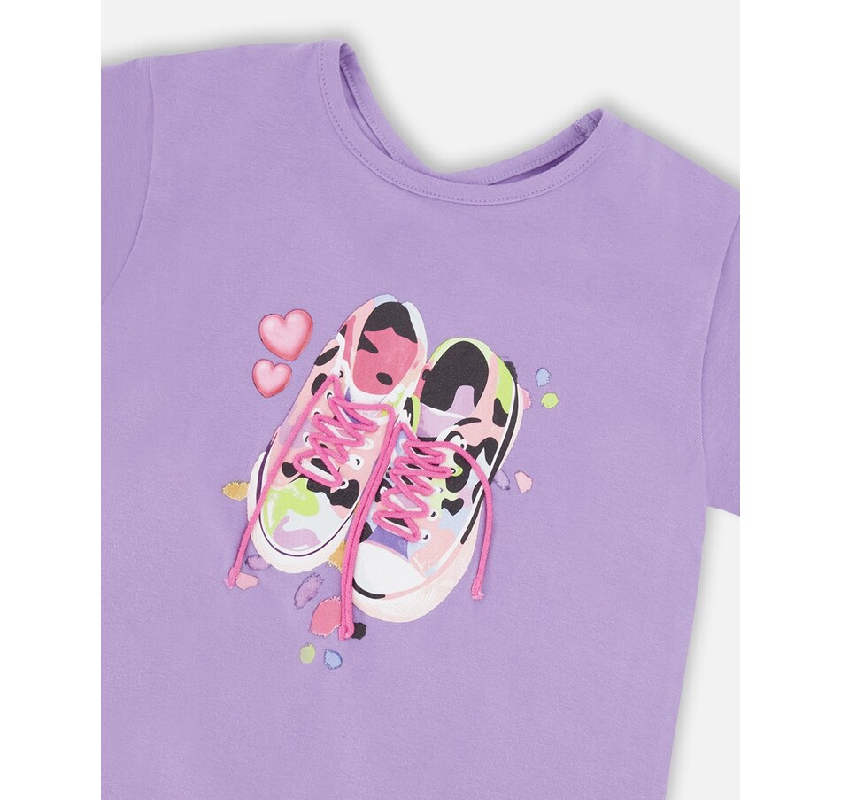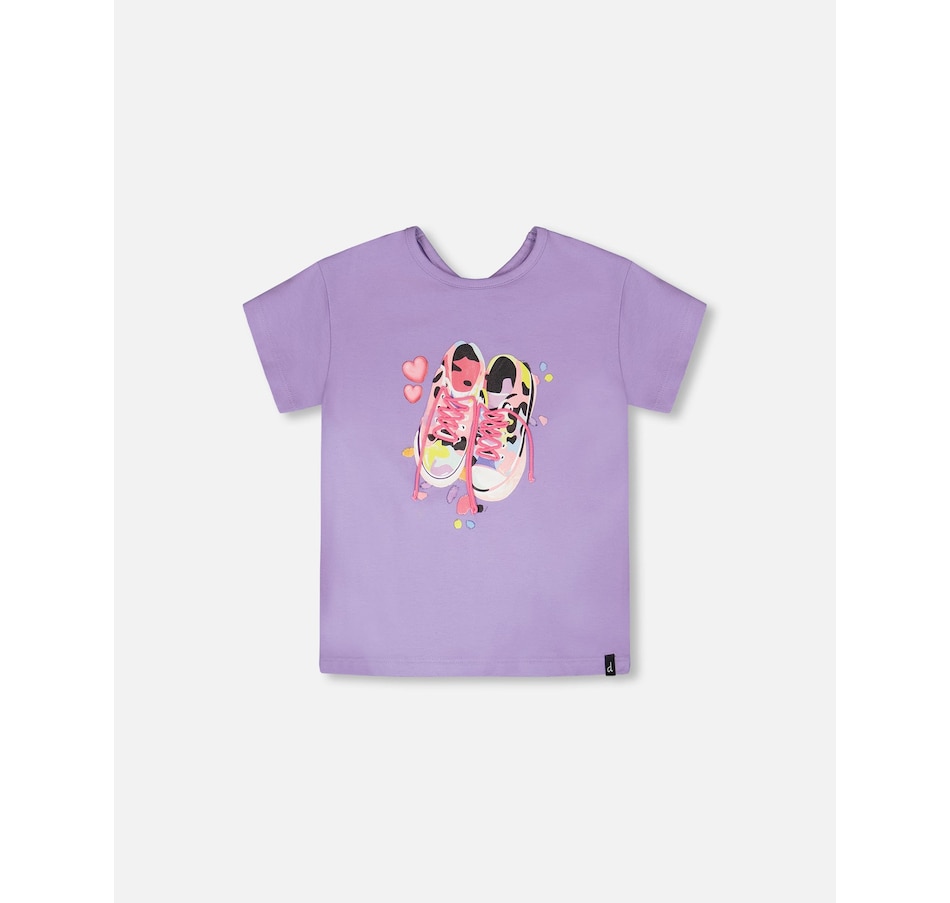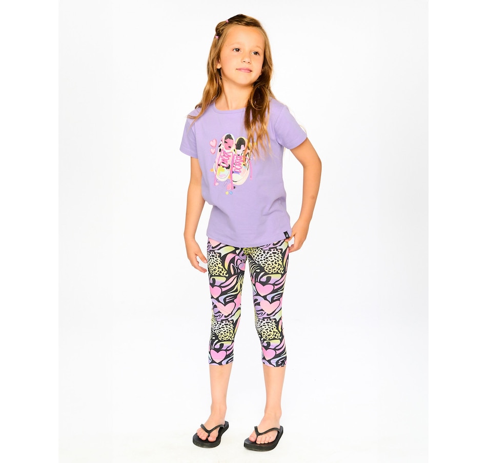 This organic cotton jersey t-shirt in mauve with sneakers is playful and full of charm. This top features a fun pair of colorful appliqué and print pair of sneakers with hearts, giving it a lively and cheerful style. Made from soft organic cotton with a touch of stretch, it ensures all-day comfort and pairs effortlessly with our bottoms from the “Wild Heart” collection.
