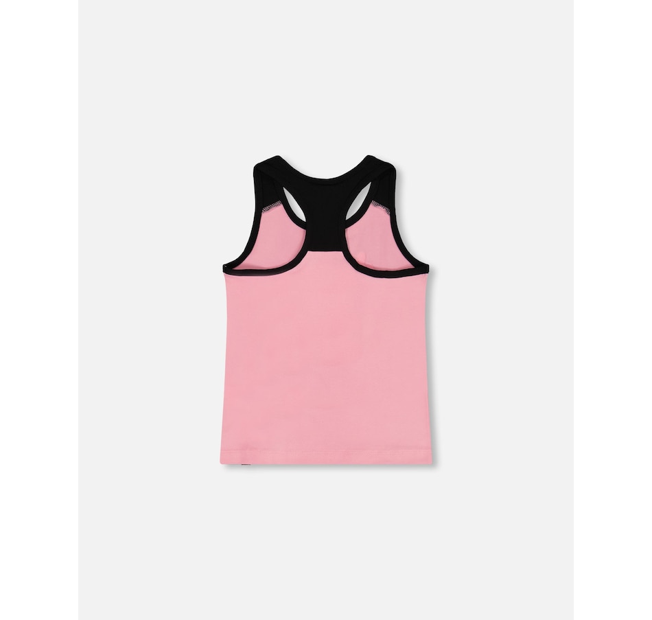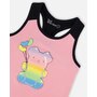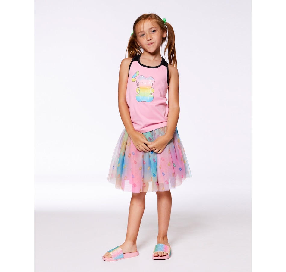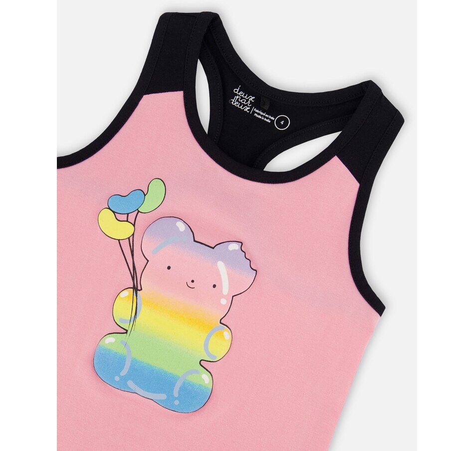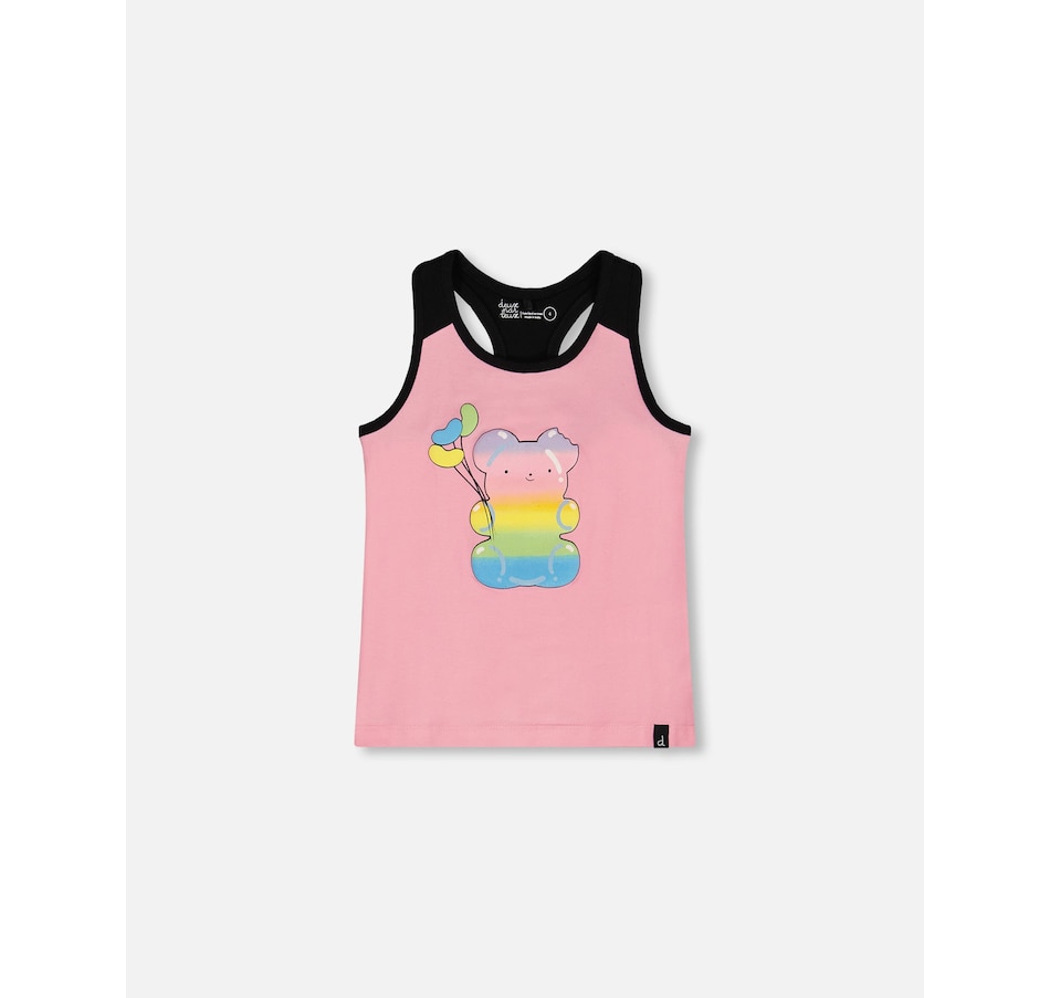 Sporty meets sweet in our Organic Cotton Racerback Tank Top Candy Pink and Black. Perfect for any day of play, this two-tone tank features wide straps, a contrast racerback, a scoop neckline, and contrast binding. A multicolor gummy bear print on the chest makes it perfect for pairing with any bottom in our Candy Lane collection!
