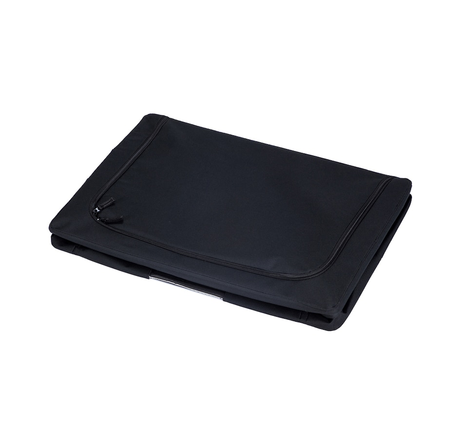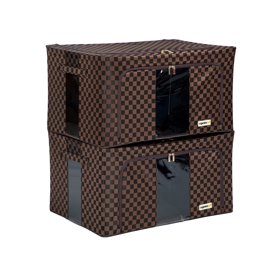 • Composition: plastic zipper with metal zipper pull, reinforced stitched side handles, PVC window, steel metal support bars and frame, MDF base support. Woven jacquard with PVC lining (brown checker); 600 denier polyester with PVC lining (printed and solid colours)