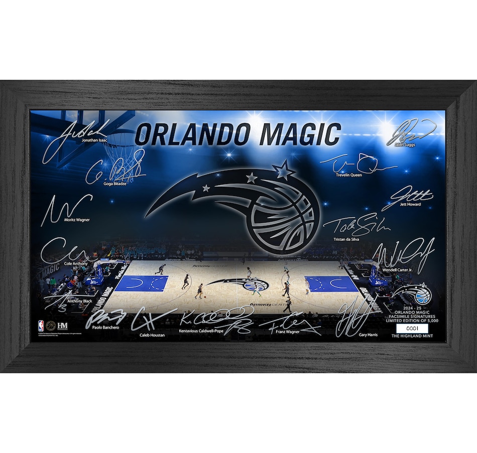 This Signature Court print features facsimile signatures of the Orlando Magic roster displayed around their home court. Each print is hand-numbered and comes in a 12" x 20" wooden frame with an acrylic glass front panel.