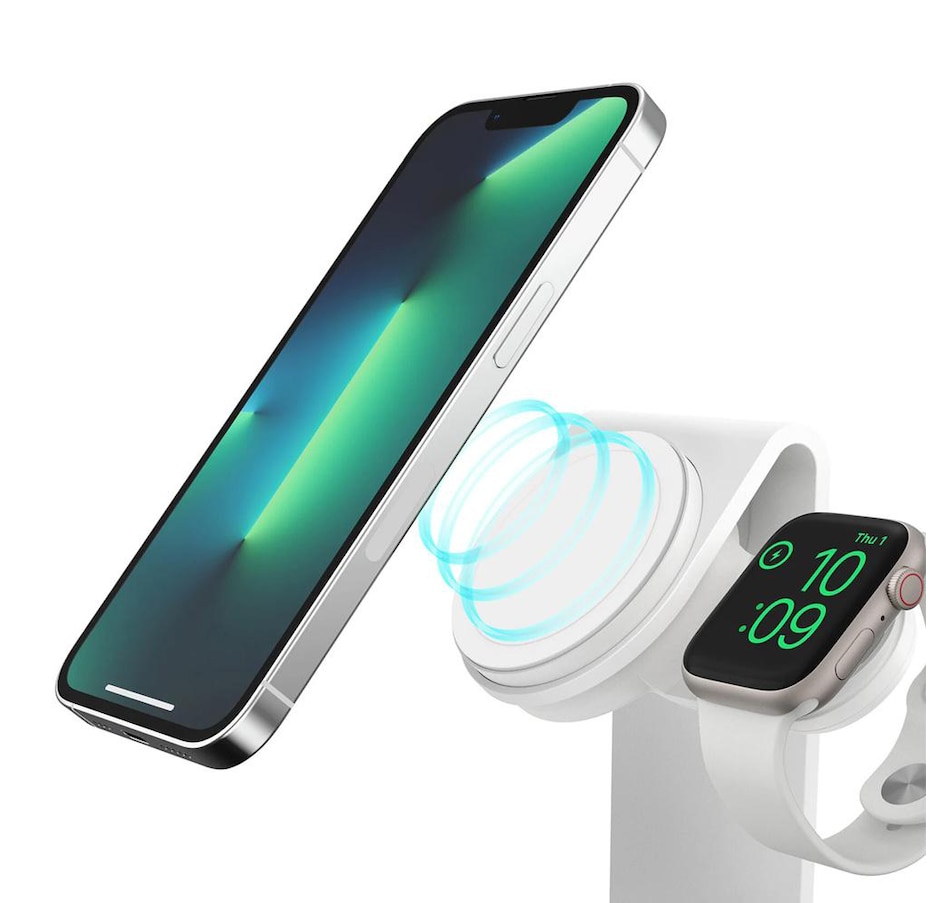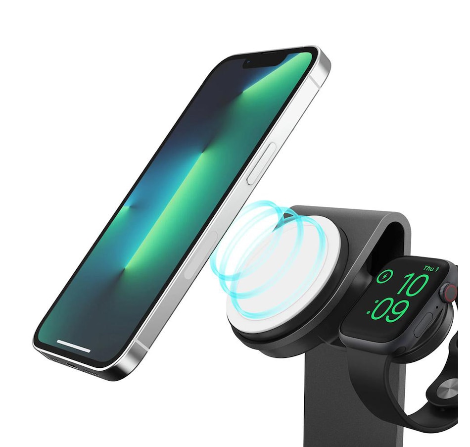 This premium, sleek, magnetic wireless MagSafe charger station can hold and power the iPhone, AirPods and Apple Watch for one-stop charging.