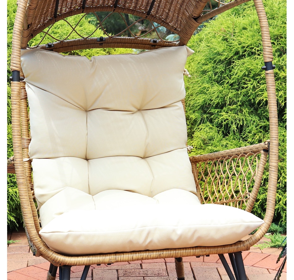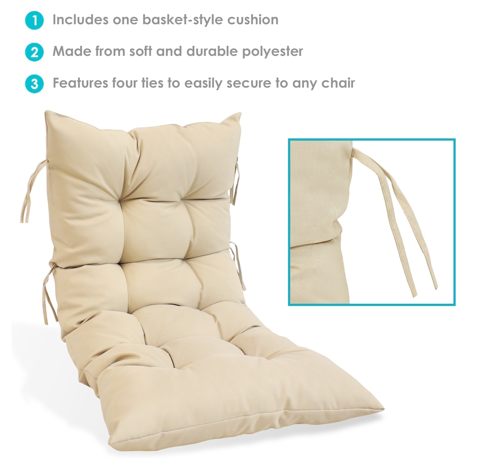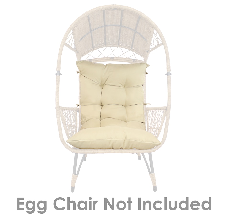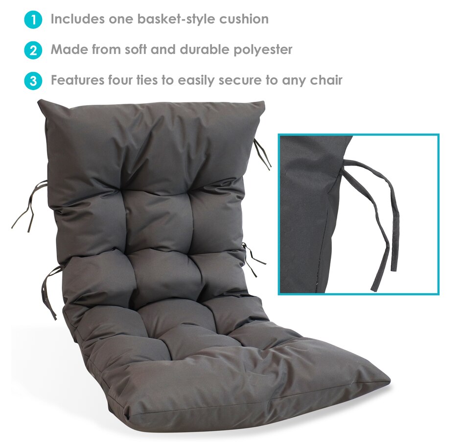 Create a cozy place to relax with this plush and stylish basket chair cushion. Adding a new cushion is a simple way to give an old chair a fresh, new look. This seat cushion is made from durable yet comfortable polyester cover with a soft polypropylene fill. Designed for outdoor use, this cushion will add a pop of color to the patio, backyard, deck, or front porch. This cushion is available in classic gray or beige to complement a wide variety of decor, furniture, and color styles. This sophisticated, one-piece cushion is easy to secure to a chair. Simply use the four 7-inch long fabric ties attached to the body of the cushion to tie it to an egg or basket chair (please note, a patio chair is not included with purchase). To clean any stains, spot clean with warm water and a mild detergent.