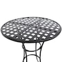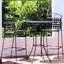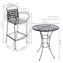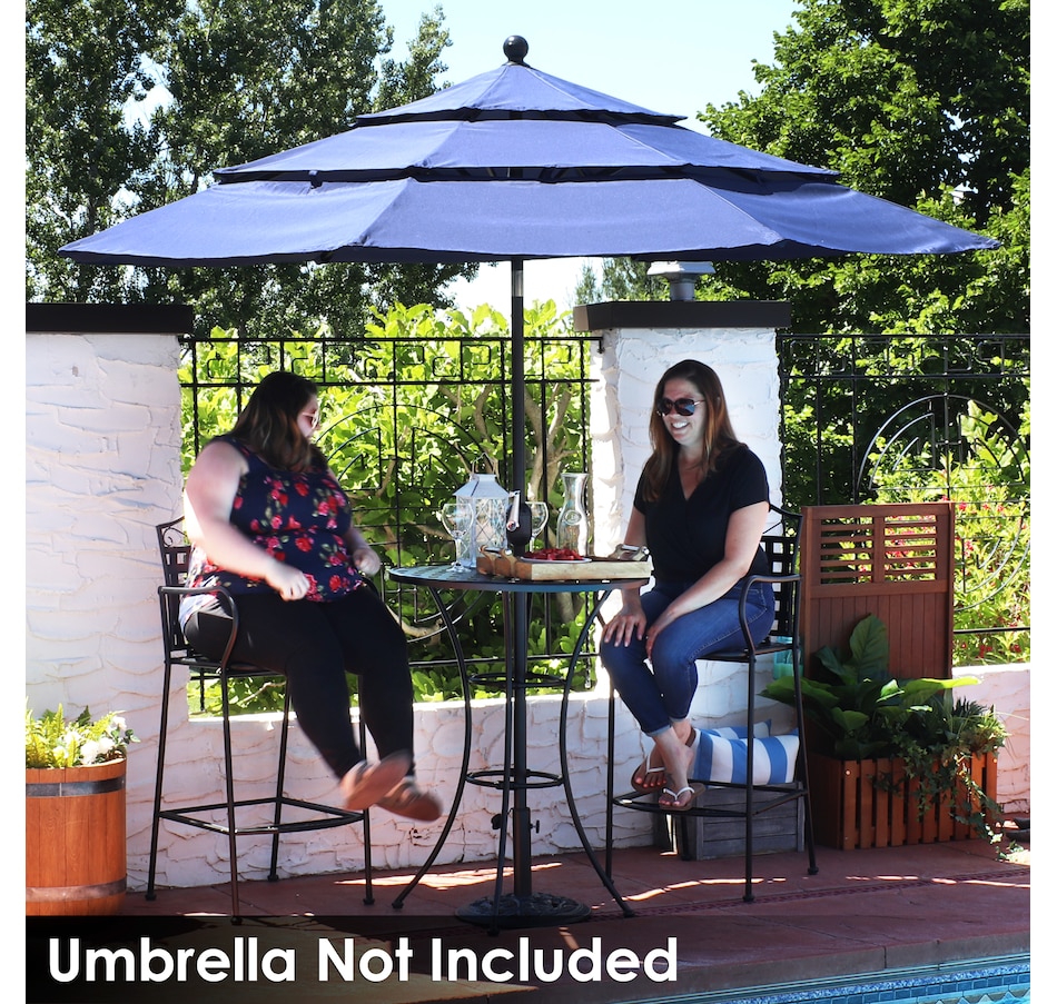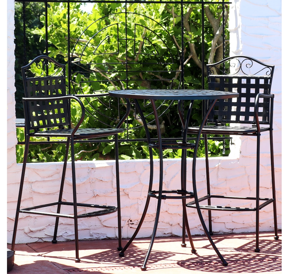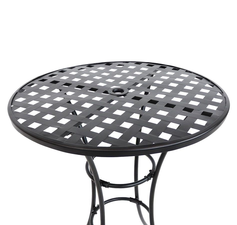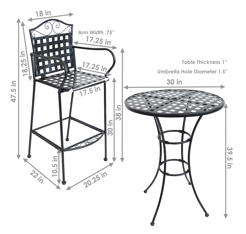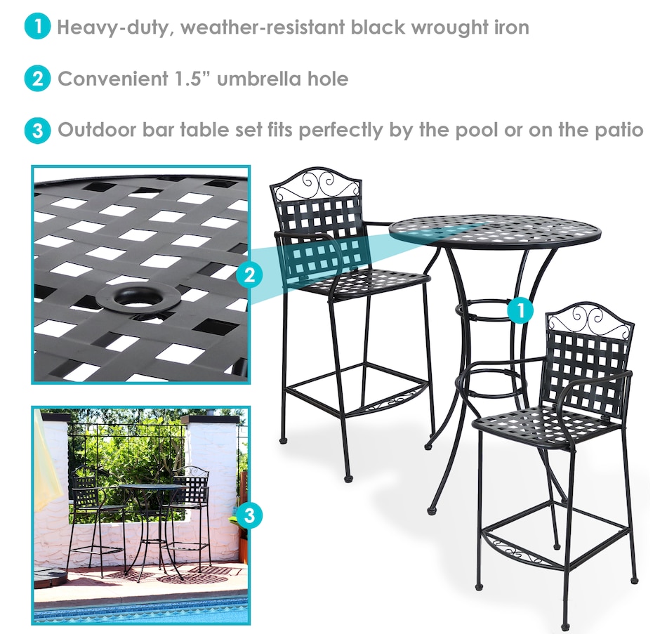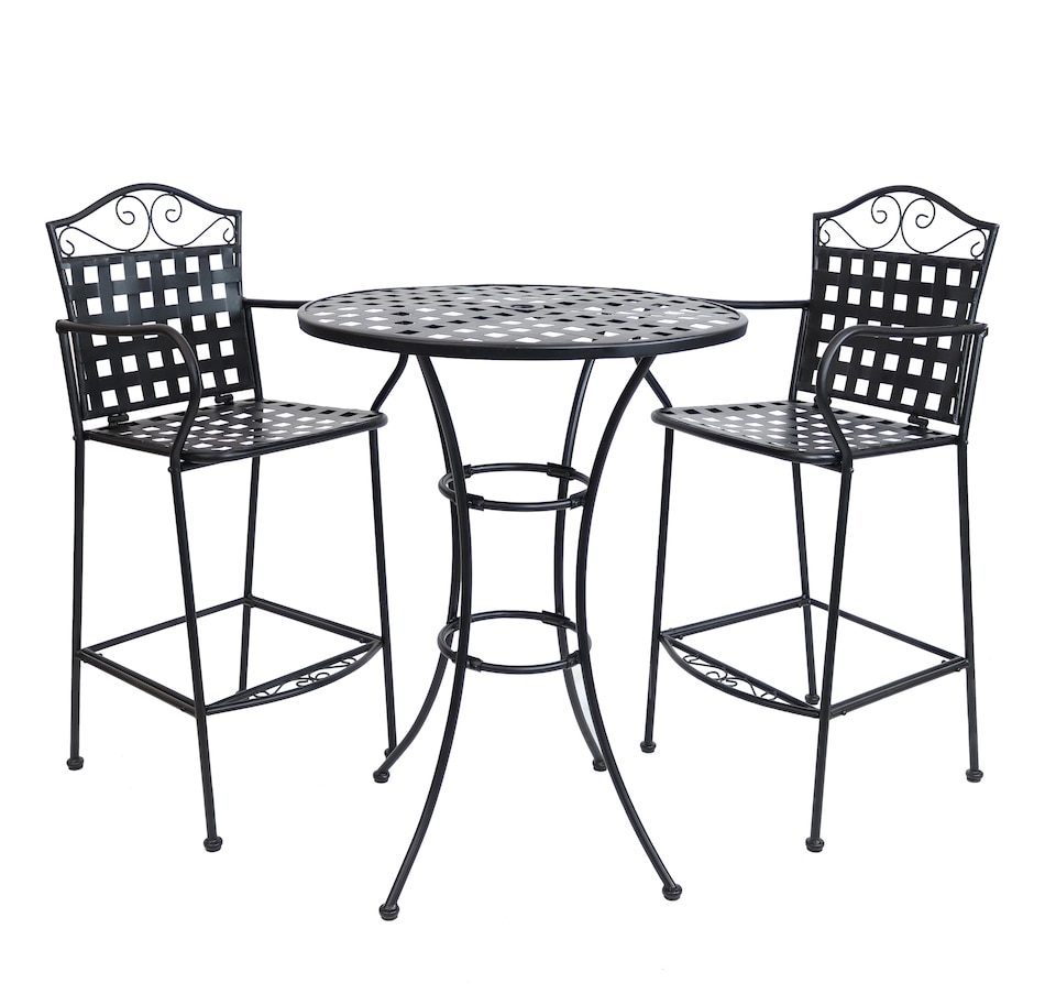 Enjoy outdoor dining during events or small get togethers all summer long with this elegant round black wrought iron bar table and outdoor black scrolling wrought iron bar chair set. This elegant table and chair set features slender, strong legs and a classic black finish for a refined look that is sure to complement your deck, porch or yard. This high table and high chair set is made from heavy wrought iron for a weather-resistant design that is sure to last season after season. Plus, the table features a convenient umbrella hole so you can enjoy cool shade as you dine (please note, an umbrella not included). This outdoor table and chair set has extra height, so it is sure to complement your tiki or patio bar with ease. Place this set in your garden for a beautiful, functional feature, place in your yard when guests are oven for a convenient place to set out snacks and rest, or place this table and chairs on your patio to set up a beautiful bar area.