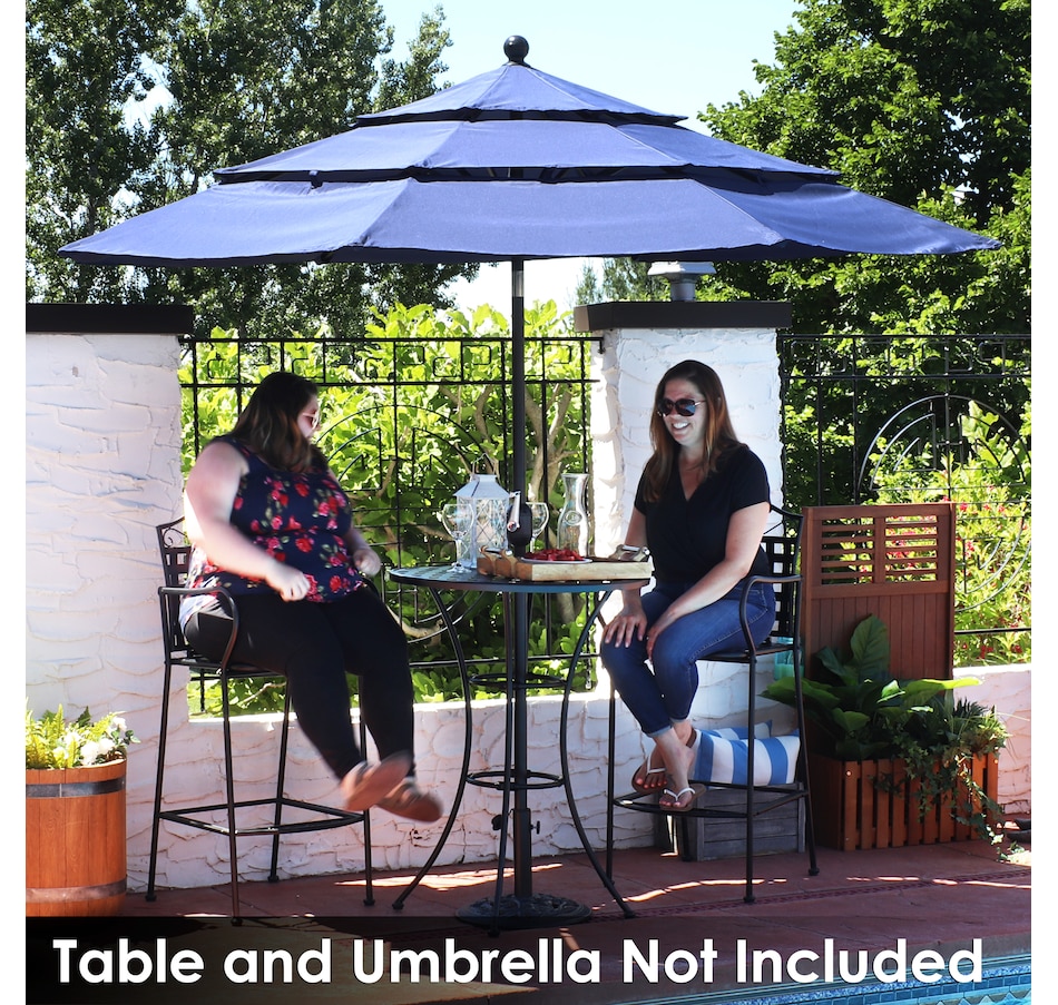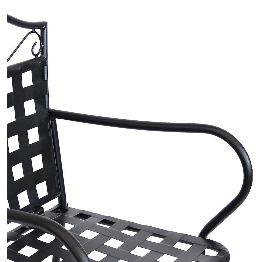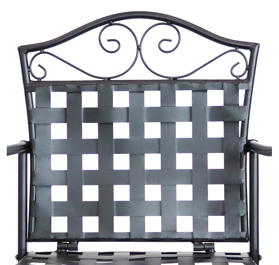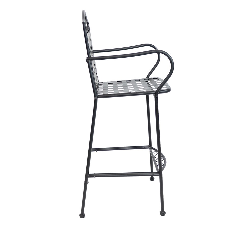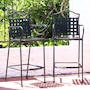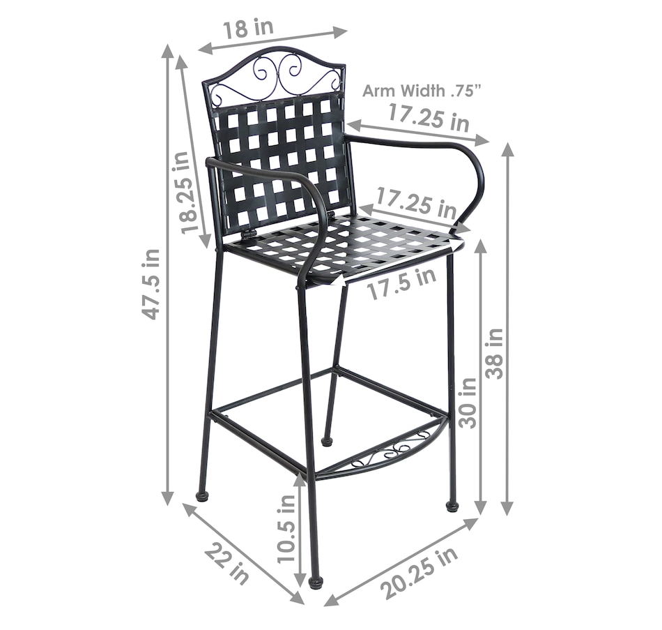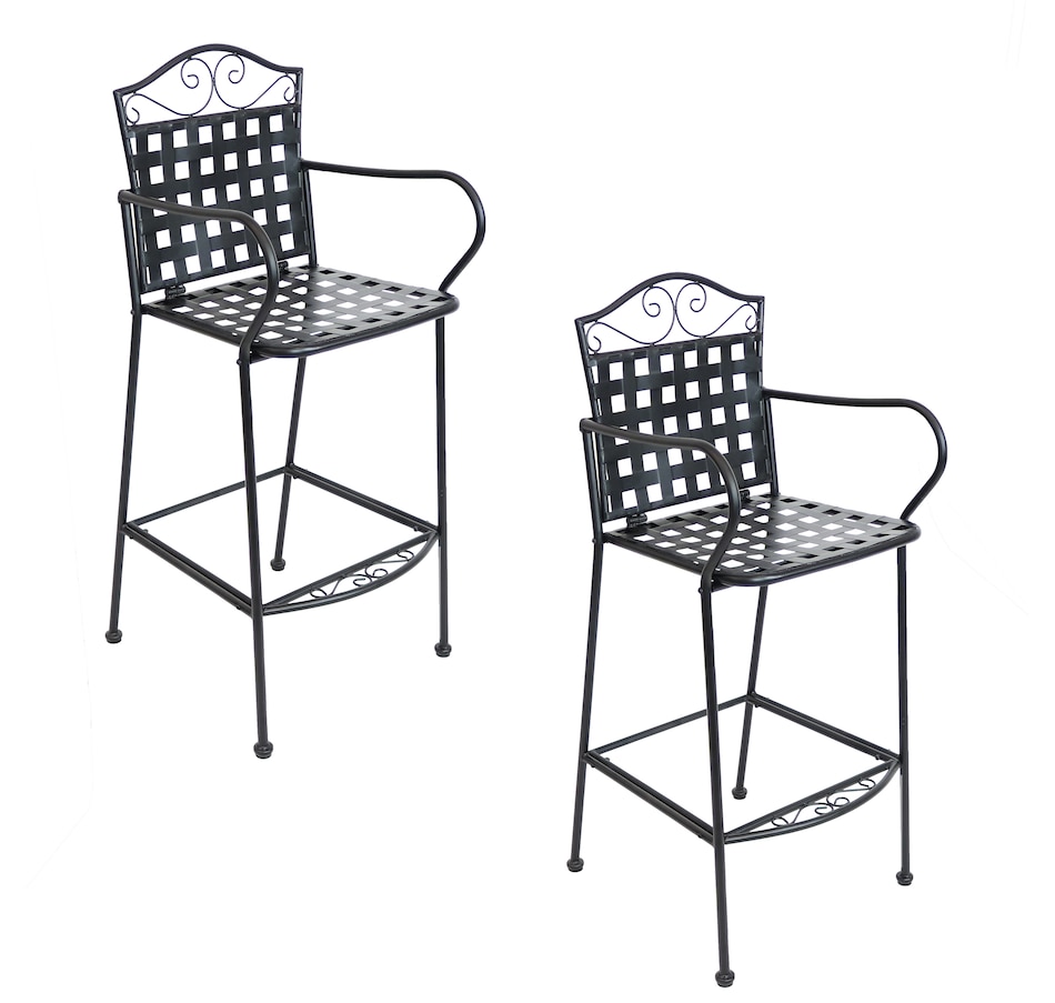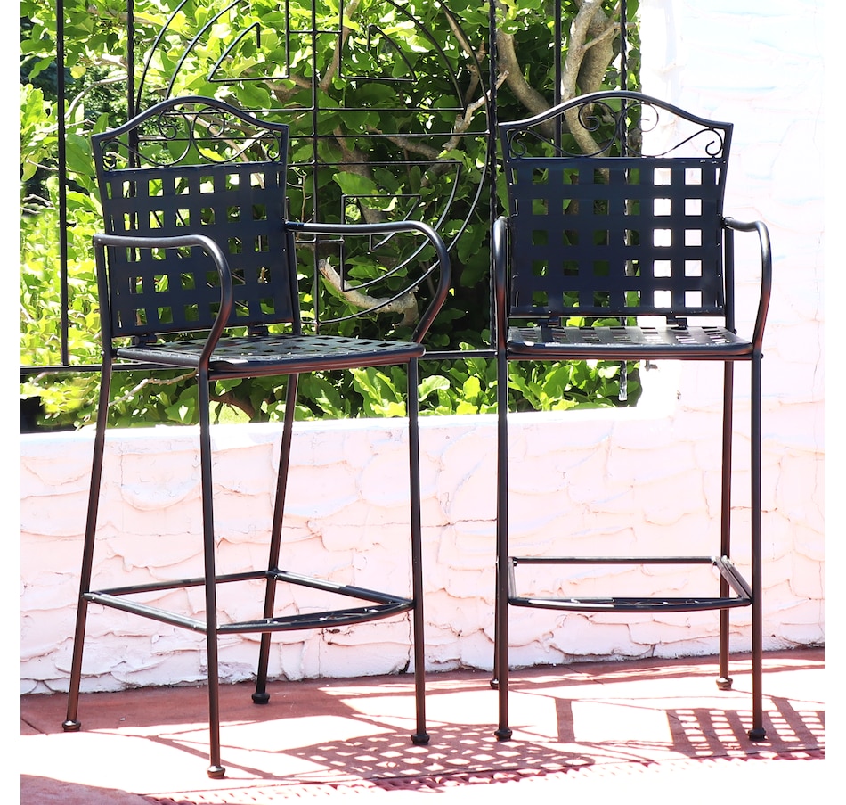 Great for dining at a high-top table, relaxing at a patio bar, or adding chairs to family and friend events, these stylish black scrolling wrought iron outdoor bar height chairs will add a touch of elegance to any space. At 47.5 inches tall, these patio chairs are made from durable wrought iron for dependable construction and a classic black finish that will complement any decor. This set of two chairs features a unique scrolling design and lattice-style backs for sophisticated look. These high bar chairs are perfect for outdoor entertaining on the patio, deck or in the garden. Place these chairs in your garden for a beautiful, functional place to rest and revel in the fresh air, place in your yard when guests are oven for a convenient place to sit and eat snacks, or place these chairs on your patio to set up the beautiful bar area you have always wanted.