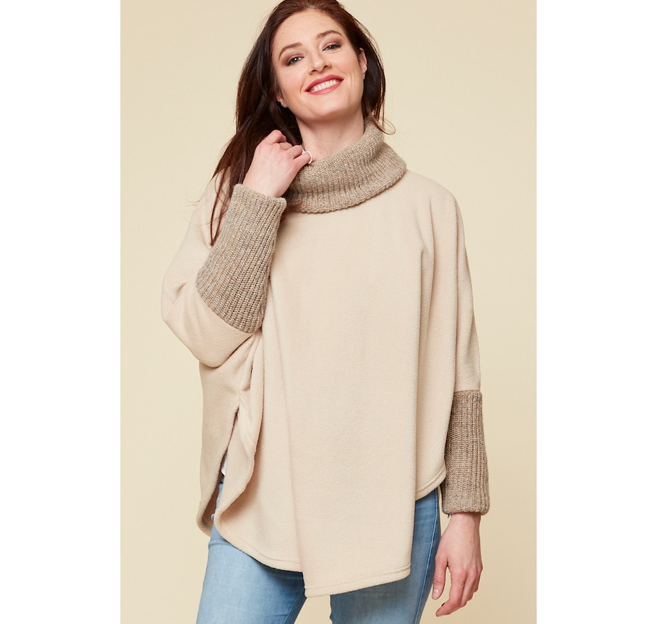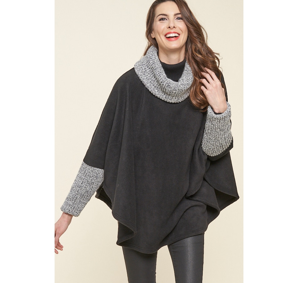 This one-size poncho has the versatility to be worn casually and dressy. Made with thick cozy polar fleece and a ribbed sweater knit soft drape neck. The sweater knit sleeve accents keep the chill away and is sure to keep you warm.