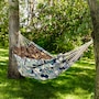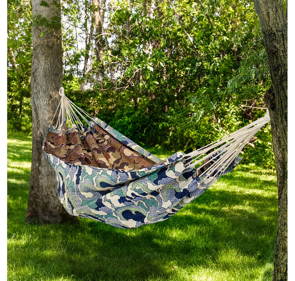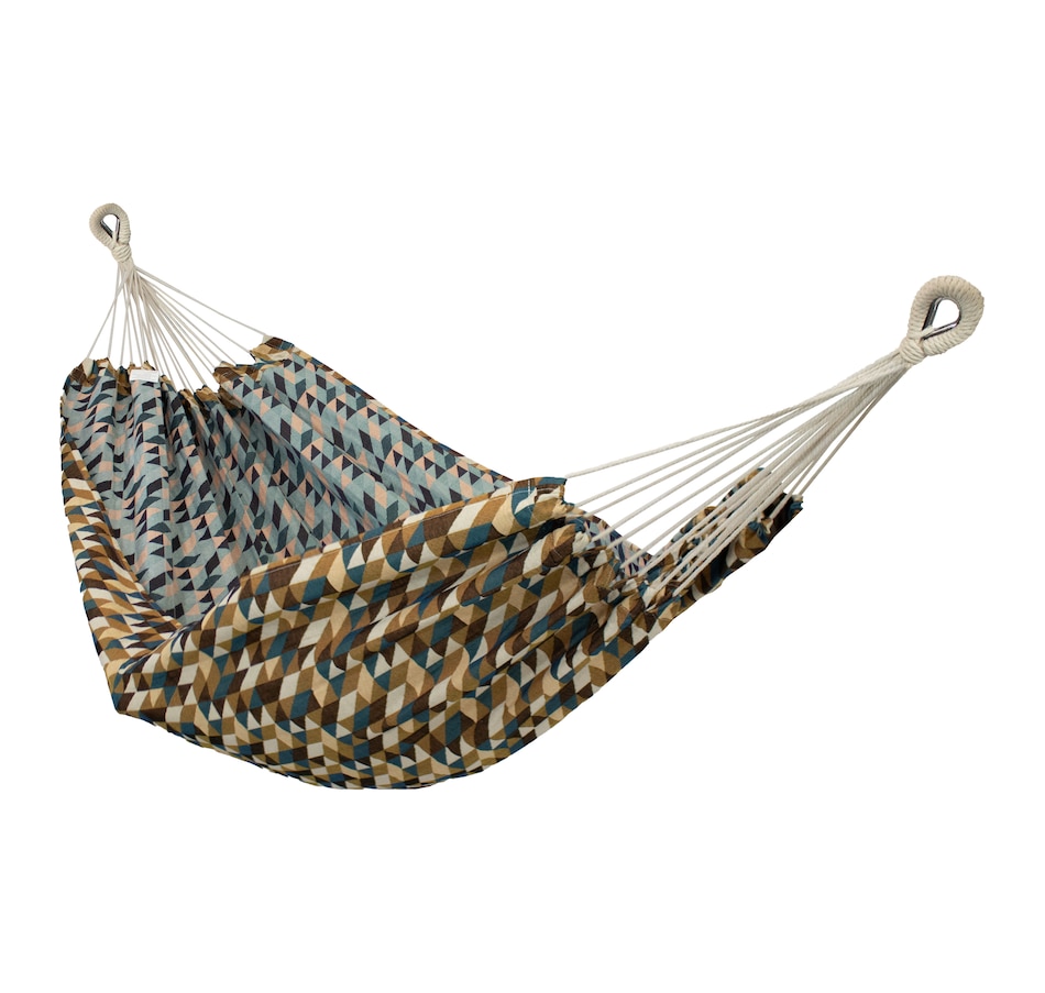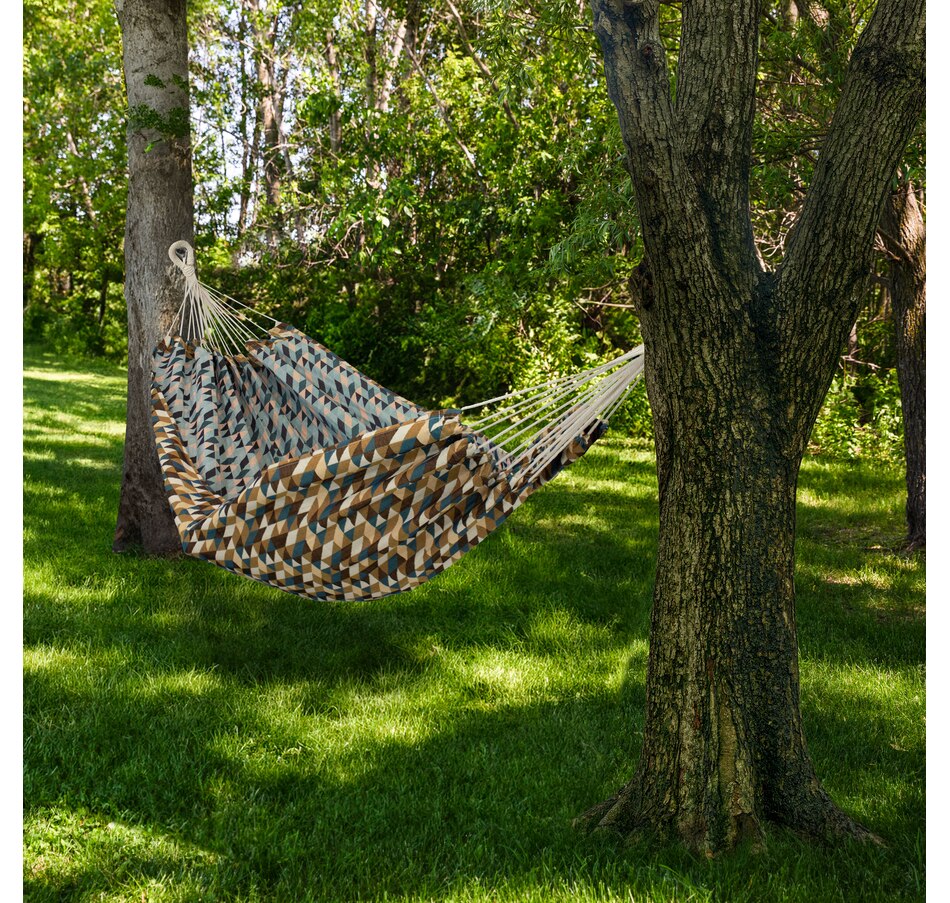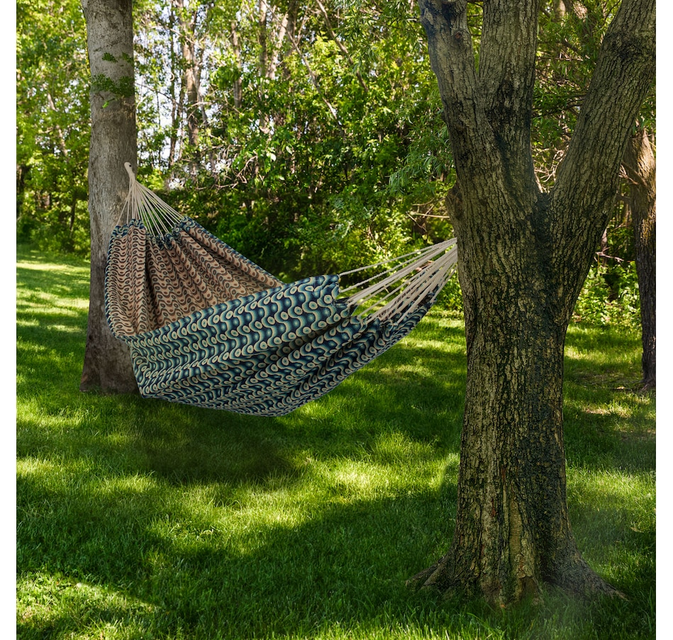 Create the ultimate outdoor oasis on the patio, deck, or porch by adding a jacquard hammock! Crafted from a luxurious blend of polyester and cotton, this patio hammock balances softness and strength. The fabric is durable enough to withstand outdoor use, but it is recommended to bring it indoors to help prevent fading over time. Designed to accommodate two people, this hammock provides ample room for lounging with a loved one or simply stretching out alone to unwind under the open sky. And with a robust 450 lb weight capacity, this hammock offers peace of mind and stability with every sway. Whether enjoying a lazy afternoon in the backyard or embarking on a camping adventure, this hammock is the companion for all outdoor escapades. Not only is the hammock comfortable, but it also is sure to make a statement in any space. The vibrant print of the fabric adds a pop of personality too.