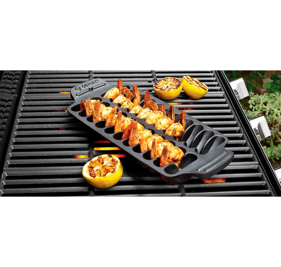 Cook shrimp on the grill in a new and exciting way! Outset's cast iron shrimp pan cooks 22 jumbo shrimp in a pool of flavor and prevents food from getting lost between grill grates. This pan also doubles as a creative way to serve shrimp cocktail. From grill top to tabletop, this pan is designed to impress. Even though the pan comes pre-seasoned, applying a little vegetable oil before use helps prevent food from sticking.