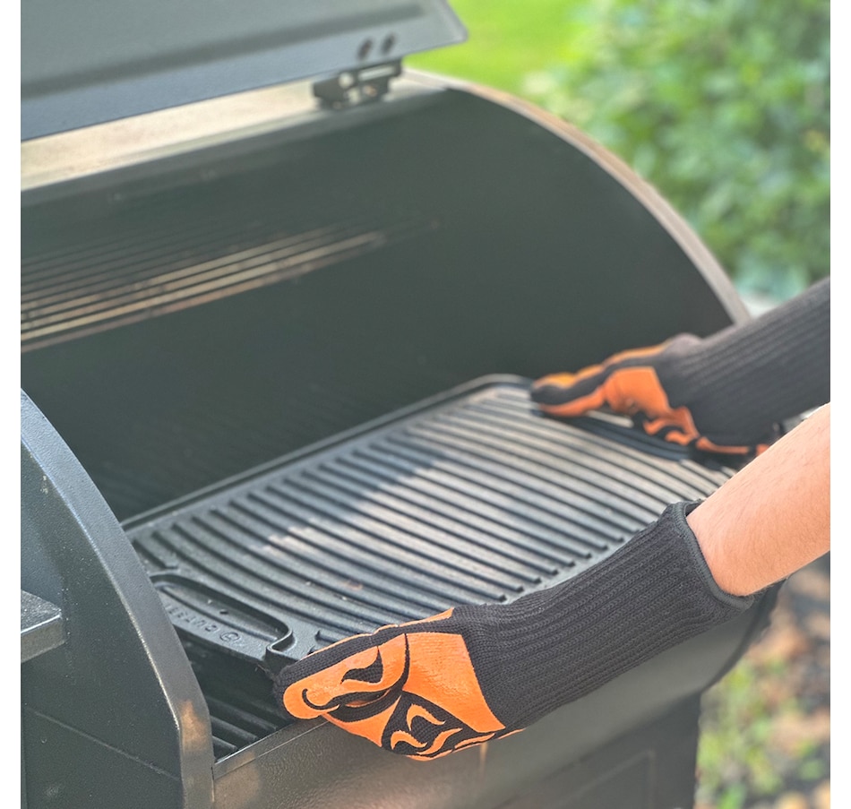 Safety and flavour go hand in hand when grilling, so make sure you have the right grilling glove. The Professional High Temperature Grill Glove has a variety of features included to enhance its use. Designed with maximum dexterity in mind, this glove is made from heat and flame resistant Aramid fibres and a silky bamboo viscose lining specially designed to stay in the shell. The glove also features a dual-sided silicone grip for both right and left handed use, and an easy-on split cuff for wrist and forearm protection. The glove is heat resistant up to 475°F or 246°C. The meta-aramid shell and the silicone print is flame retardant.