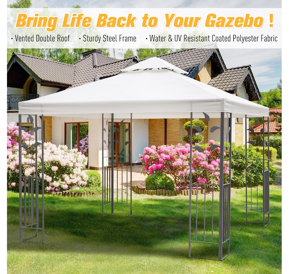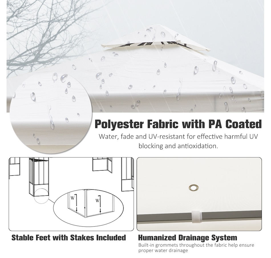 • Decorative frame supports in an ornate style; • Light polyester fabric material ensures a cool and comfortable feel; • Canopy top is water-resistant with 8 drainage holes to prevent weather damage; • Powder-coated steel frame resists rust while providing stability; • 8 ground stakes are included to ensure your gazebo is extra secure;• Assembly is required; Note:Gazebo is not a permanent structure and it's not guaranteed to against heavy rain, snow or windsSpecifications: