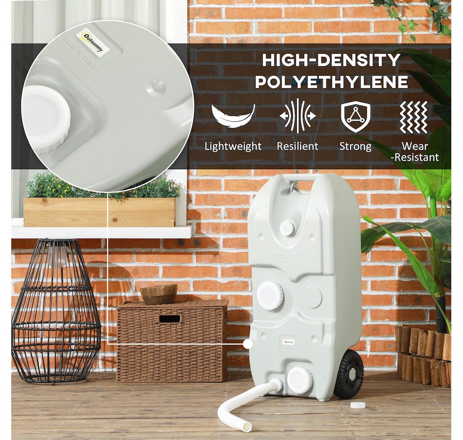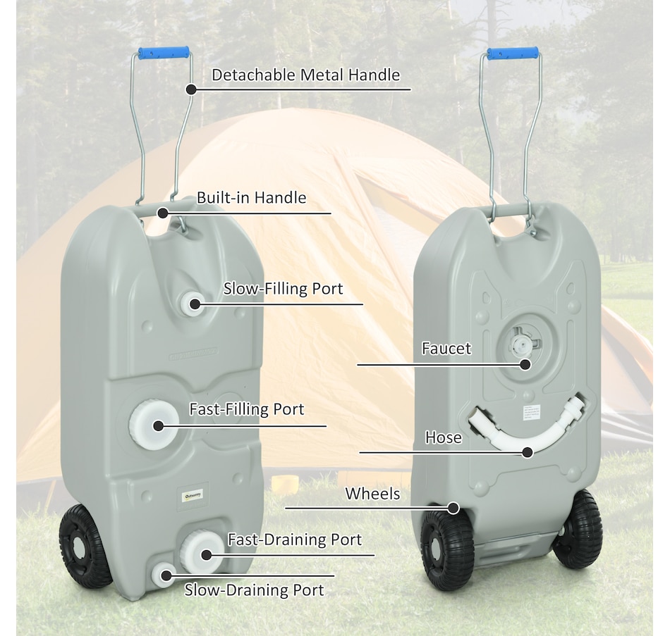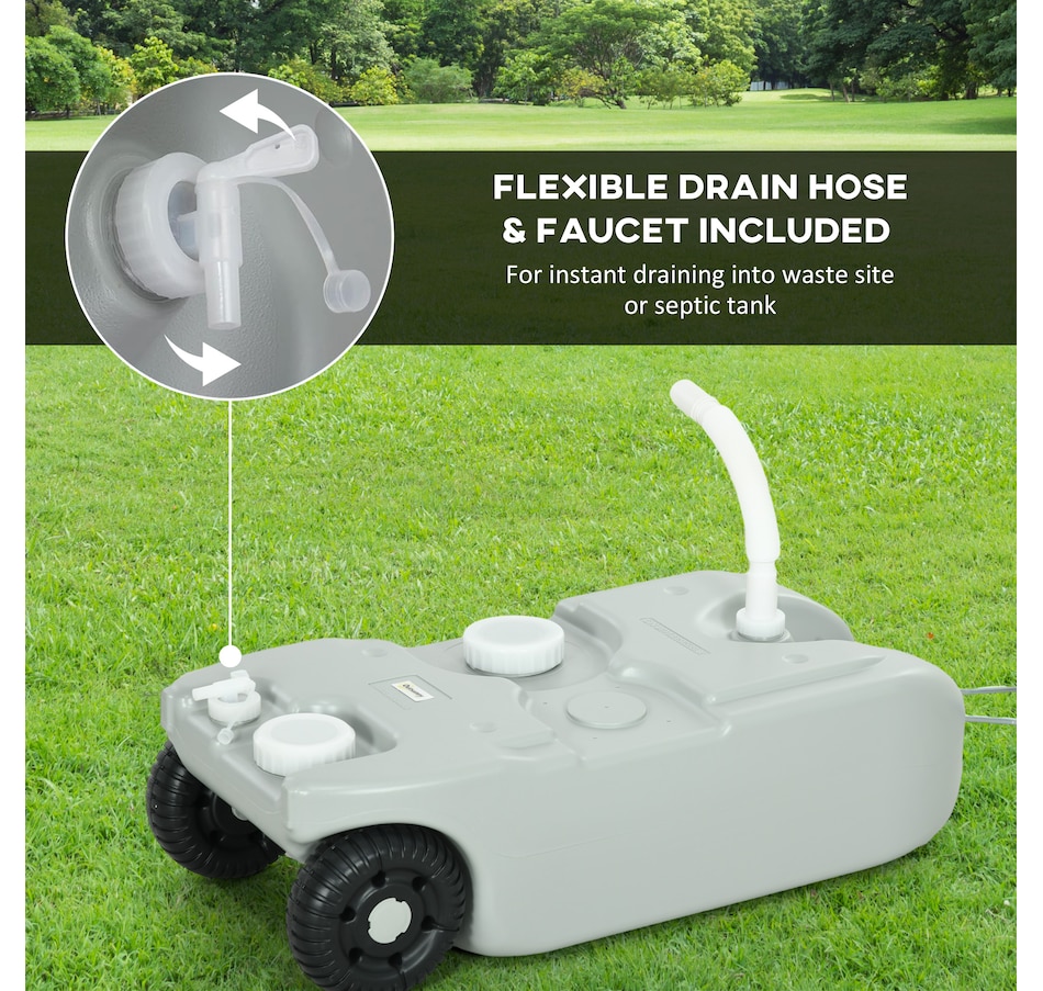 Embark on a worry-free and enjoyable journey with the Oursunny portable rv waste tank. Say goodbye to concerns about unpleasant waste issues. Designed with a generous 10.6 gallon (40 L) capacity, this universally compatible wheeler offers exceptional portability for campers, trailers, buses and recreational vehicles. Effortlessly redirect waste through two draining ports, ensuring a seamless and odor-free experience. A hose and a faucet, great for flexible filling and drainage.
