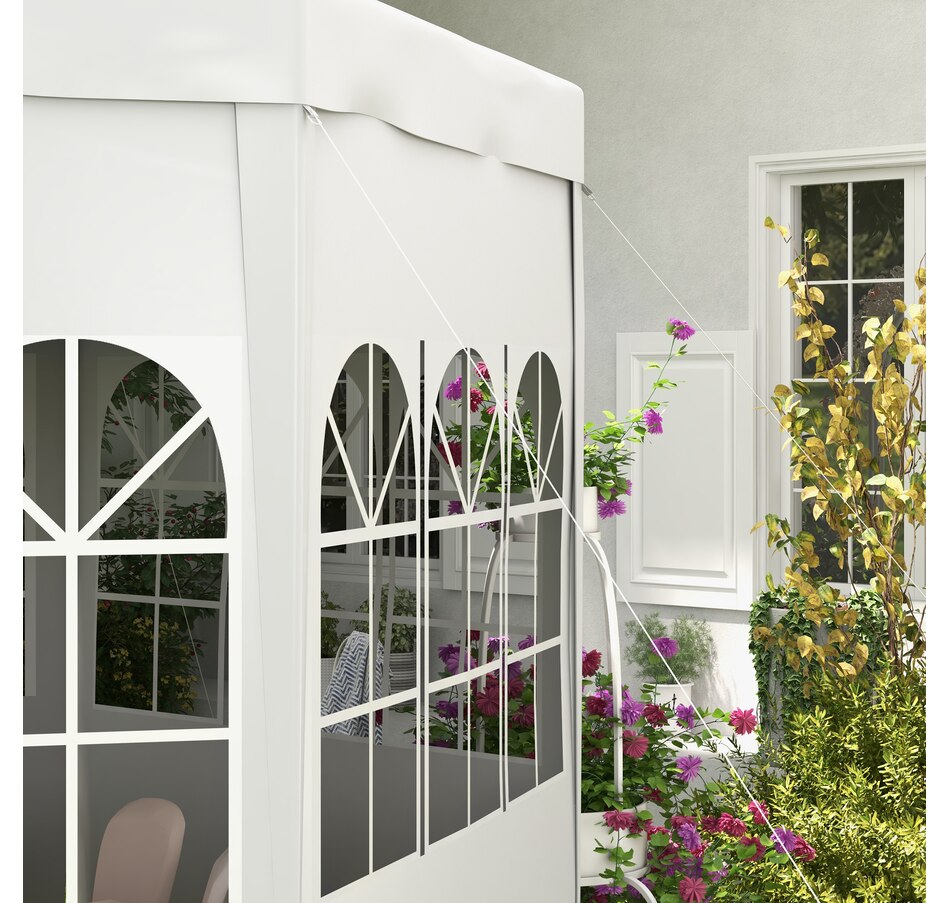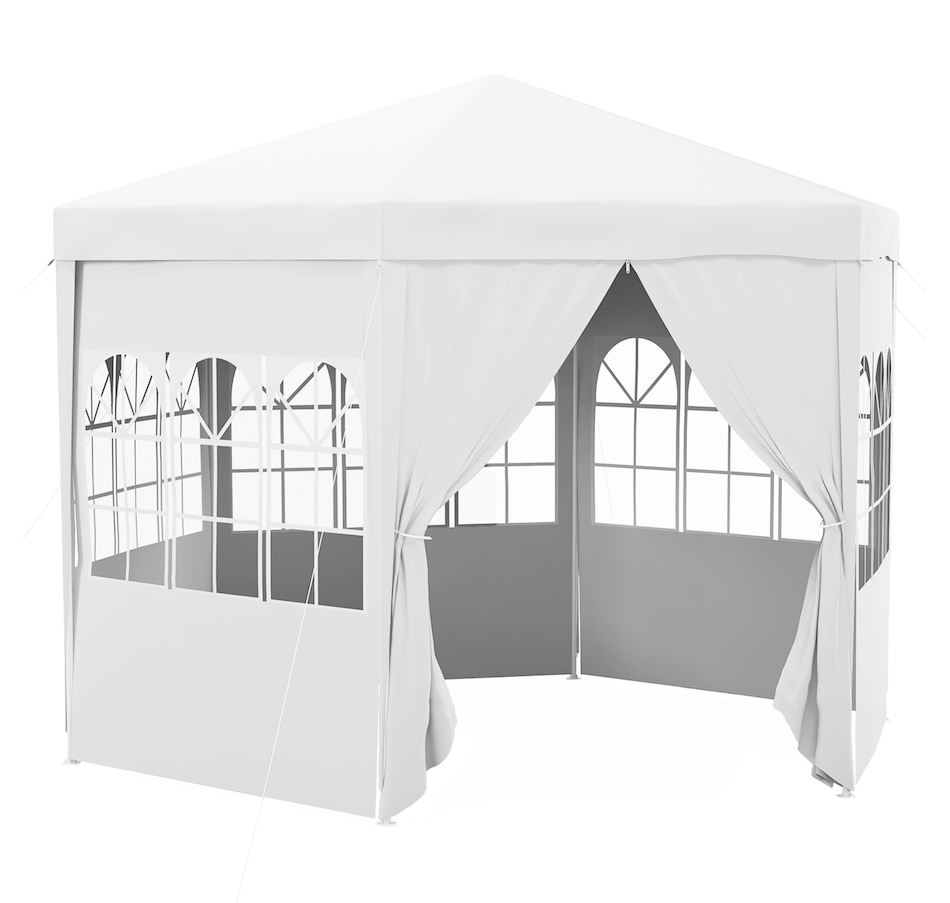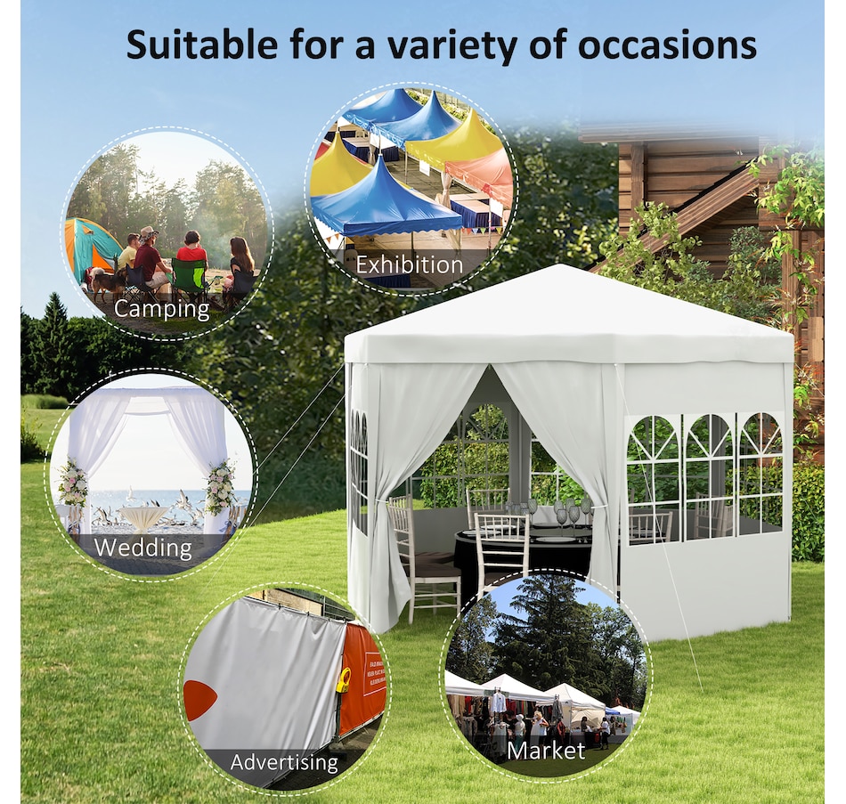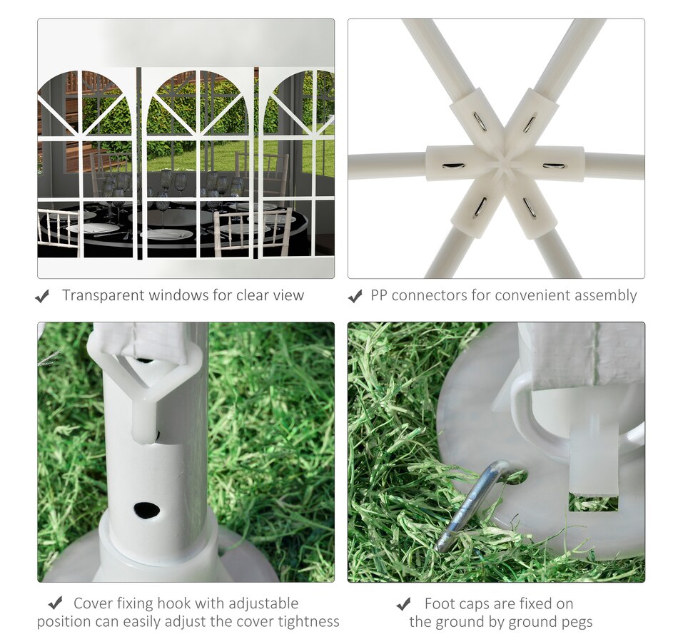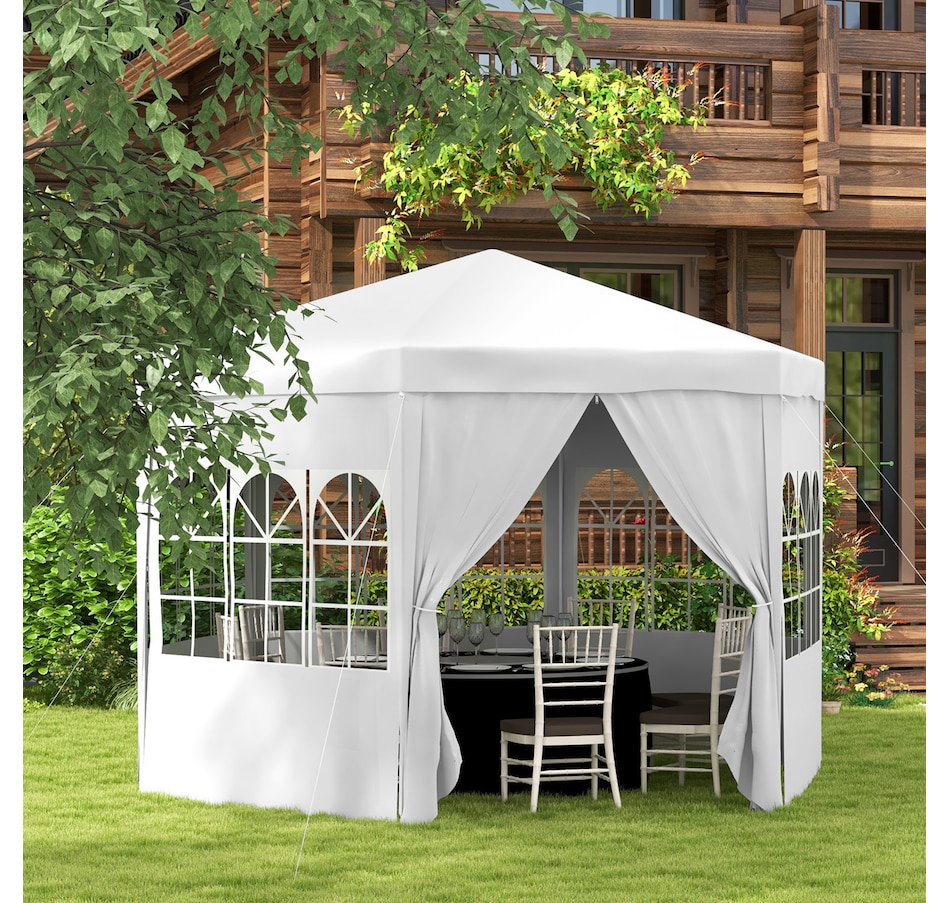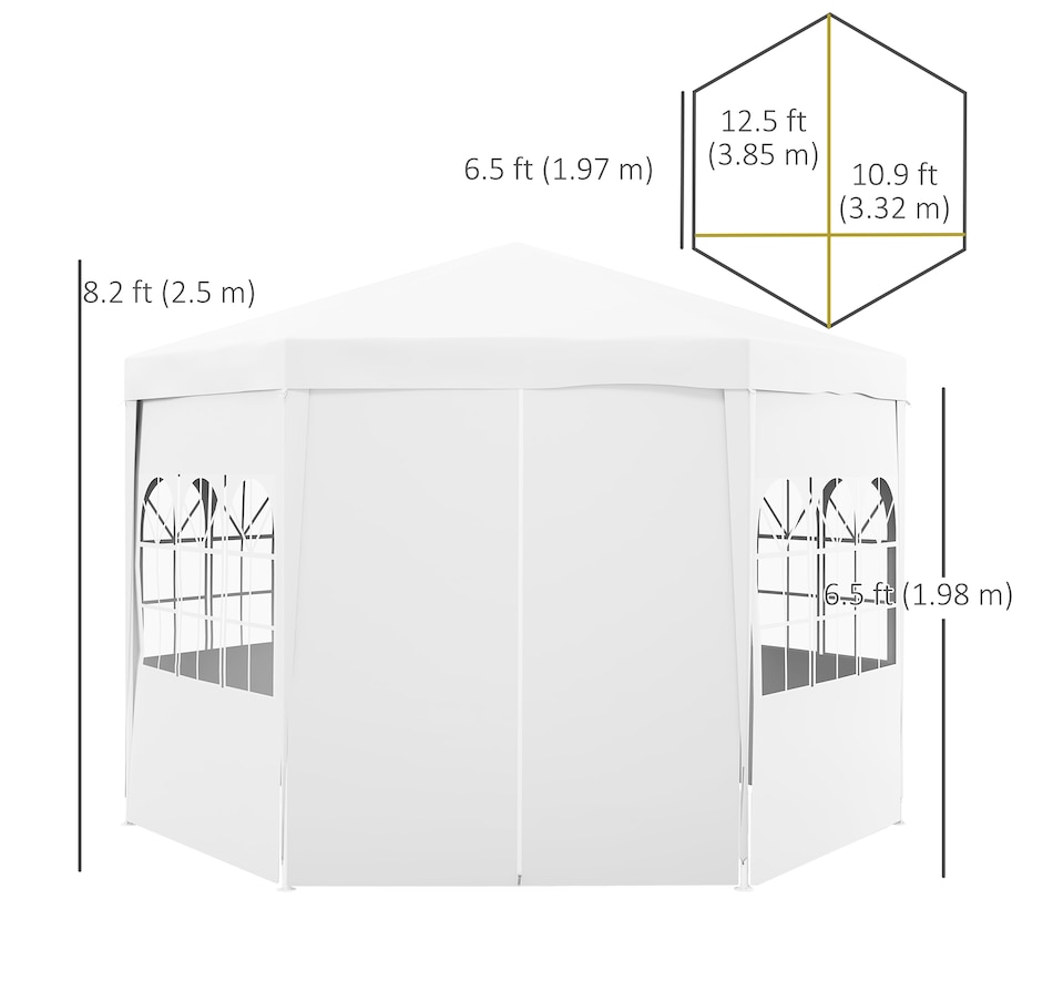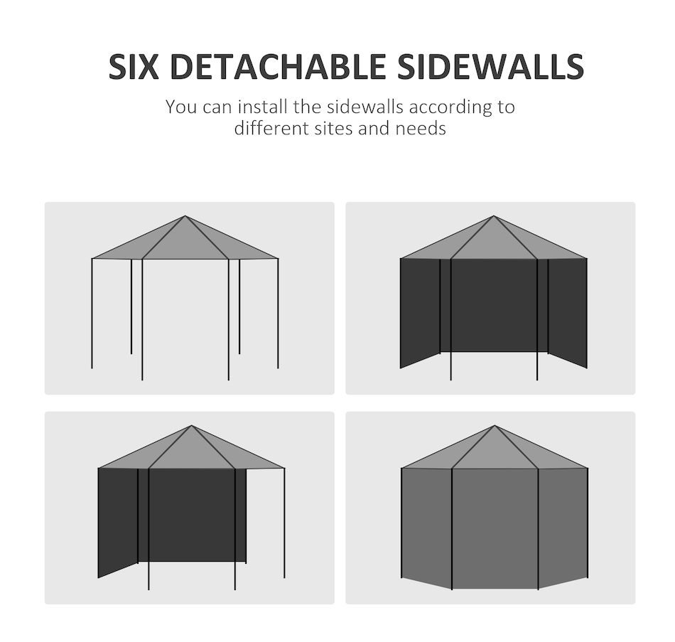 Choose this Outsunny backyard tent to create an excellent spot for any outdoor occasion this season. It features a large hexagon design with removable walls, allowing you to switch from an open to a closed atmosphere when desired. The included guy ropes and ground nails add stability, while the fastening zip on the main door allows for convenient entry and exit. The wedding tent has transparent windows, providing clear visibility inside and outside.Features:
