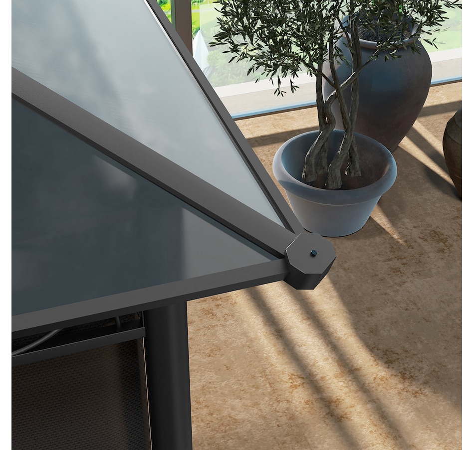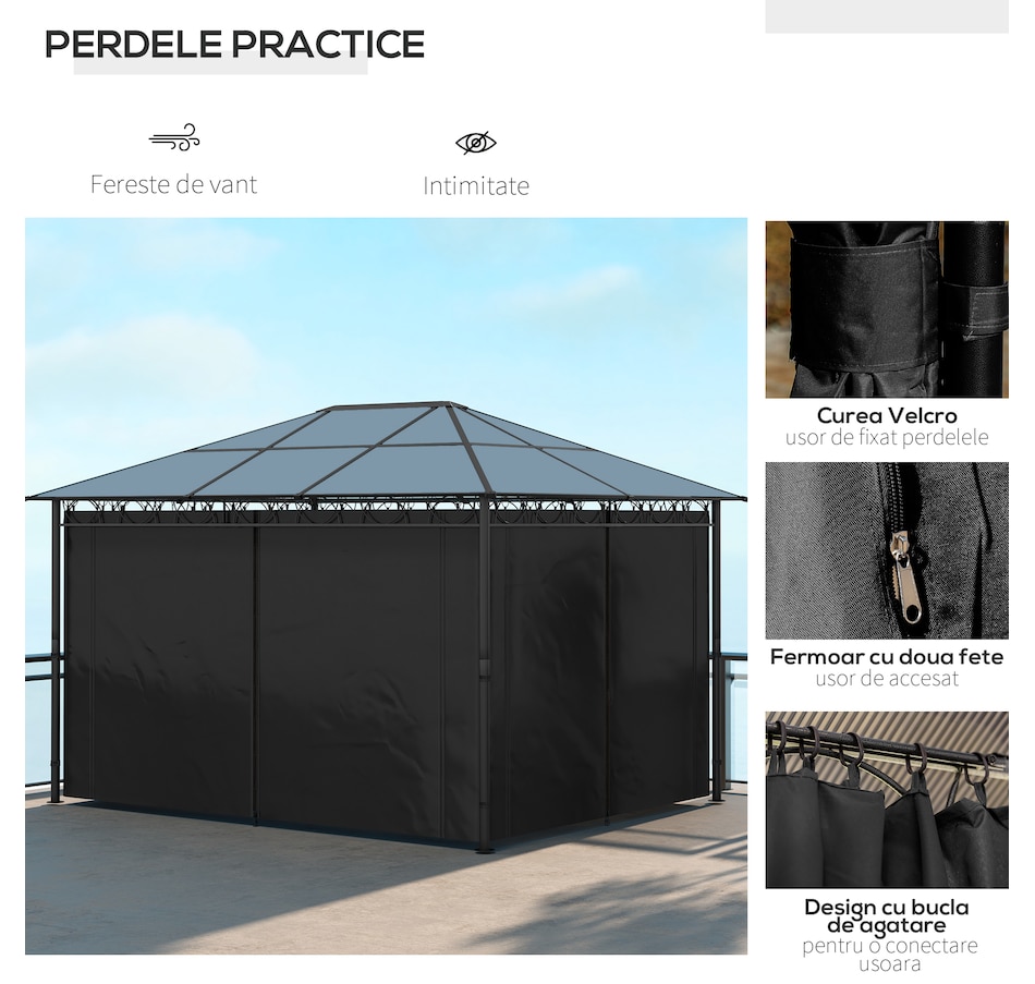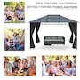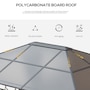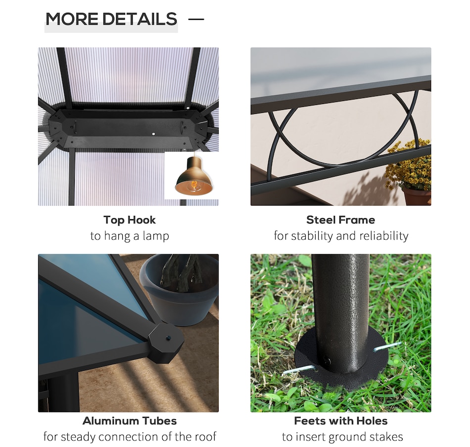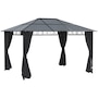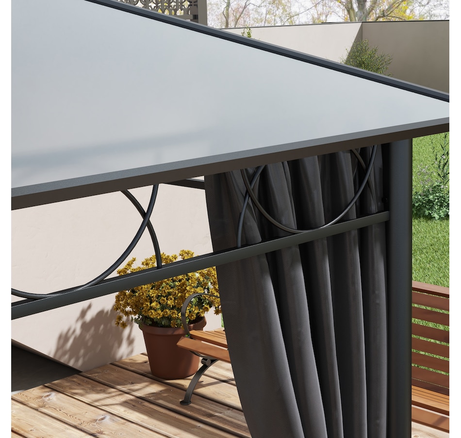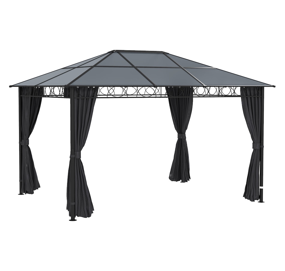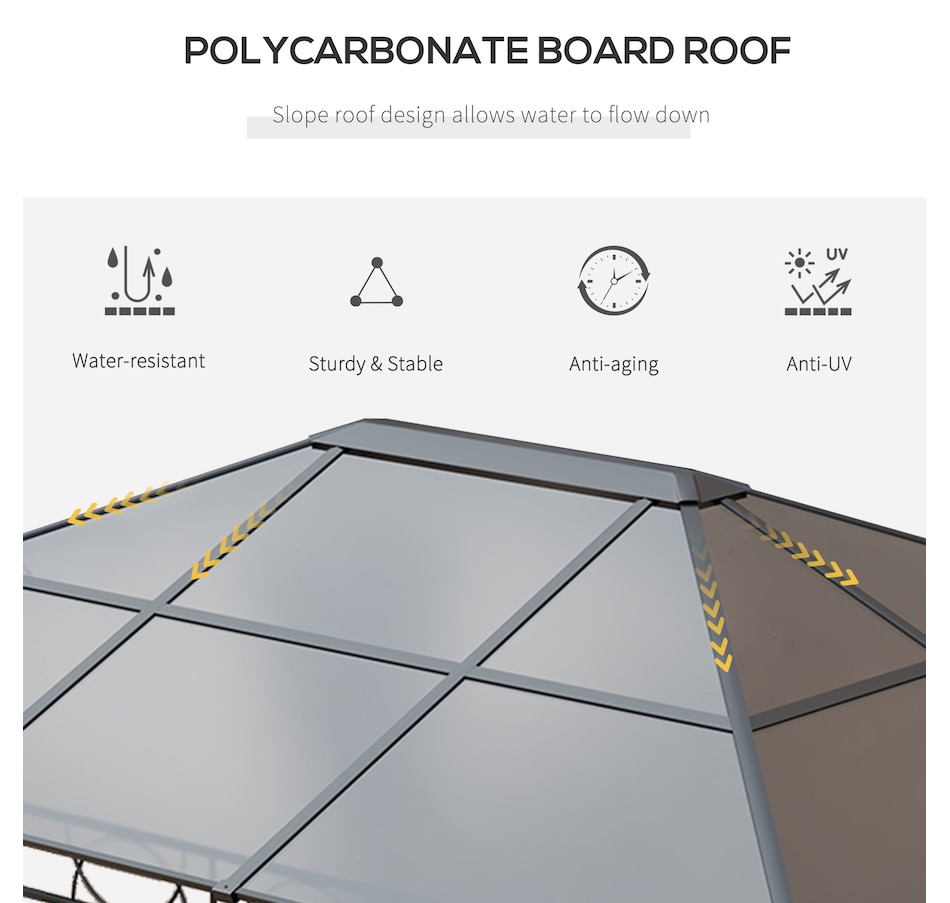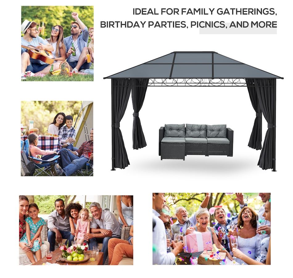 This outdoor gazebo is the optimal choice for relaxing and enjoying parties. The polycarbonate hard roof provides UV protection, and double-sided zipper curtains create a comfortable space. Its large size provides enough shelter for yourself and several other people. You can set up this metal gazebo in the backyard or poolside and have a nice gathering with friends or family. Let this practical gazebo improve your happiness and quality of life.Features: