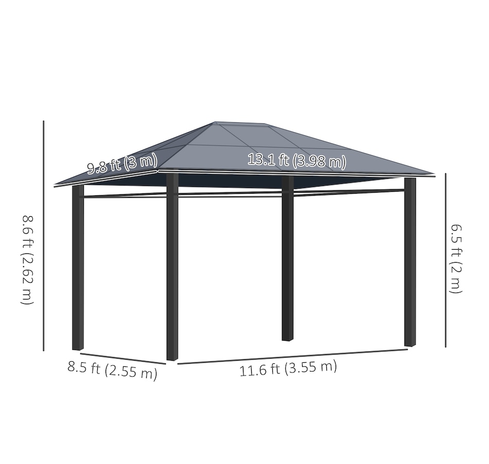 ● Overall Dimension: 13.1'L x 9.8'W x 8.6'H (398 x 300 x 262 cm);