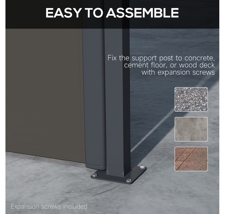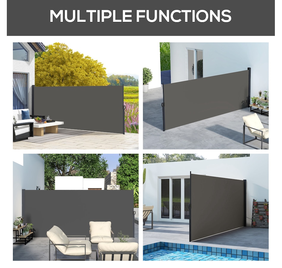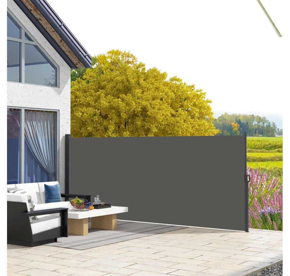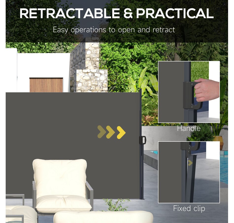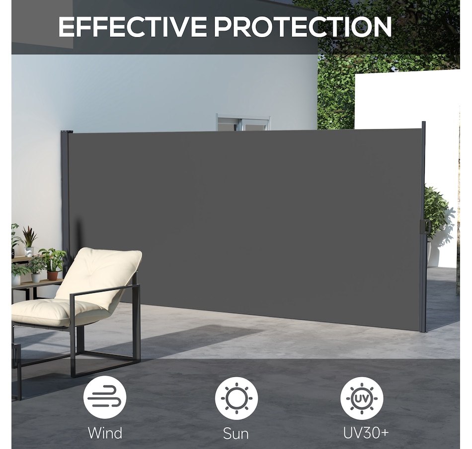 Prevent glaring sun and gusting winds from disturbing you outdoors with this retractable garden screen from Outsunny. The metal base frame is rigid to ensure a lasting addition to your garden, attaching securely and efficiently to cement or solid wood for quick setup. The free-standing awning pulls out smoothly and fixates in place with the clip lock handle - a simple operation—a great way to enjoyably extend your time out in the garden.Features: