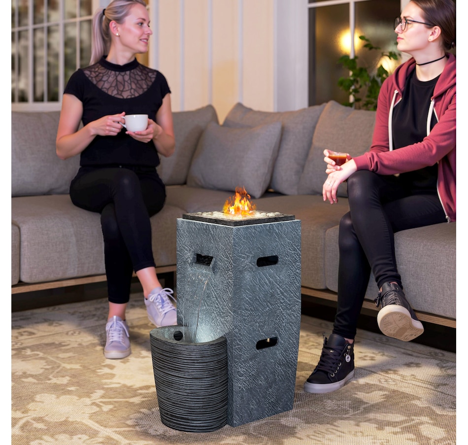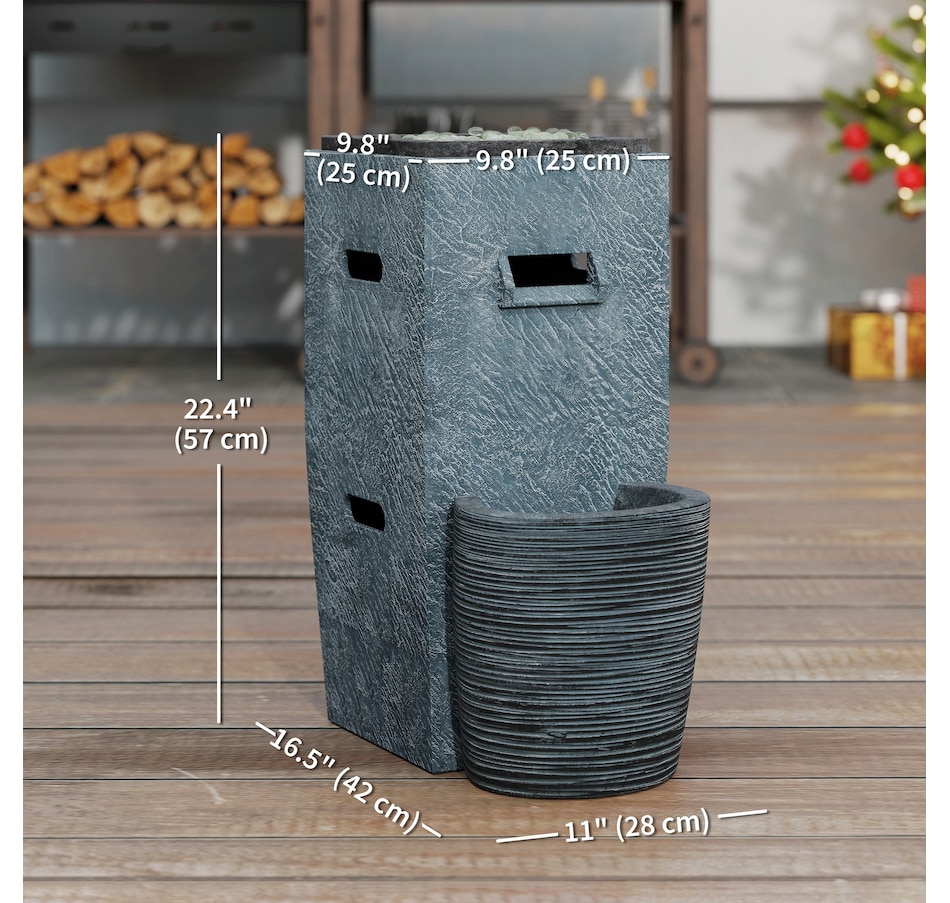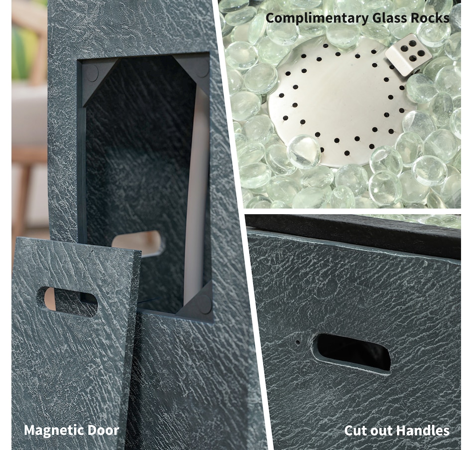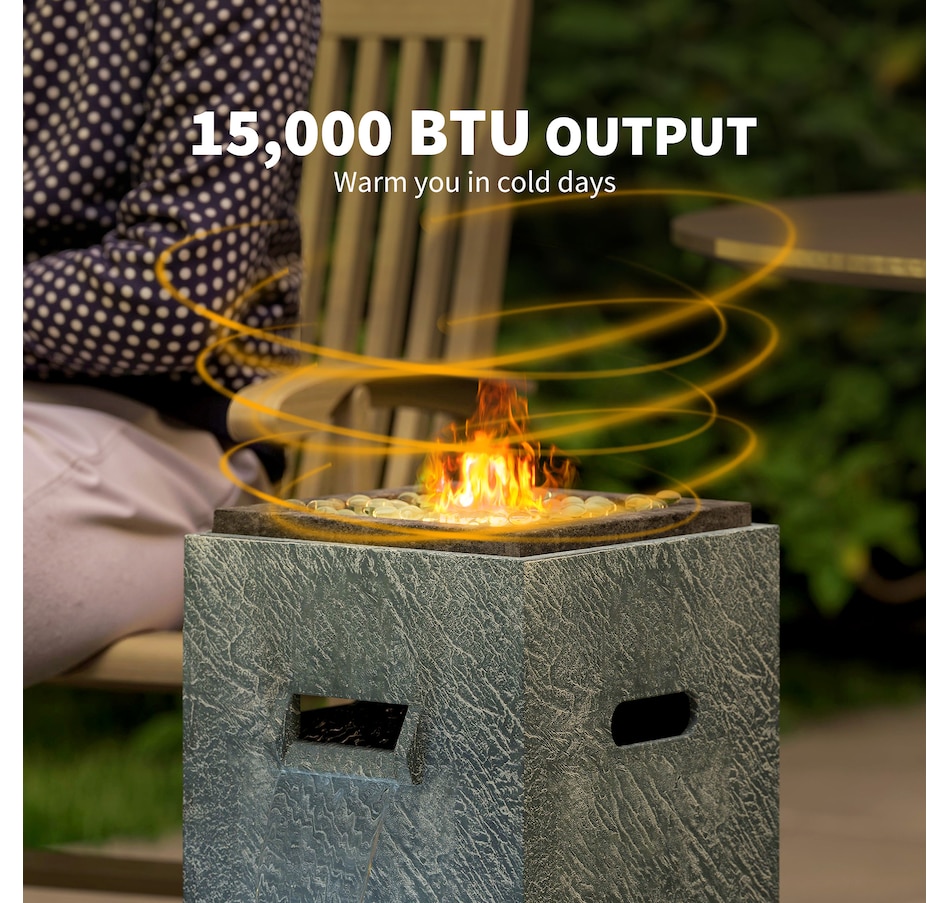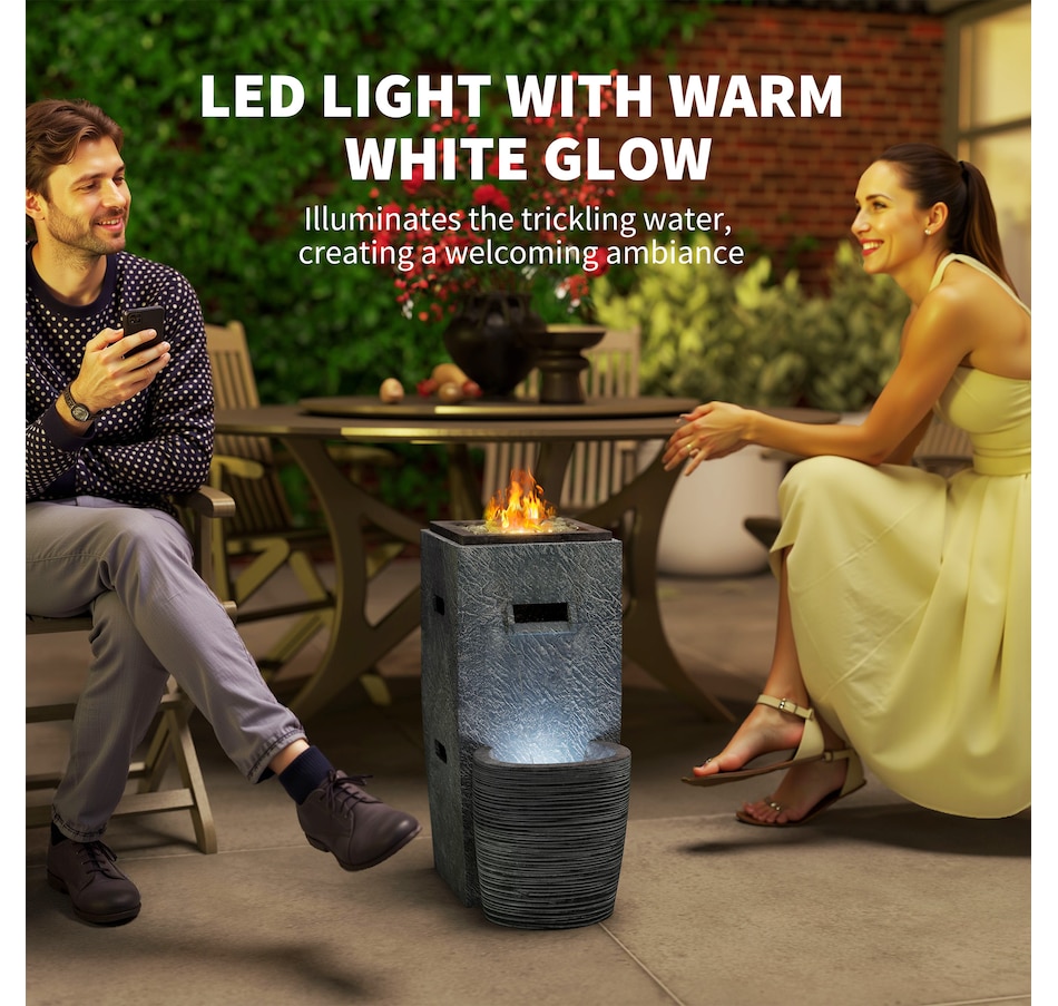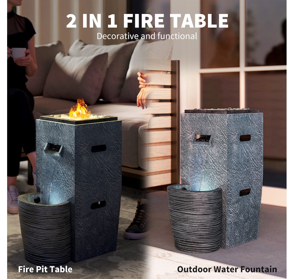 Transform your garden into a serene oasis with the Outsunny 2-in-1 fire pit table and outdoor water feature. Enjoy the warmth of a 15000 BTU propane fire table combined with the tranquil sounds of flowing water, creating a great ambiance in any outdoor or indoor setting. The included glass rocks and mesmerizing LED lighting amplify the ambiance, making it a great center piece for any gathering.