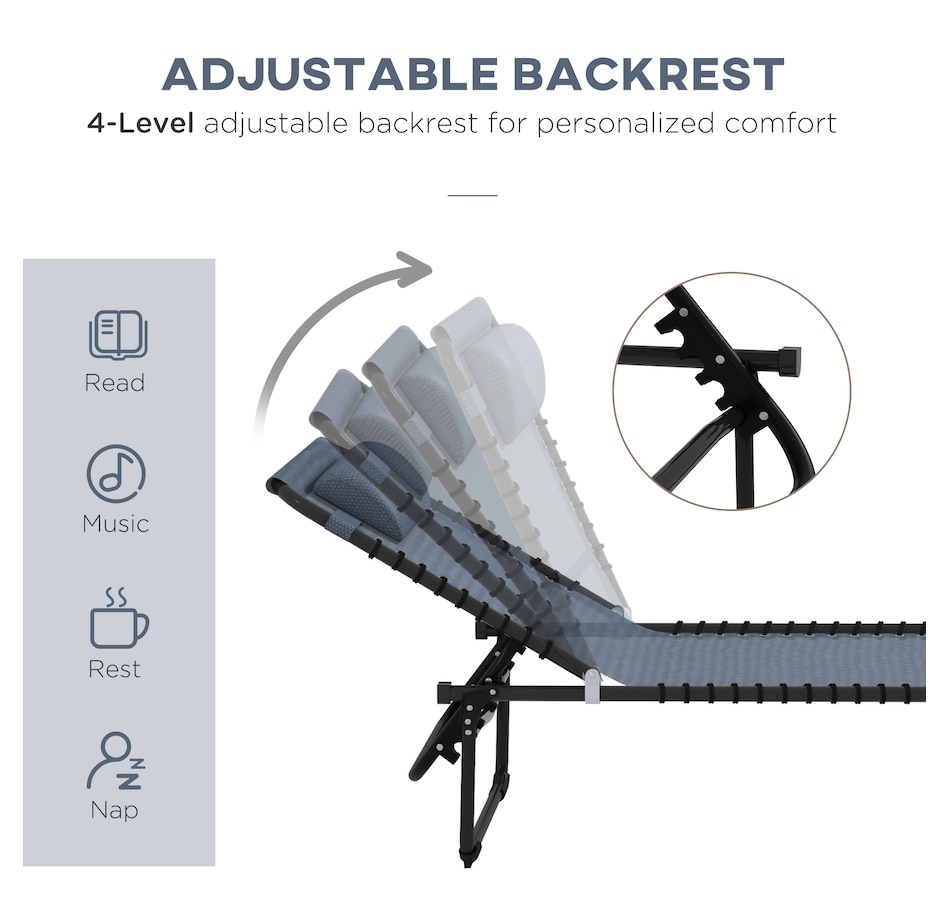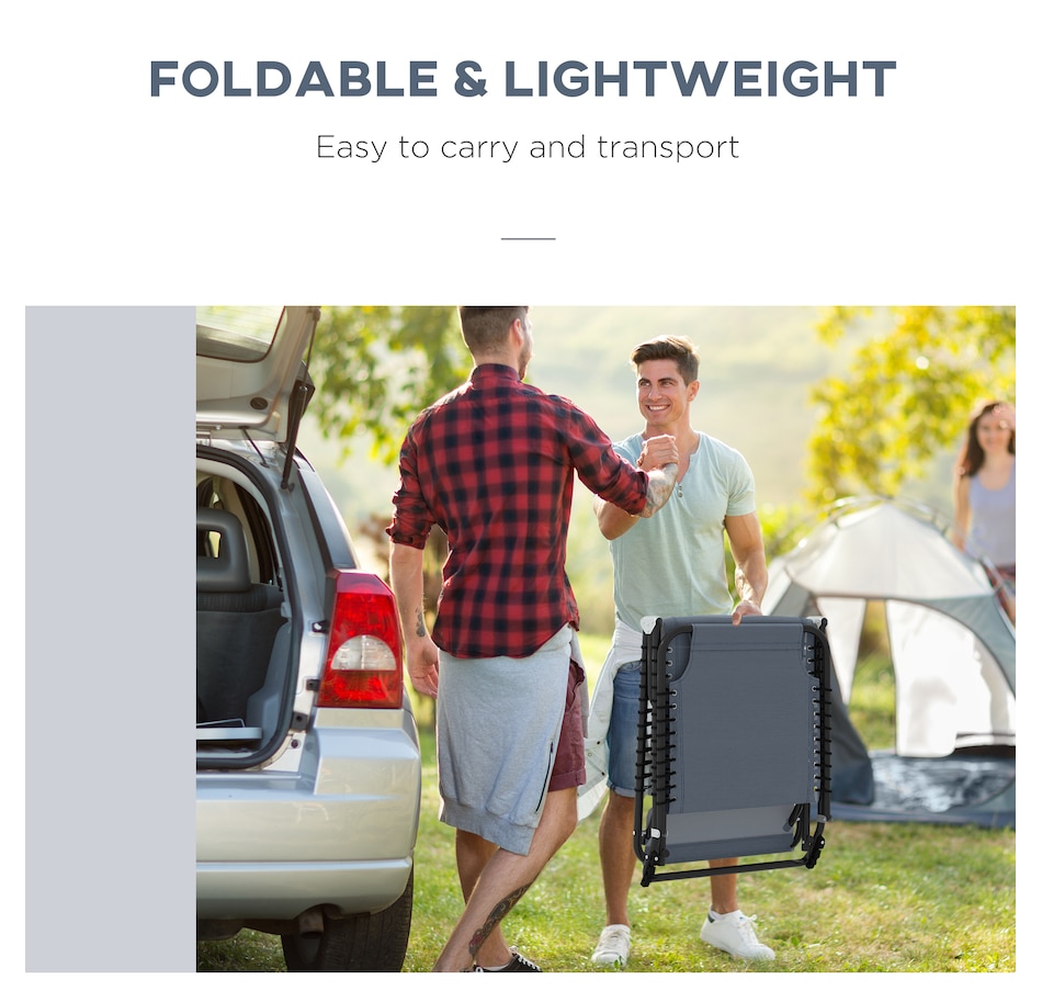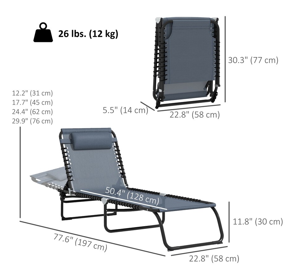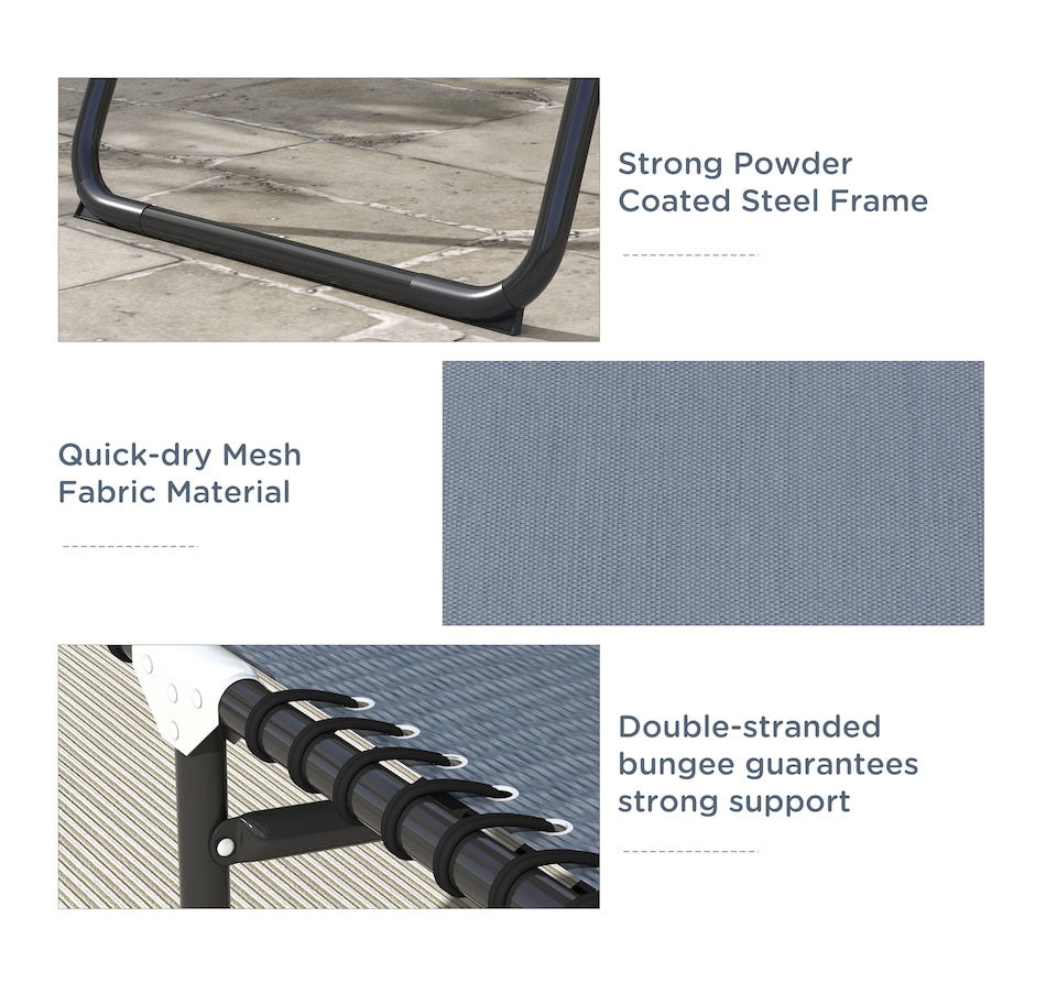 This set of two reclining lawn chairs offer quick-folding chaise lounge seating and sunbathing space. The backrest can be set to recline in 4 different positions so you can lie down at the angle of your choice. Easy to move and bring on the road, the lawn chairs can fold up and come with you to the beach, a campsite, or a pool. Sit back and sunbathe on the form-fitting, quick-drying, bungee-suspended mesh. It stays cool in the sun and dries quickly if you sit after just getting out of the pool.
