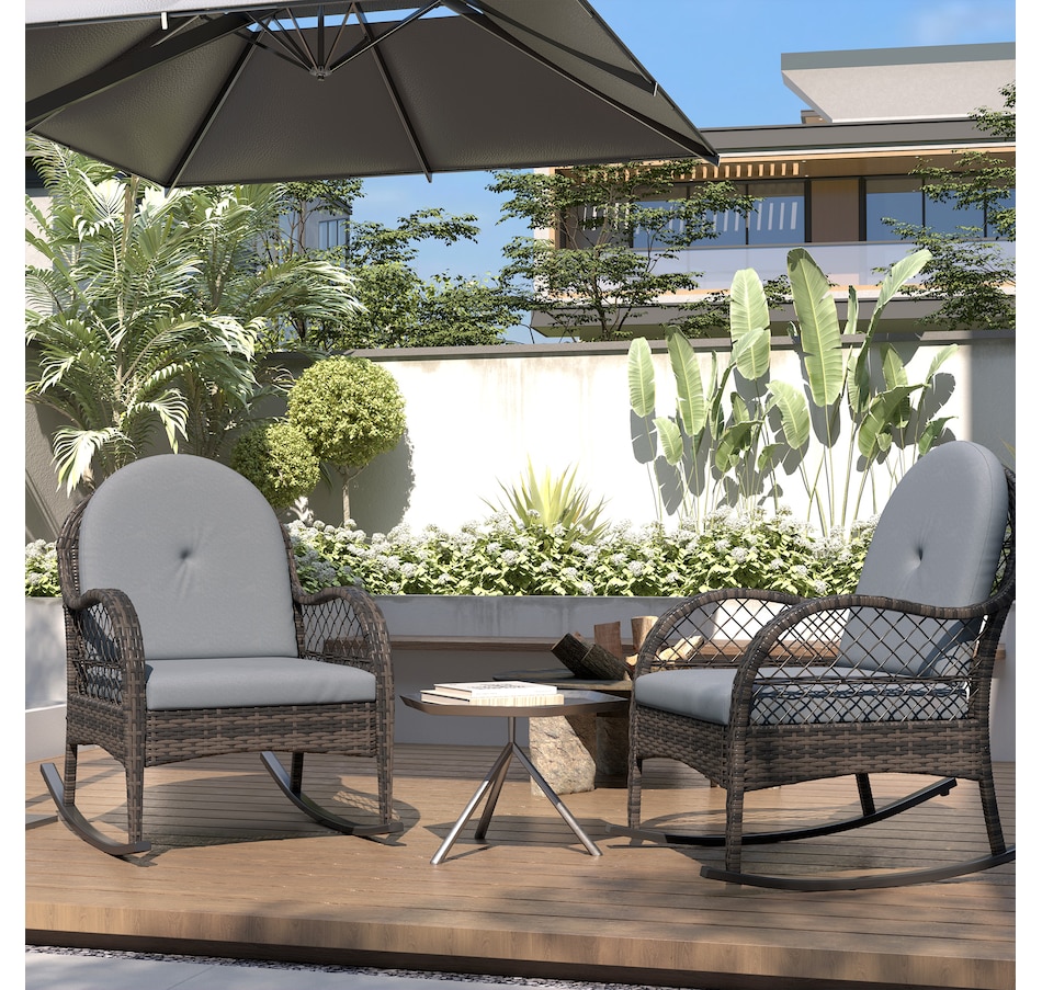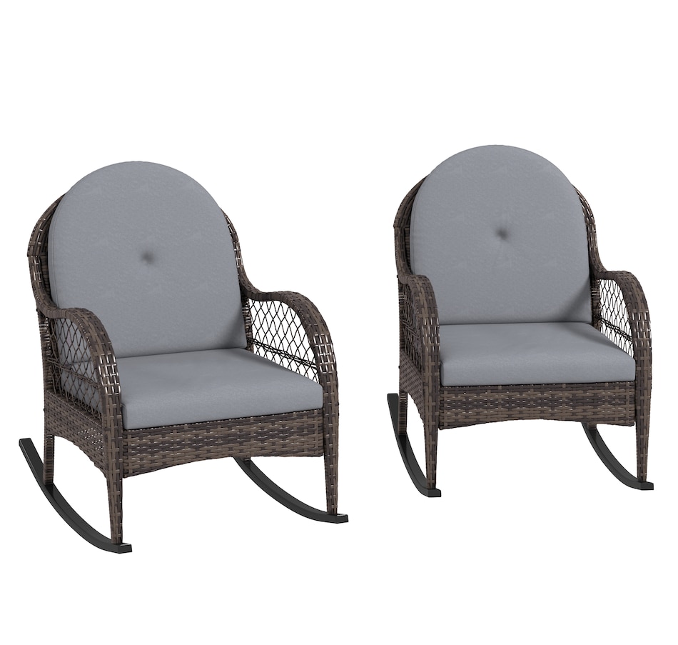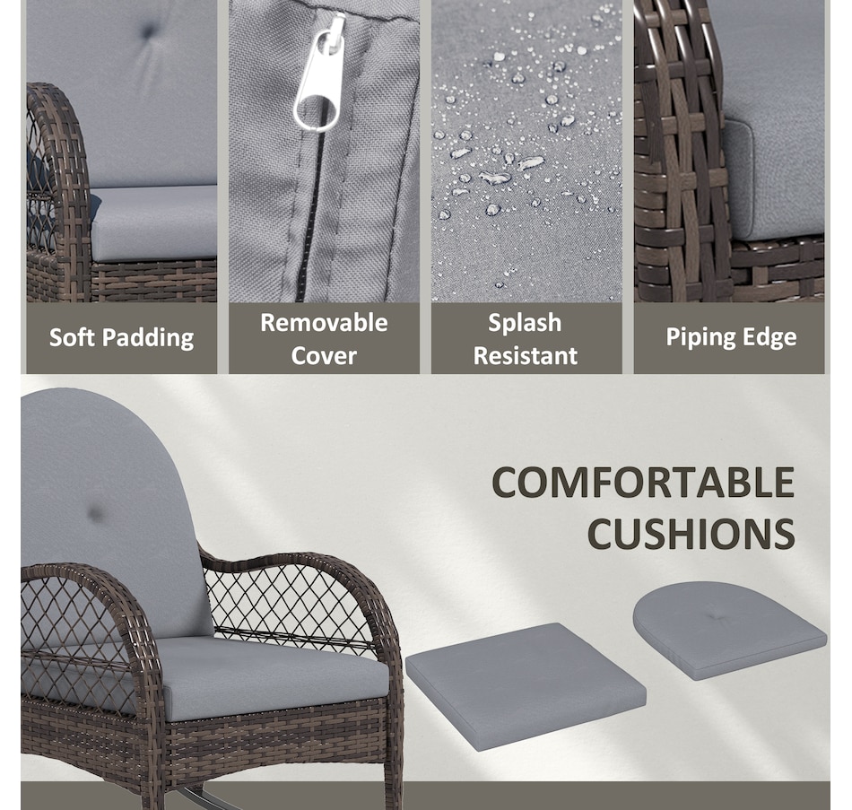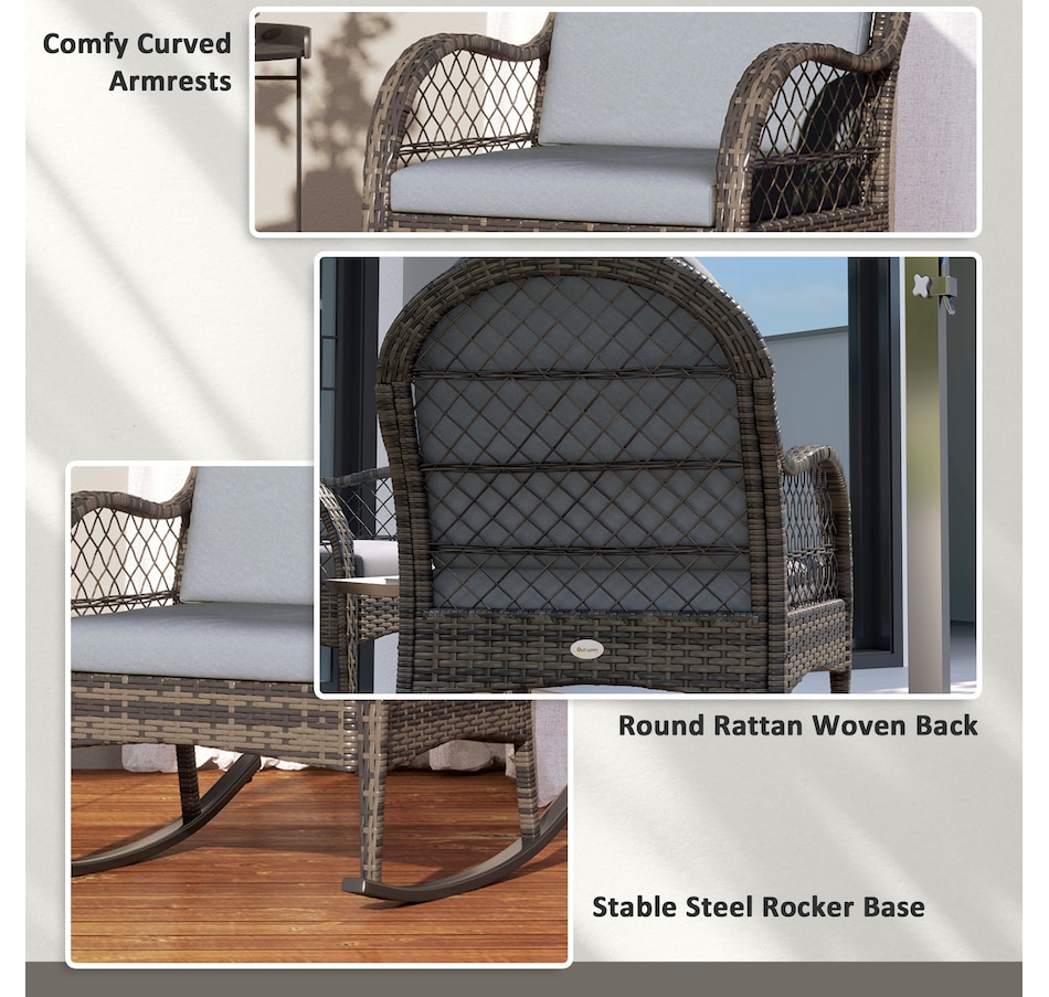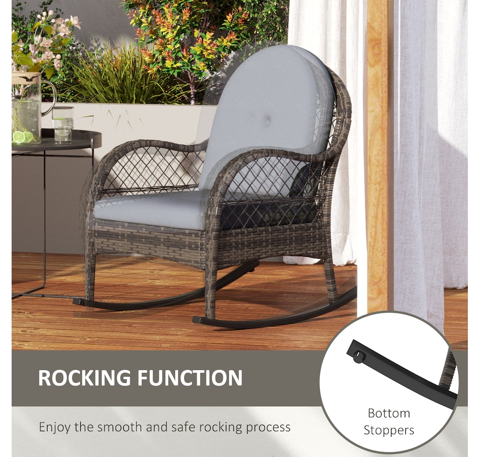 Bring a timeless charm to your indoor and outdoor space with this rocking deck chair set from Outsunny. Plastic rattan showcases natural beauty and outdoor endurance, and a stable steel base with foot pads offers safe rocking. The ergonomic porch chair with inclined back, curved armrests, seat and back cushion means you can rock gently back and forth in comfort, enjoying the great time of the day. Unwind and indulge in the relaxation with rocking lawn chair in porch, balcony, poolside.