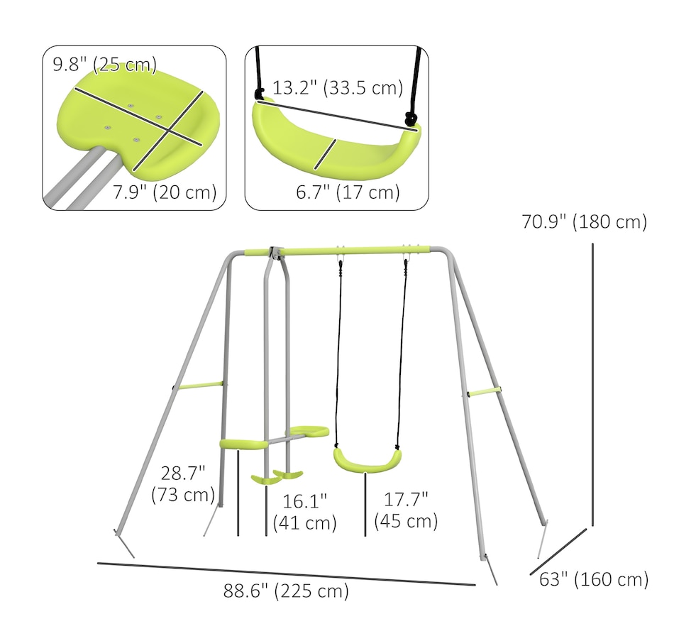 ● Maximum Load: 99 lbs. (45 kg)(each swing seat), 298 lbs. (135 kg)(overall)