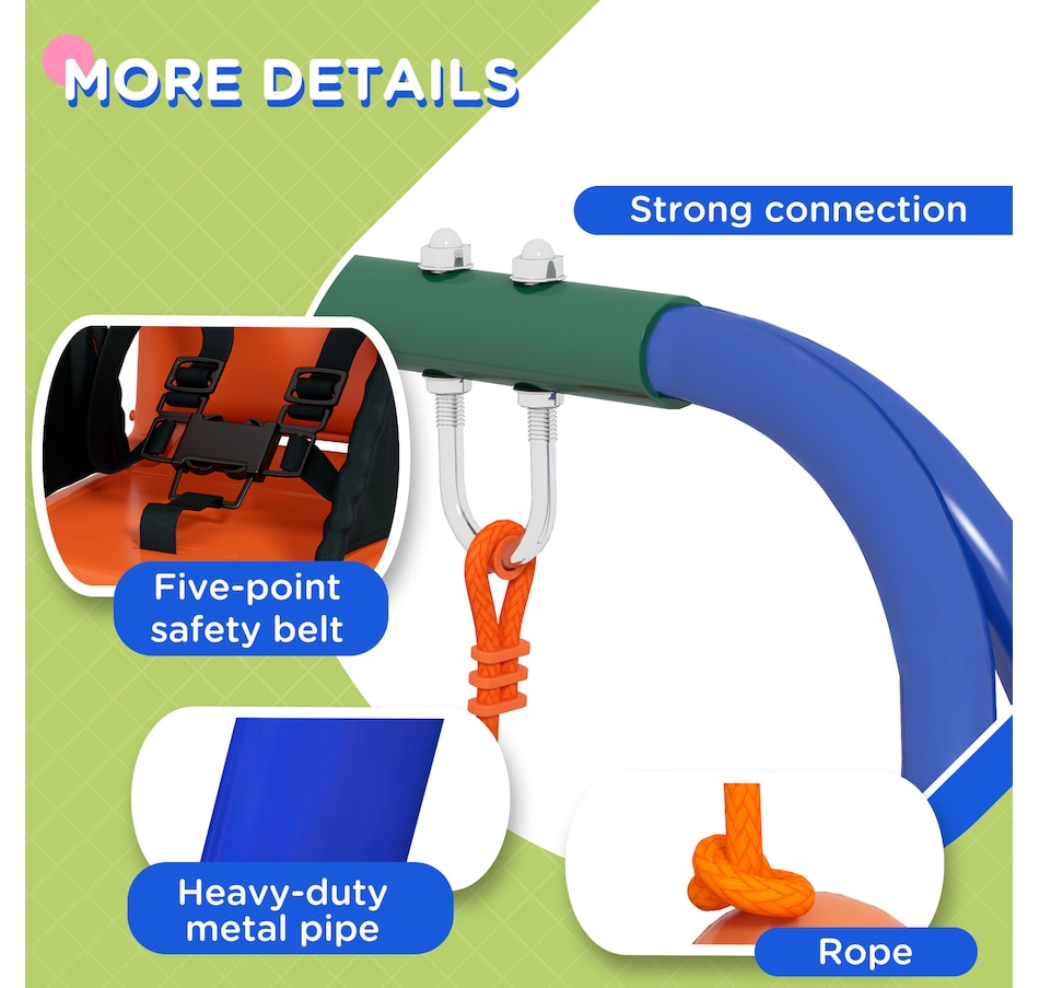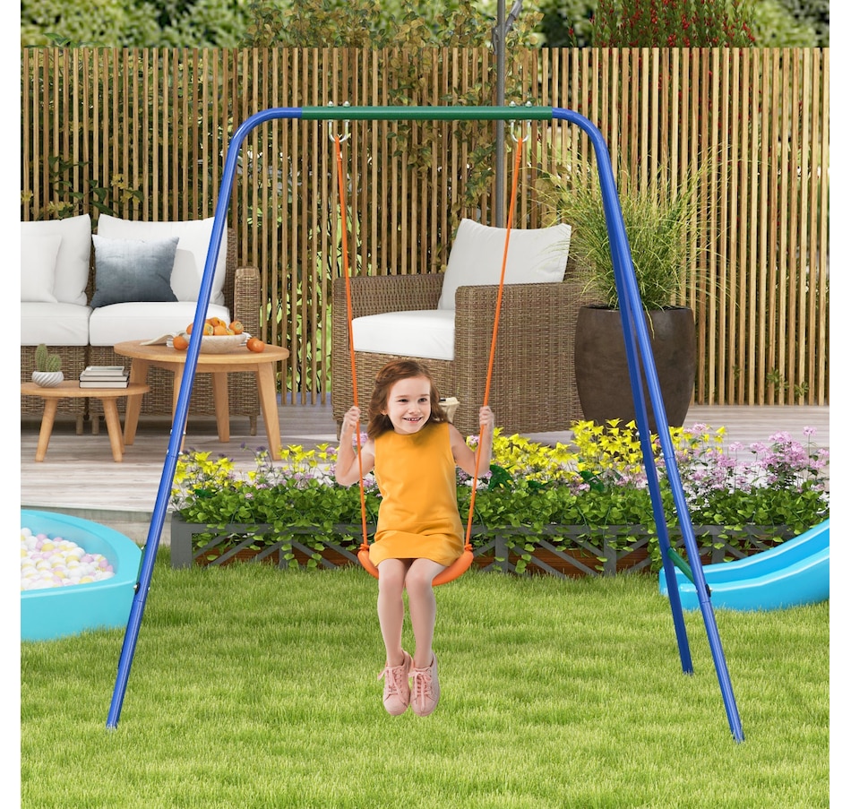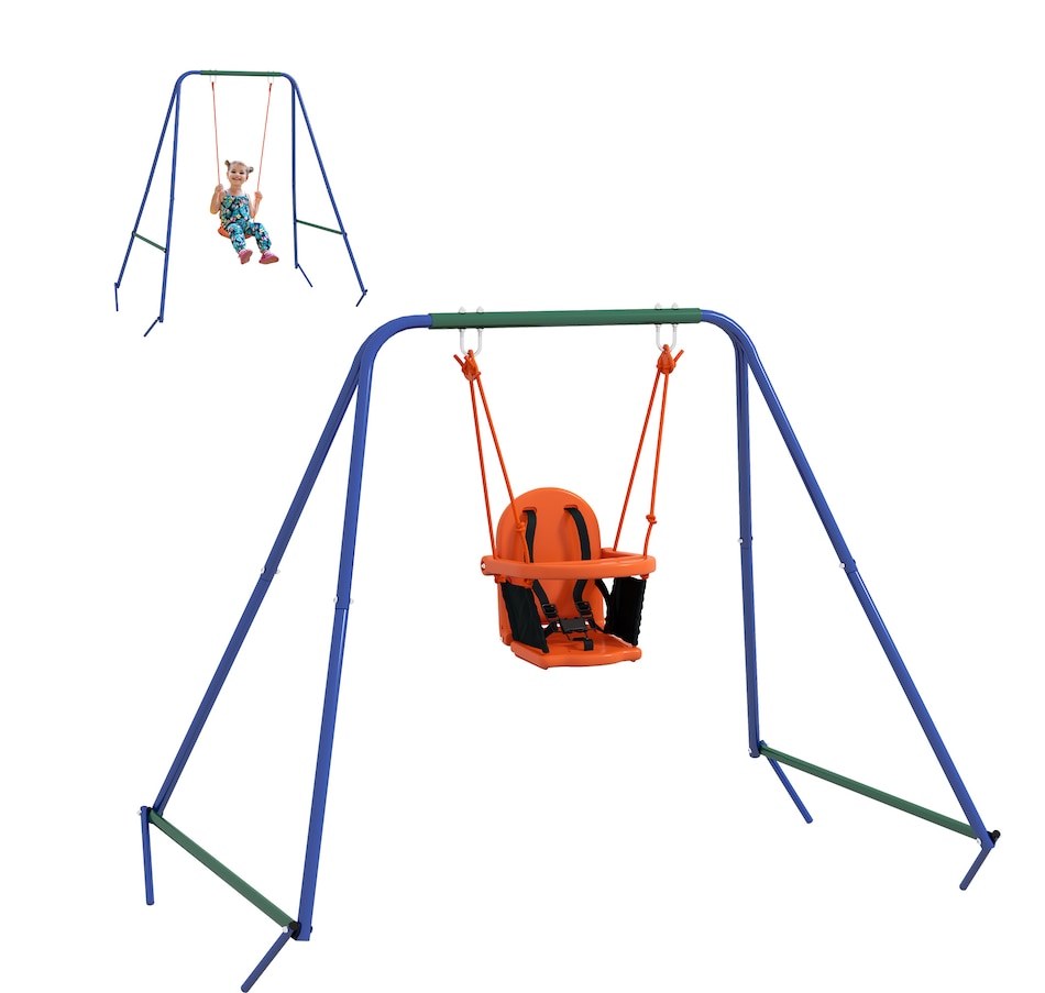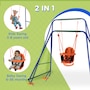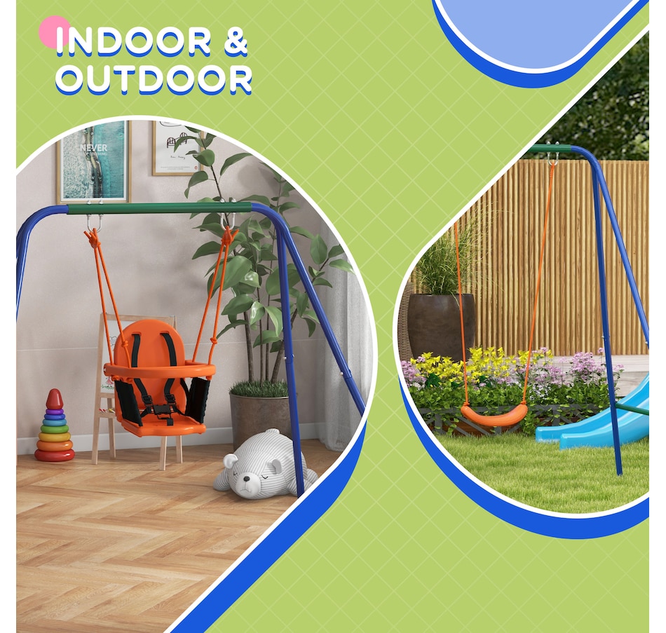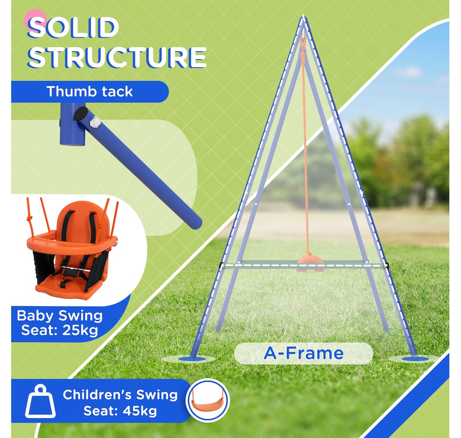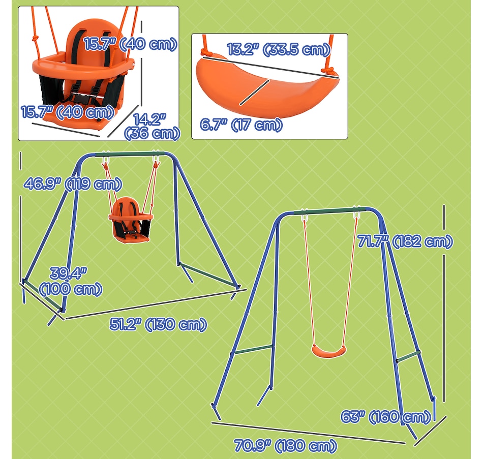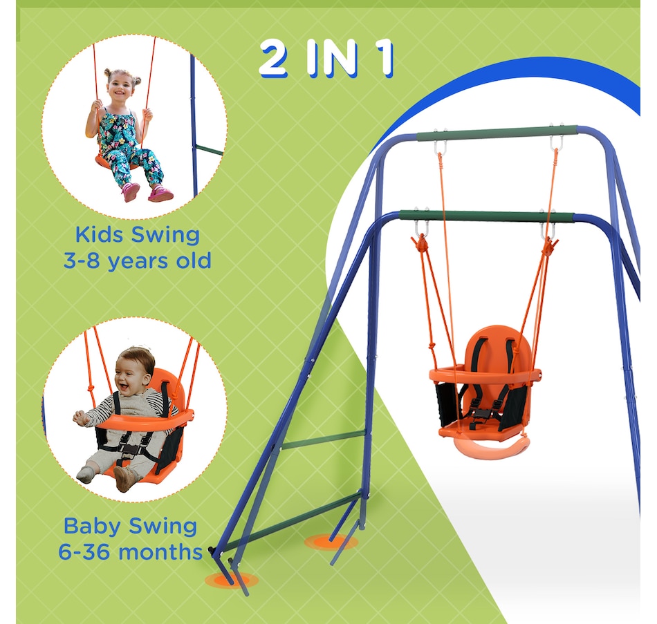 Turn your garden into an exciting playground with the Outsunny kids swing set. Packed with an array of features, this swing set offers endless fun for children. With lots of space, they can play and enjoy together in a safe surroundings. The steel frame and ground stakes ensure stability and security, keeping the set firmly anchored to the ground. ● Including multiple play options ● Can fit up to a child at once ● Robust metal pipes for outdoor long-time use ● Includes ground stakes to keep it secure to the ground ● A wonderful gift for kids to promote their overall well-being ● Assembly required ● Colour: Orange, Blue, Green ● Material: Metal, PE ● Overall Dimensions: Kid Swing: 70.9" W x 63" D x 71.7" H (180 x 160 x 182 cm). Baby Swing: 51.2" L x 39.4" W x 46.9" H (130 x 100 x 119 cm) ● Baby Swing Seat: 15.7" L x 14.2" W x 15.7" H (40 x 36 x 40 cm), Seat Height: 13.8" (35 cm) ● Kids Swing Seat: 13.2" L x 14.2" W x 3.5" H (33.5 x 36 x 9 cm), Seat Height: 17.7" (45cm) ● Maximum Load: 25kg Baby swing seat: 55 lbs(25kg). Kids swing seat: 99 lbs(45kg) ● Recommended Age: 6-36 months (baby swing seat), 3-8 years old (kids swing seat) ● Qualification Age: Over 6 months ● Item Label: 344-079V00OG ● 1 x Kids Swing Set ● 1 x Manaul