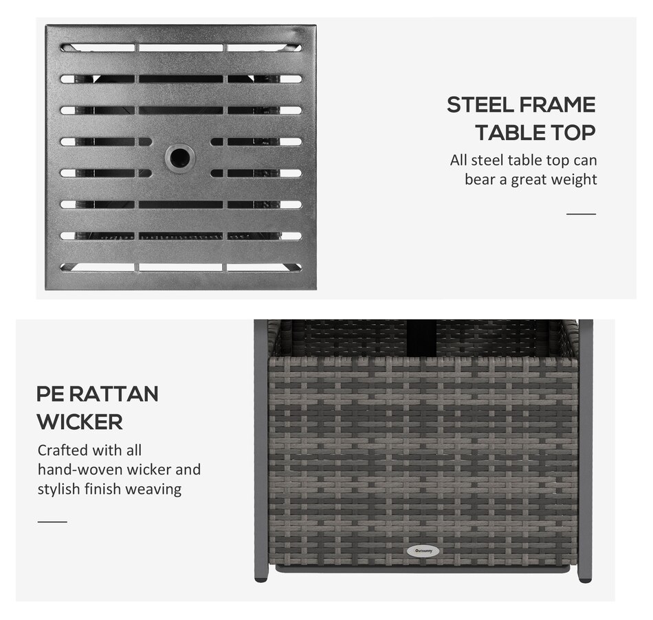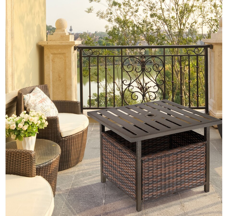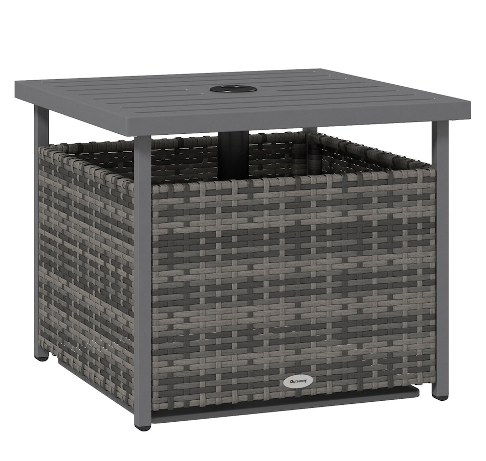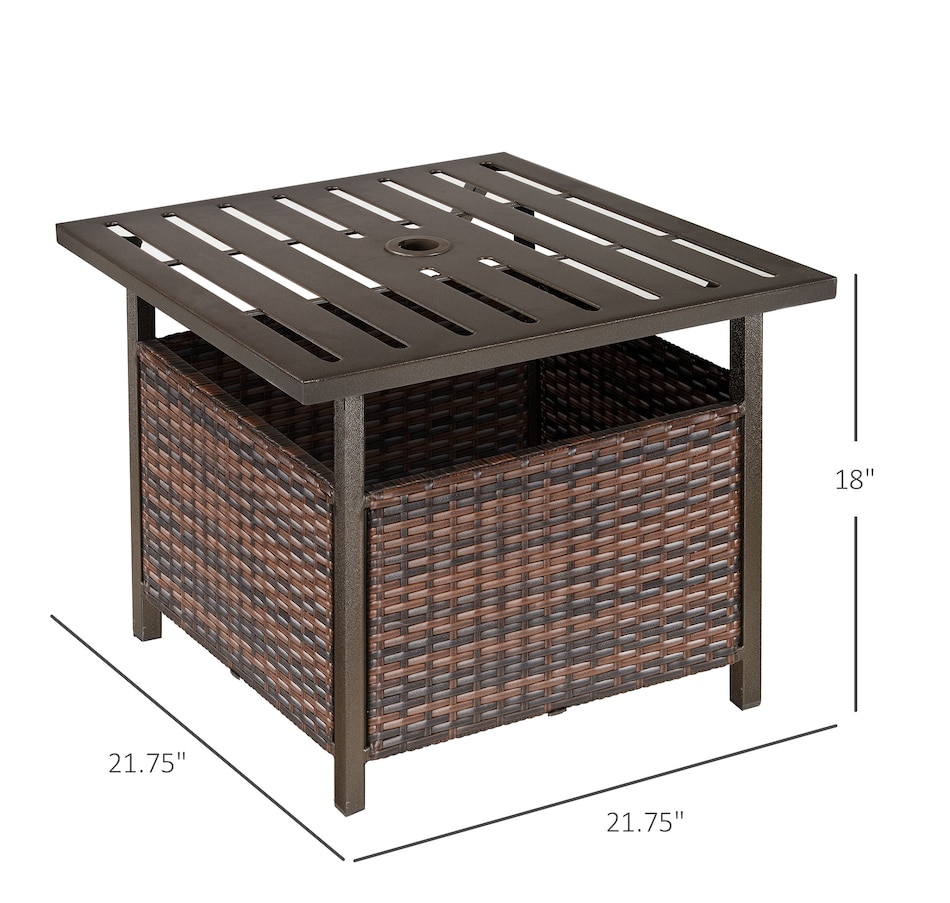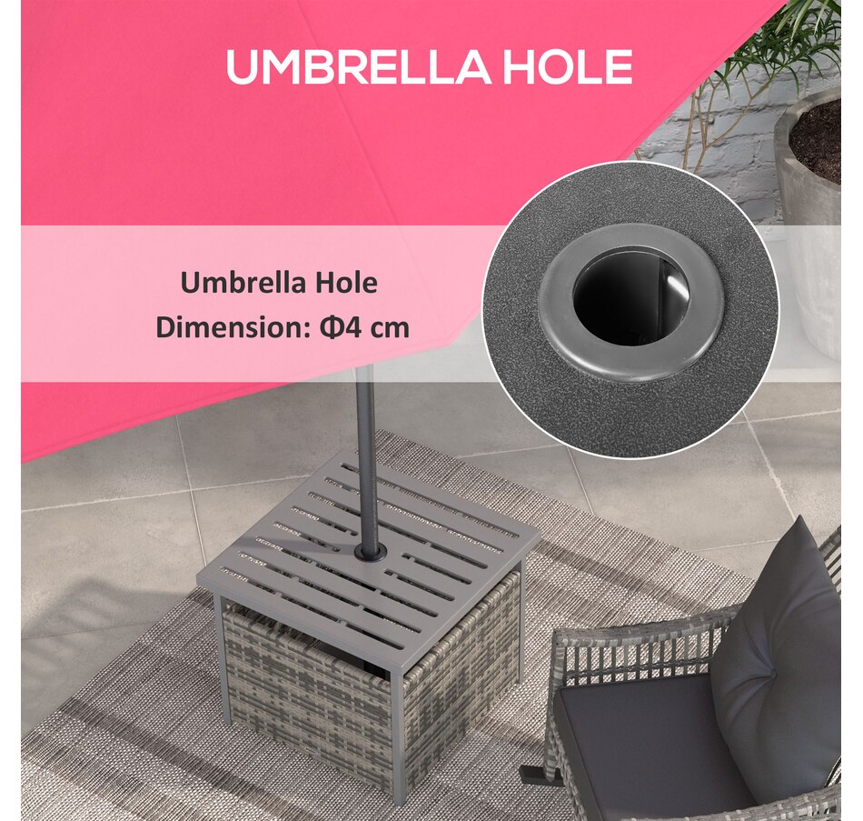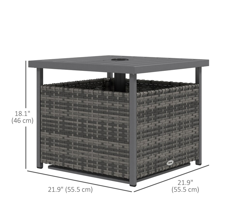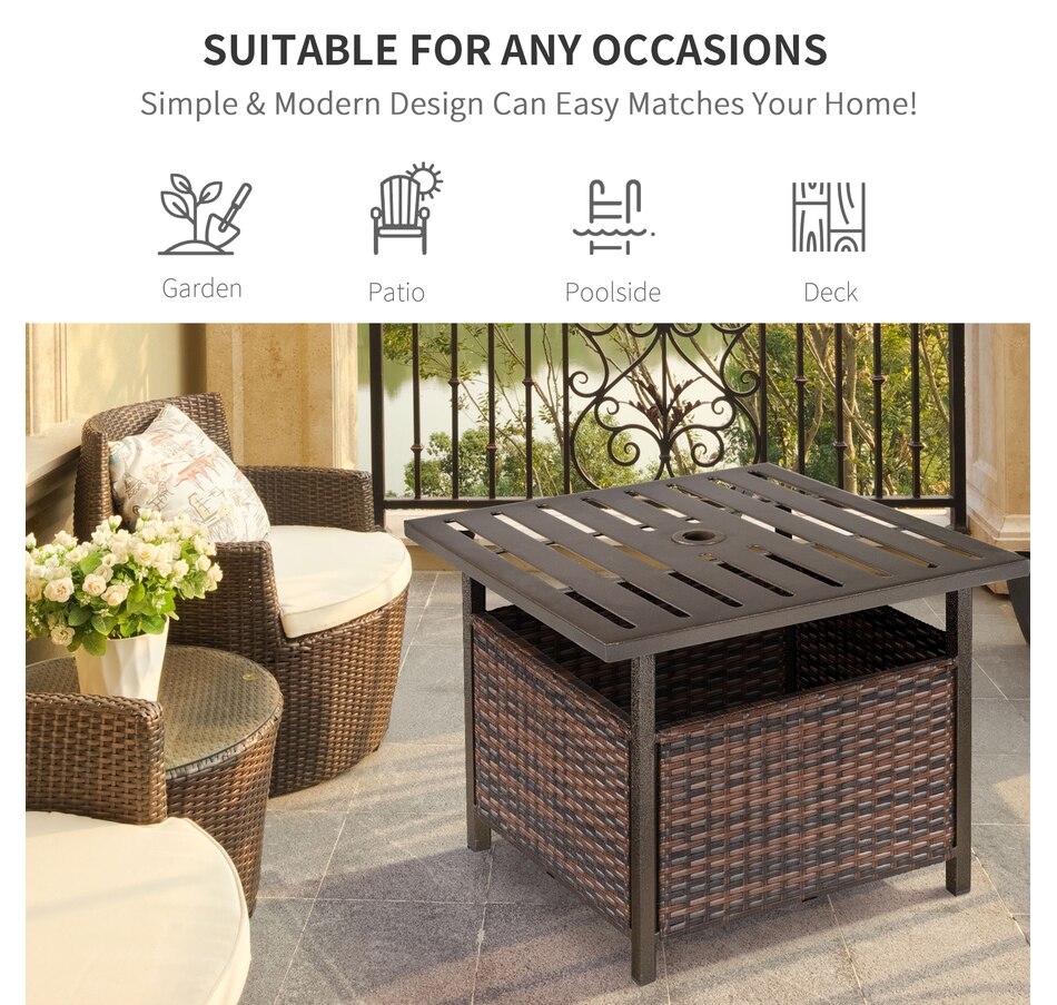 The Outsunny rattan wicker outdoor accent table with umbrella Insert features an elegant design and functional umbrella insert. The steel table-top is waterproof, stain-resistant and easy to clean. The weave rattan basket underneath can be used for storage or filled with weights when supporting a patio umbrella through the 1.5" (4 cm) diameter umbrella insert. Enjoy the coziness under the shade of an umbrella with this accent table from Outsunny. The great addition to your pool or garden patio.Features: