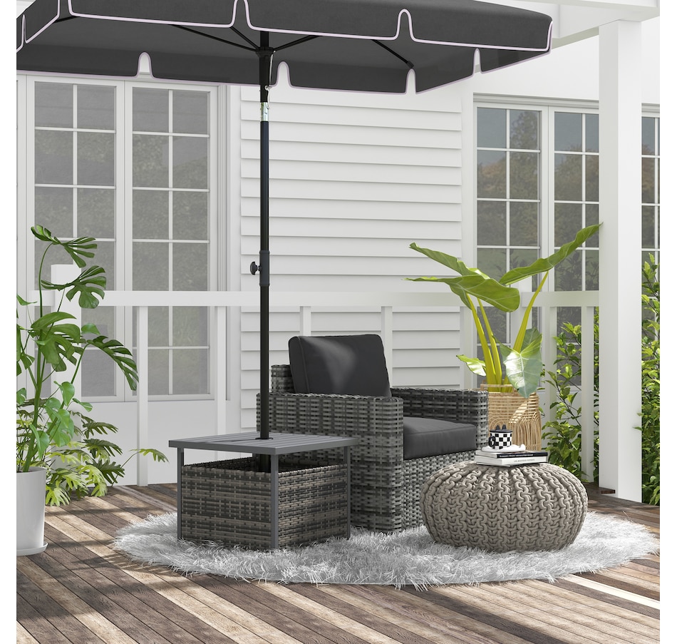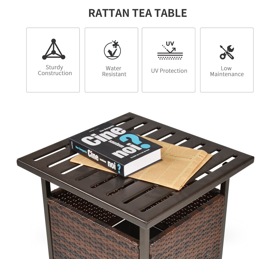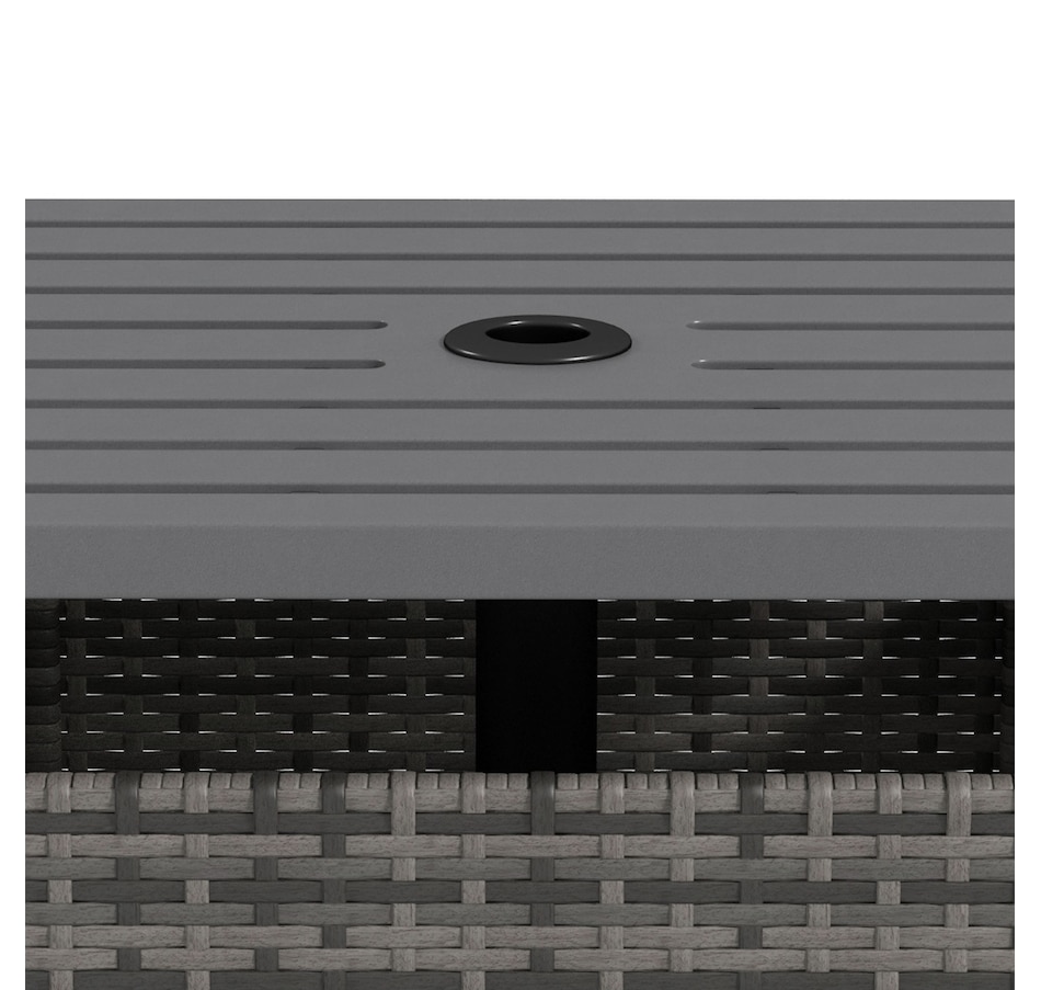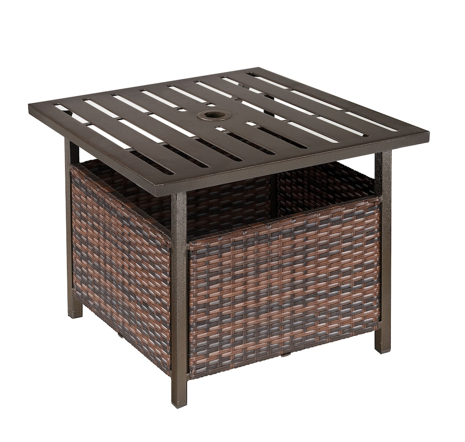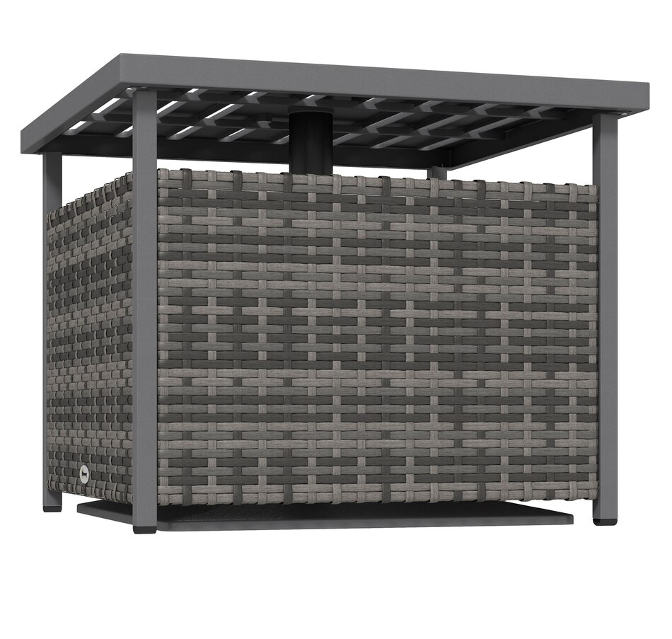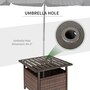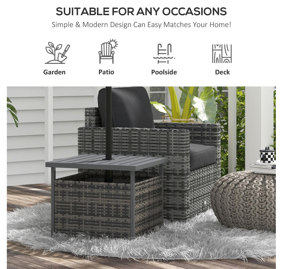 The Outsunny rattan wicker outdoor accent table with umbrella Insert features an elegant design and functional umbrella insert. The steel table-top is waterproof, stain-resistant and easy to clean. The weave rattan basket underneath can be used for storage or filled with weights when supporting a patio umbrella through the 1.5" (4 cm) diameter umbrella insert. Enjoy the coziness under the shade of an umbrella with this accent table from Outsunny. The great addition to your pool or garden patio.Features: