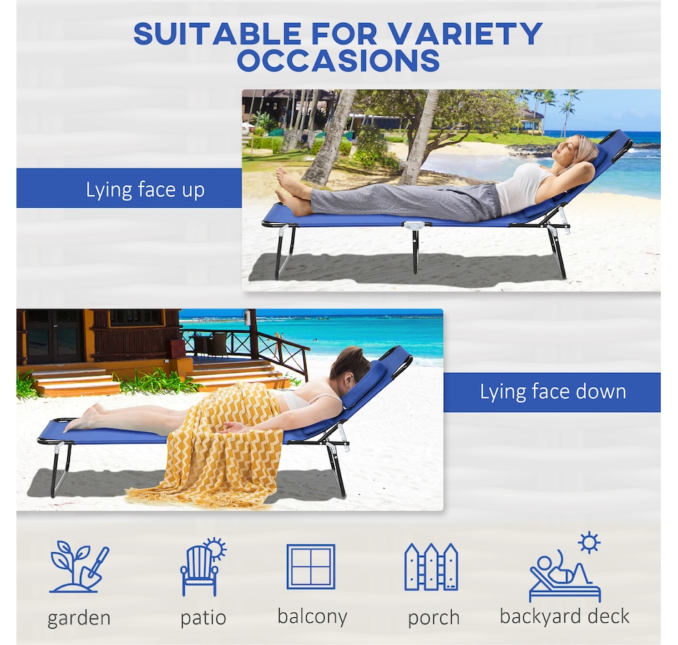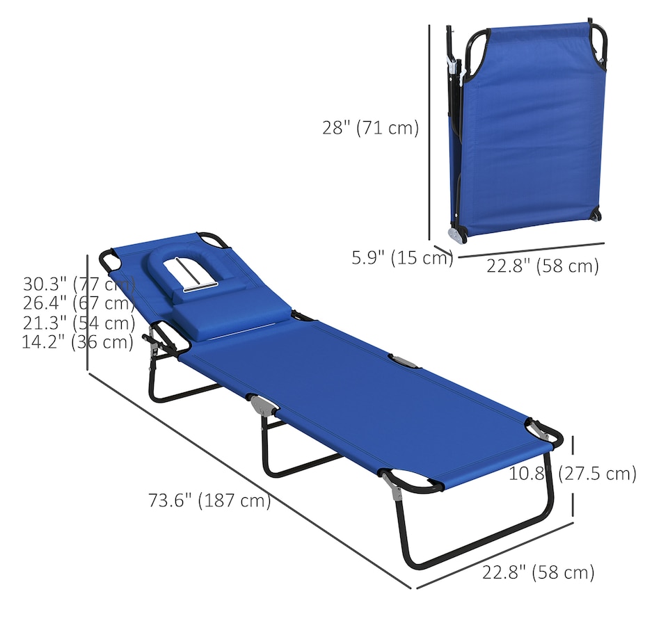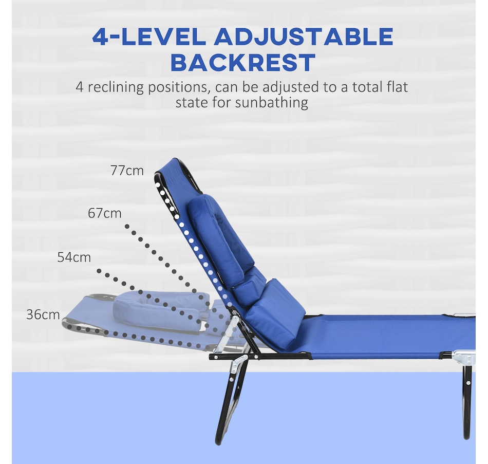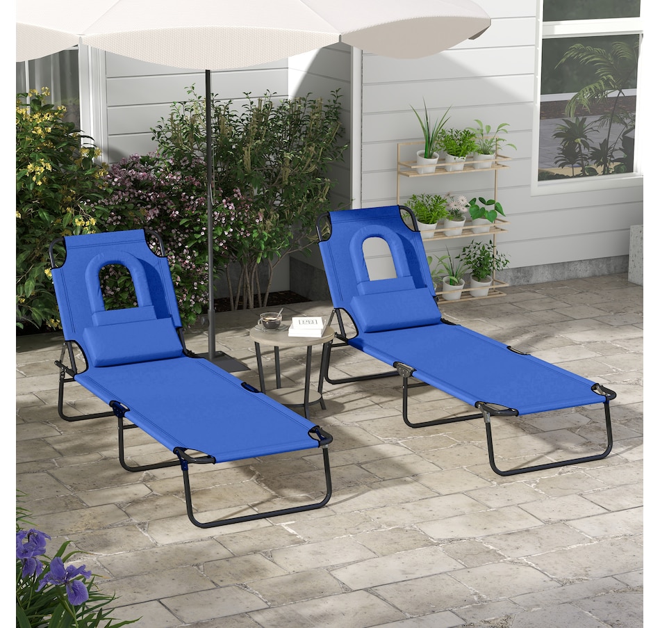 Our Outsunny folding sun lounger set of 2 features high-quality steel construction, making it great for enjoying the sun on your patio, conservatory, poolside, or garden. With 4 adjustable backrest positions and a unique face hole, you can sunbathe in comfort.