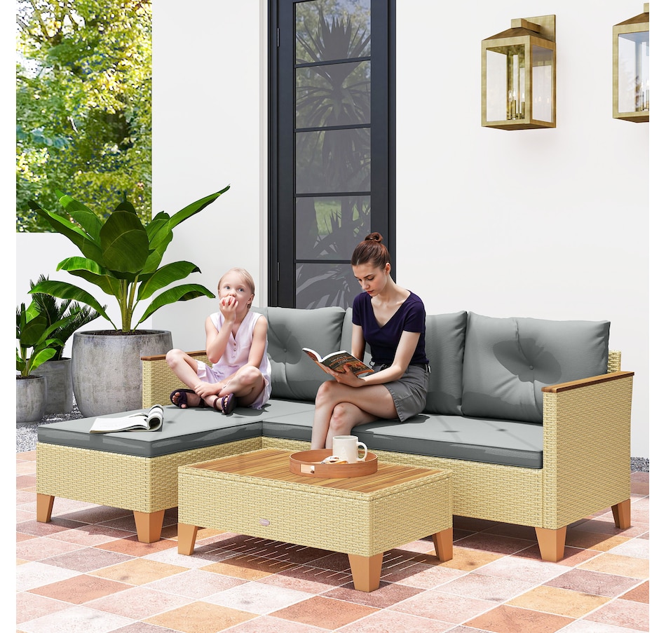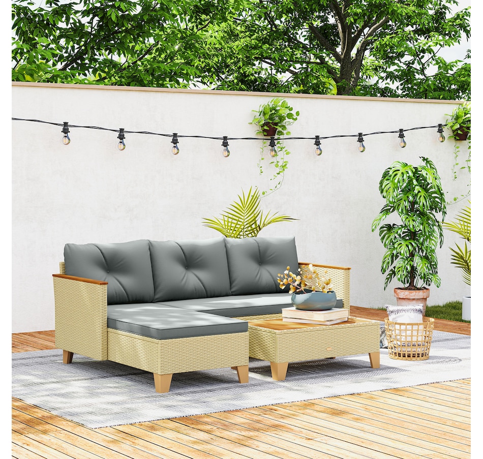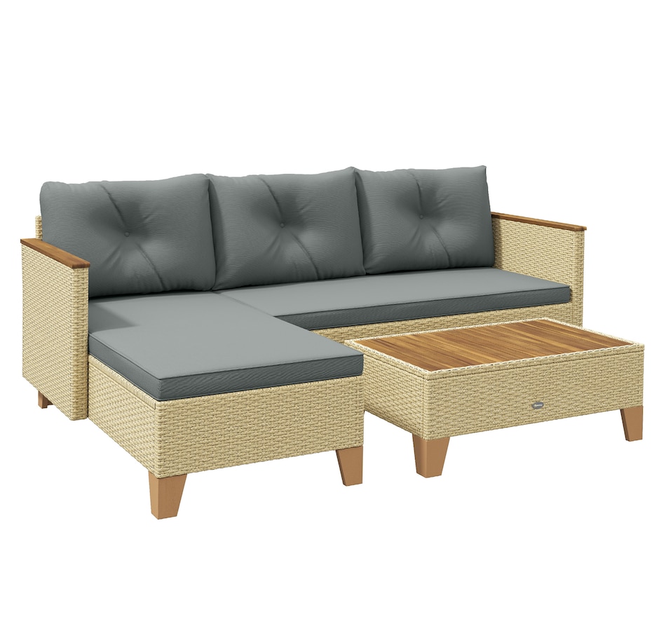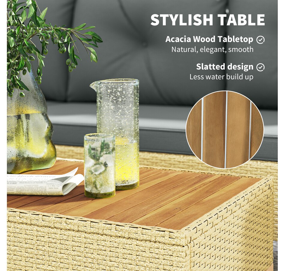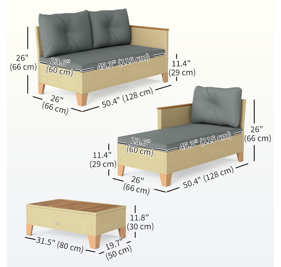 Transform your garden into a haven of relaxation with the Outsunny Outdoor patio furniture set. Comprising a left loveseat, right chaise lounge, and a stylish coffee table with an acacia wood top, this outdoor sofa set is great for lounging and socializing. Removable, washable back cushion covers and UV-resistant PE rattan ensure comfort and durability, no matter the season.