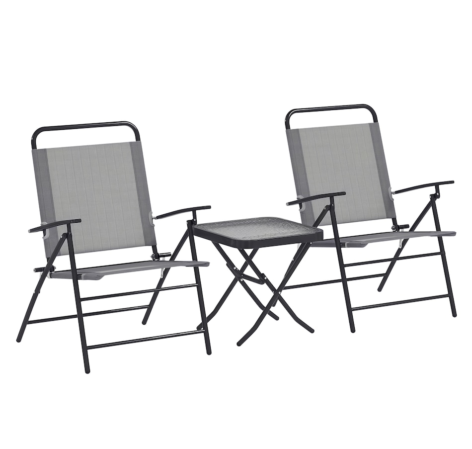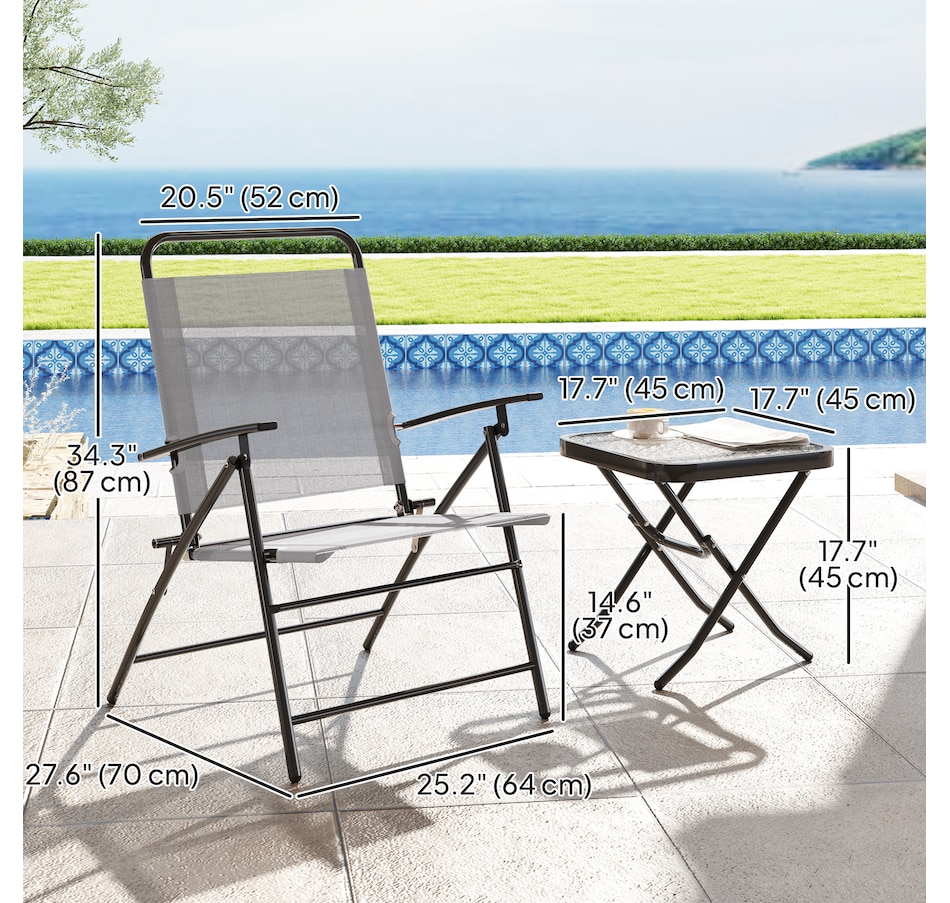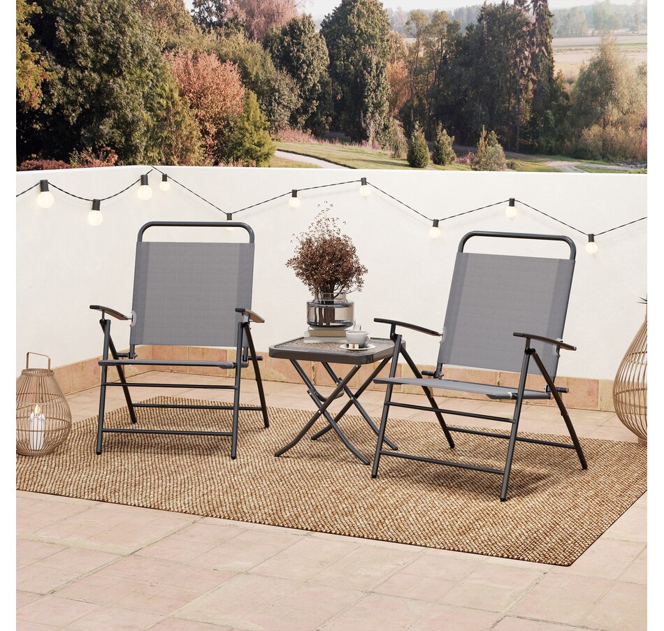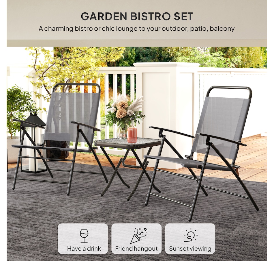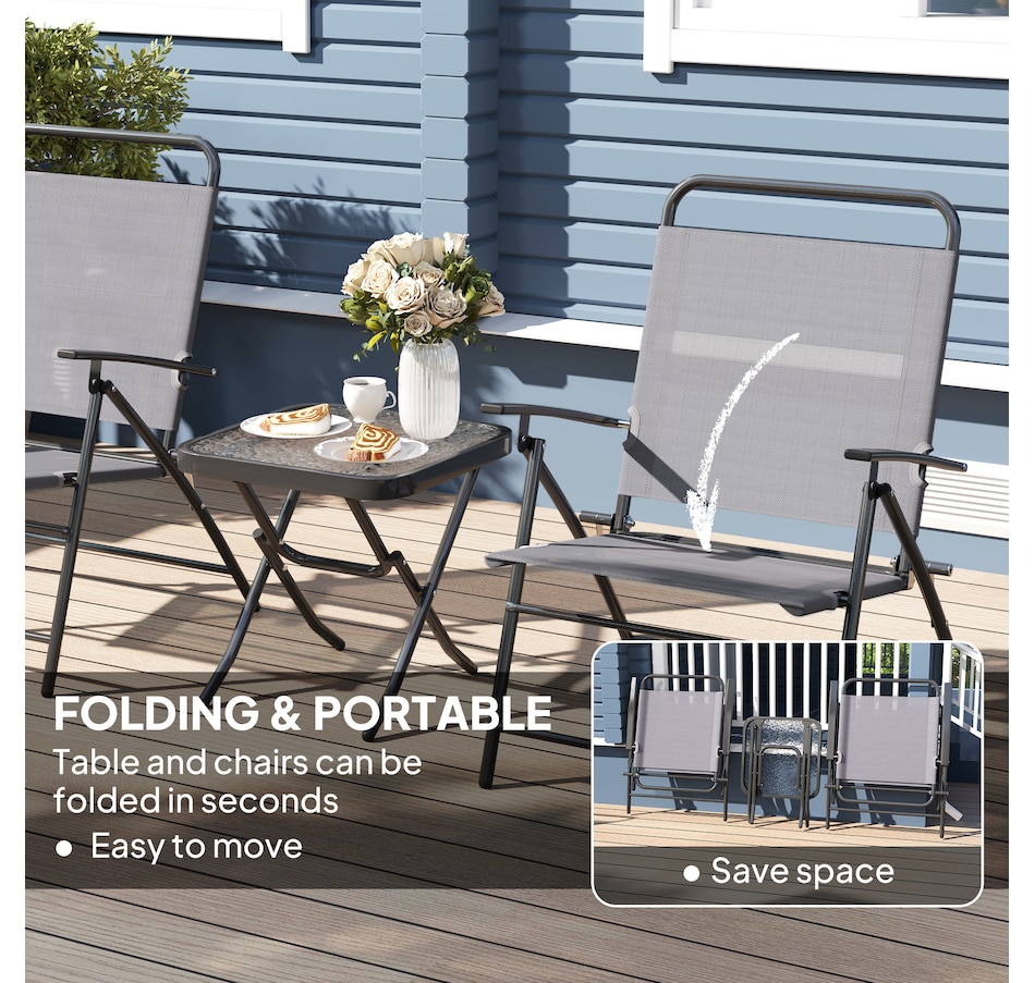 Brighten your outdoor space with the Outsunny 3-piece patio set, a charming bistro, or a chic lounge addition for small spaces. Our outdoor table and chairs can be folded to save space when not in use. Powder-coated steel frames offer a strong patio table and chairs. Featuring a breathable mesh seat, adjustable back, and supportive curved armrests, this balcony furniture set is a stunning and cozy corner for friend hangouts, daily talk, and sunset viewing.Features: