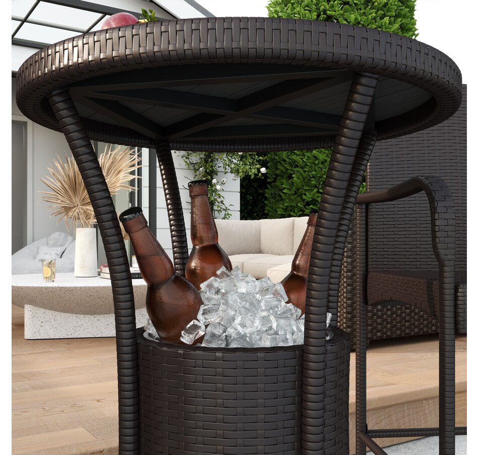Optimal place for your friends and family gathering, party and other activities! This set includes 1 table and 2 stools. Made of all-weather rattan wicker, this furniture set will be a great decoration for your outdoor living space. Barstools equipped with built-in footrest. PS board table-top is stylish and ease of cleaning. It includes an ice bucket, so you can have some iced drinks while enjoying the afternoon. Update your outdoor space with this great patio bar set.