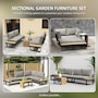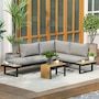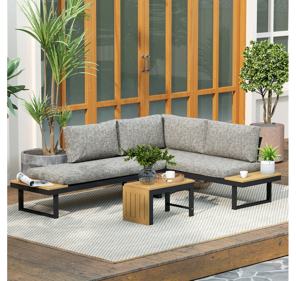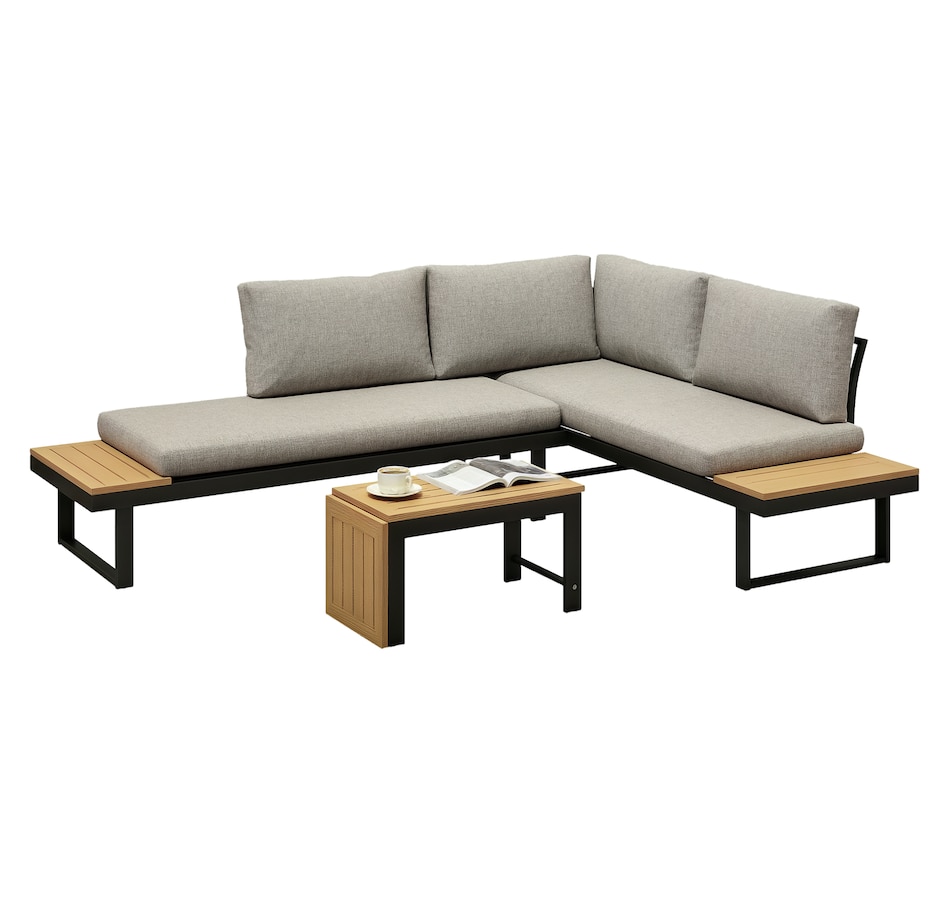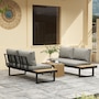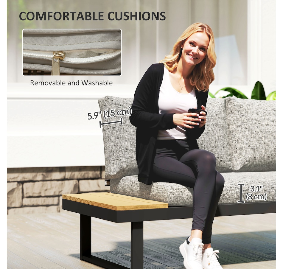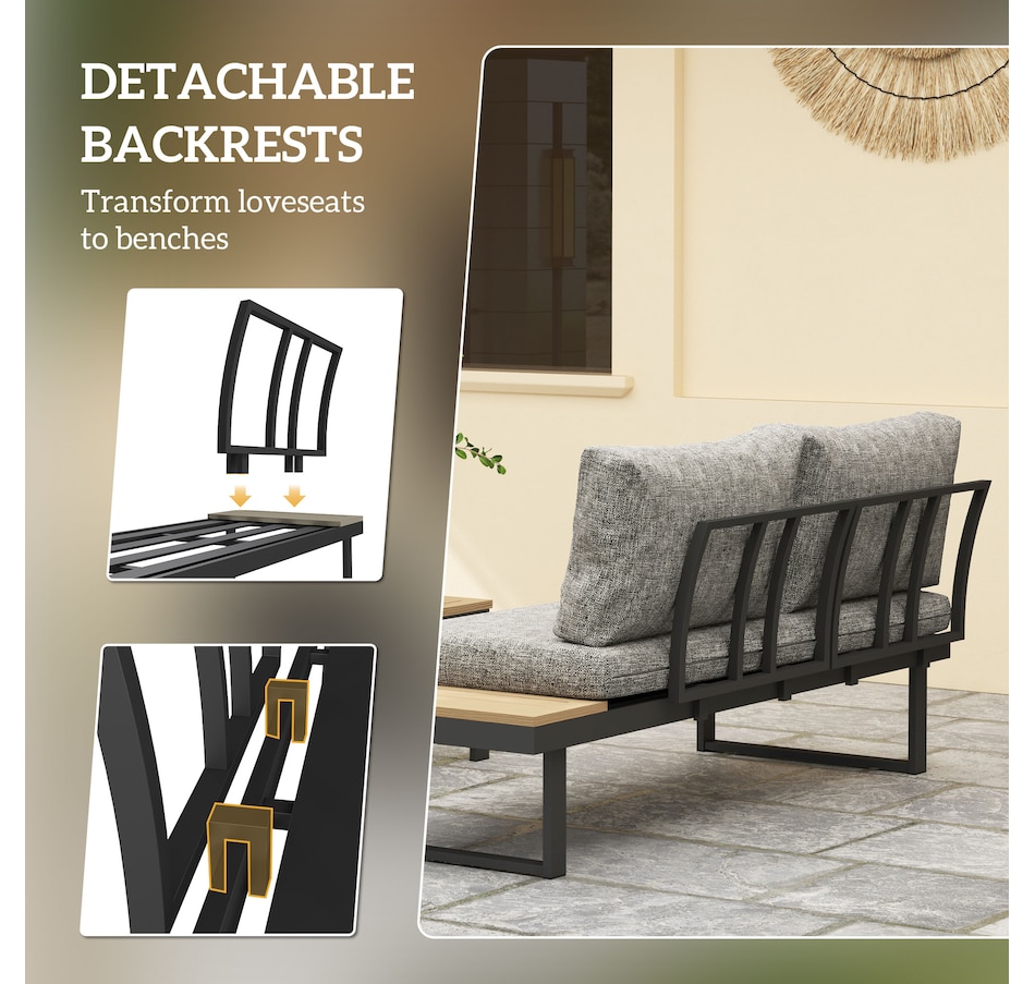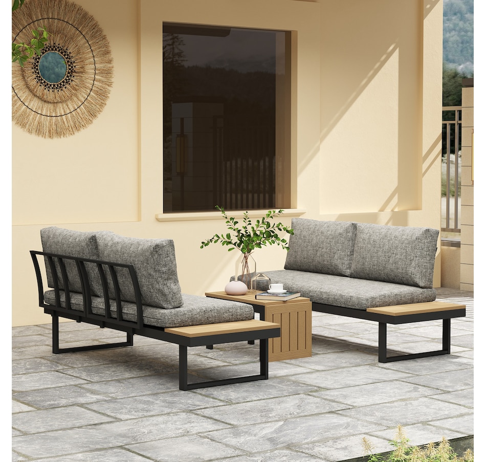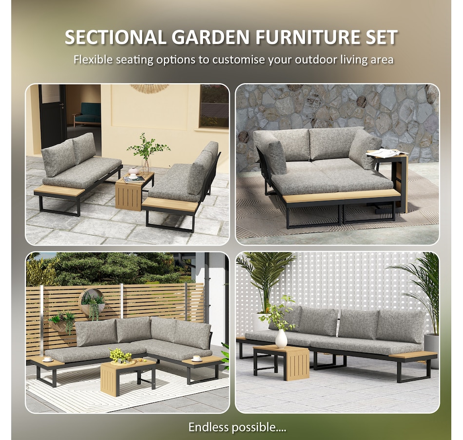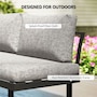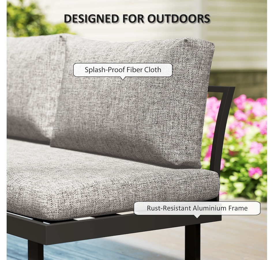 Transform your patio into a haven of relaxation with the outdoor sectional from Outsunny. This versatile modular patio conversation set includes two loveseats with detachable backs and a functional coffee table, crafted from water-resistant fiber cloth for year-round enjoyment. Sink into the cozy, thickly padded cushions and enjoy convenience at your fingertips with built-in side tables. Our Outsunny L shaped aluminum patio sectional set is great for any outdoor setting, from lawns to balconies