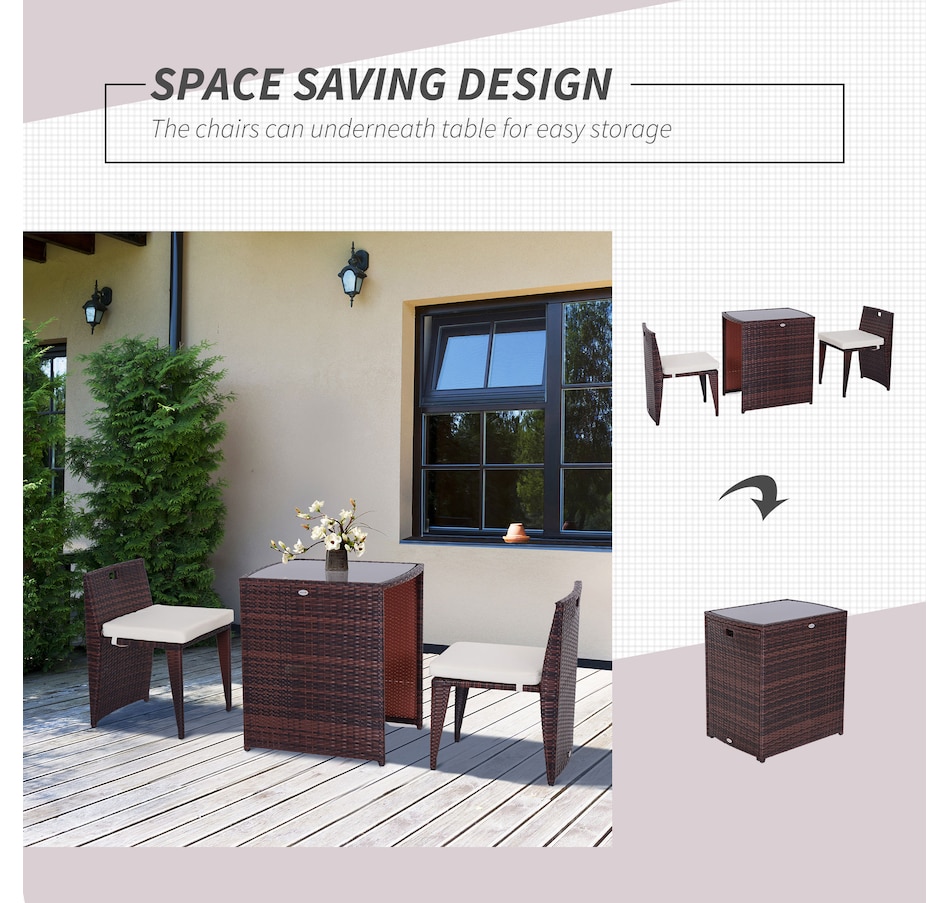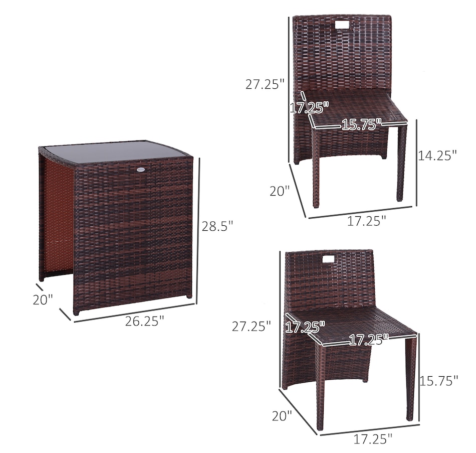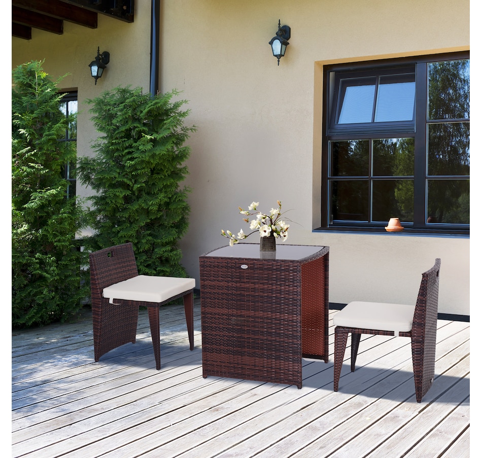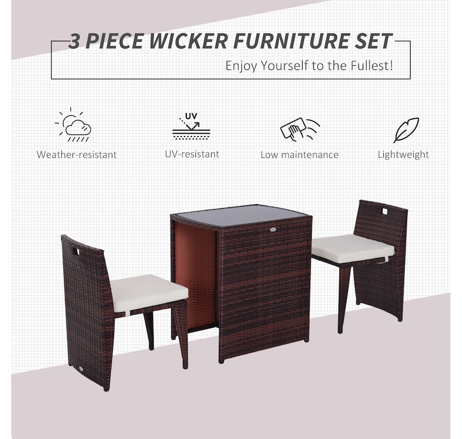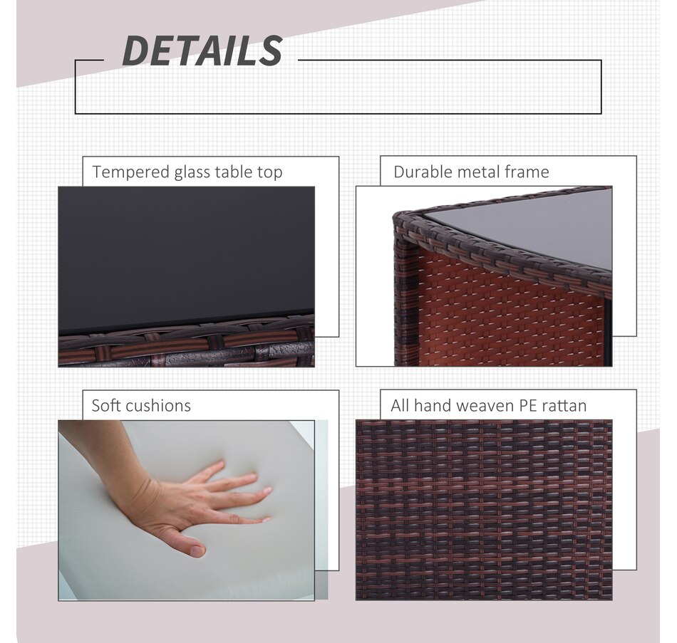 Outsunny offers you the classic way to enjoy outdoor living with this 3pc patio rattan set. The 2 chairs and 1 matching table set can make a great addition to your outdoor patio or deck. Its solid steel frame construction, high quality PE rattan and polyester cloth in exquisite workmanship ensures lasting durability. The table comes with 0.2” thick tempered glass for solid refreshment placement and the thick padded cushions offer optimal comfort.