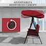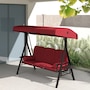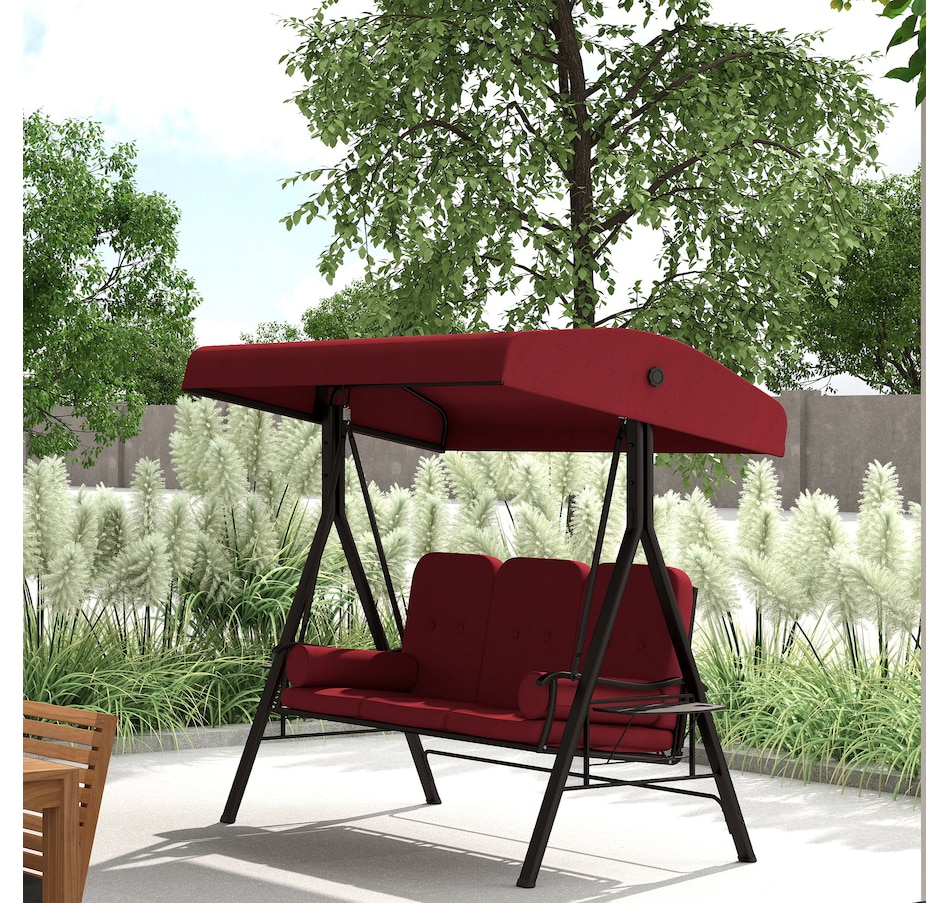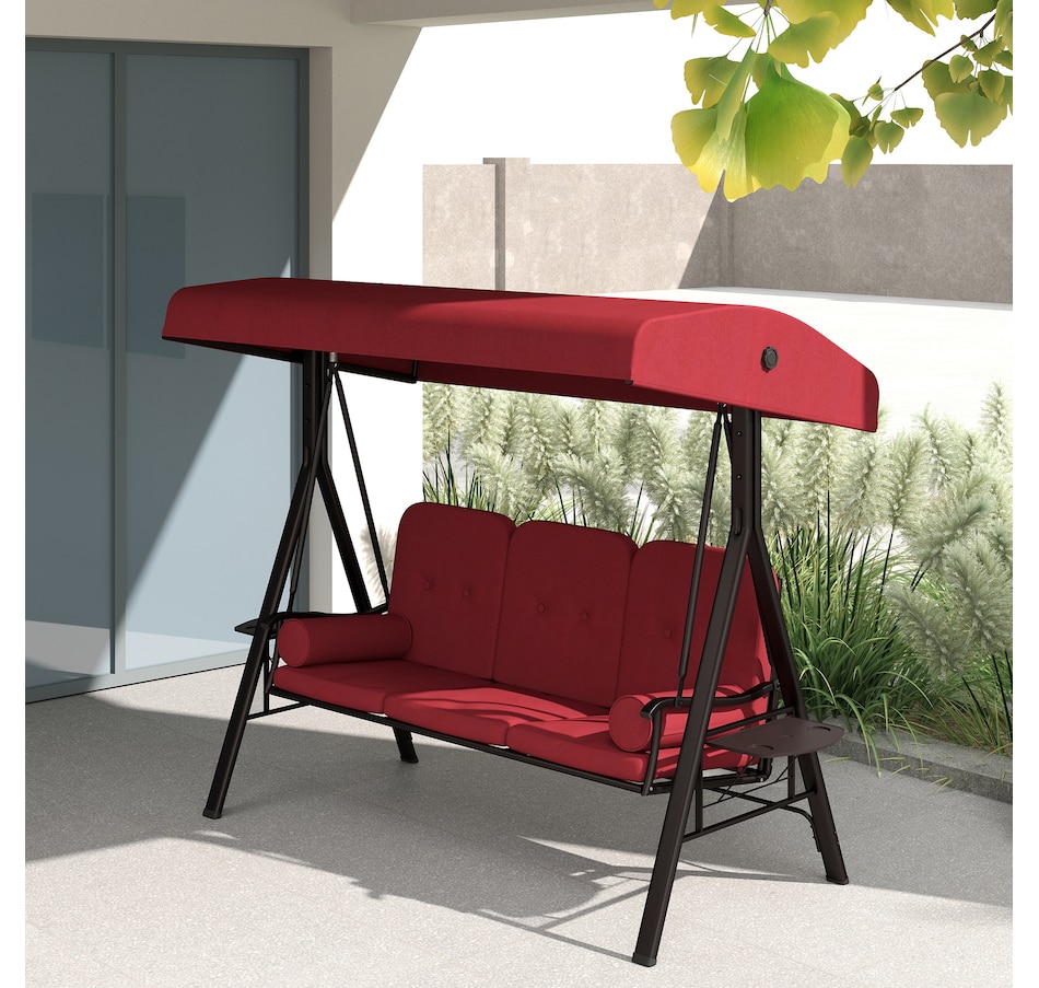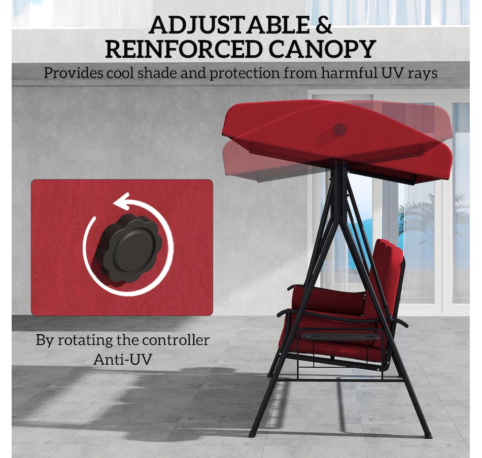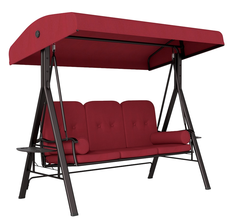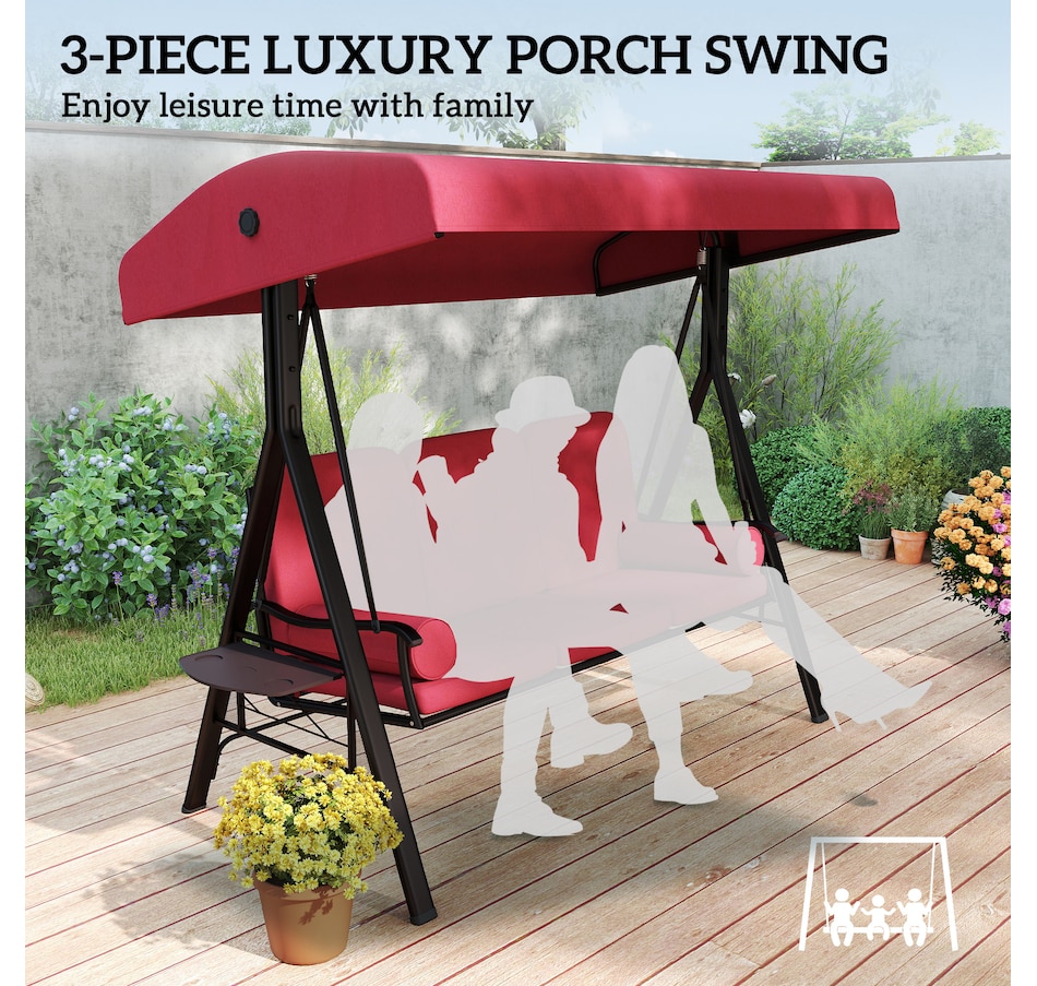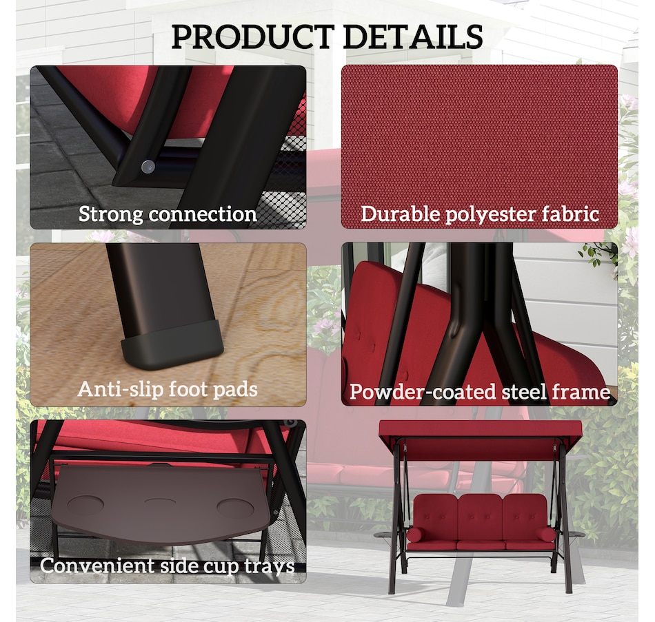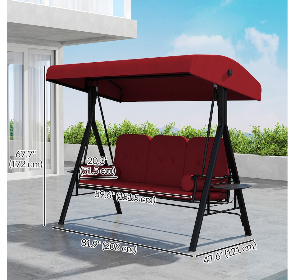 Relax and enjoy with friends and family in outdoor swing chair for adults from Outsunny. The 3 seat swing frame is made of powder coated steel with a polyester canopy for extra shade. The adjustable outside swing tilt canopy provides maximum shade, foldable cup holders for convenience, and two extra round pillows for added comfort. Sit back, grab your favorite drink, and let the summer breeze take you away in this relaxing Outsunny covered swing.Features: