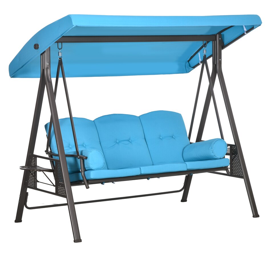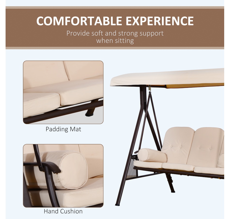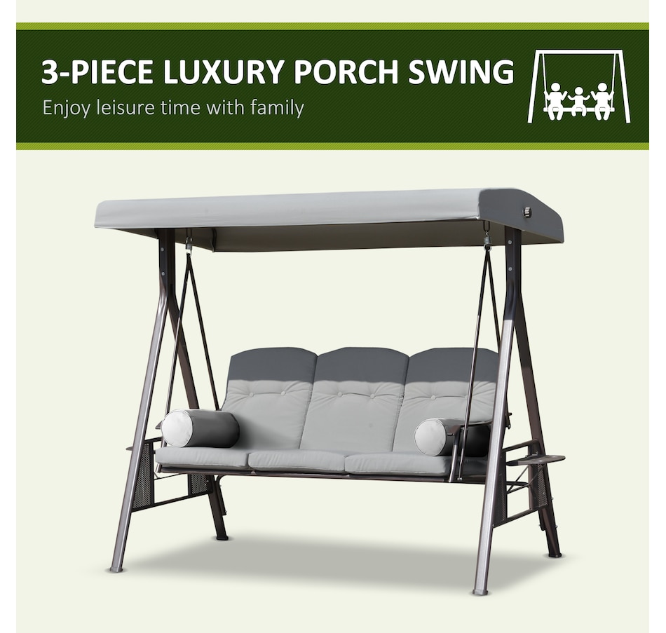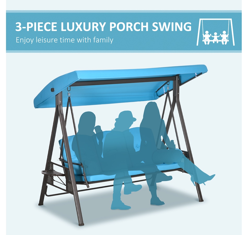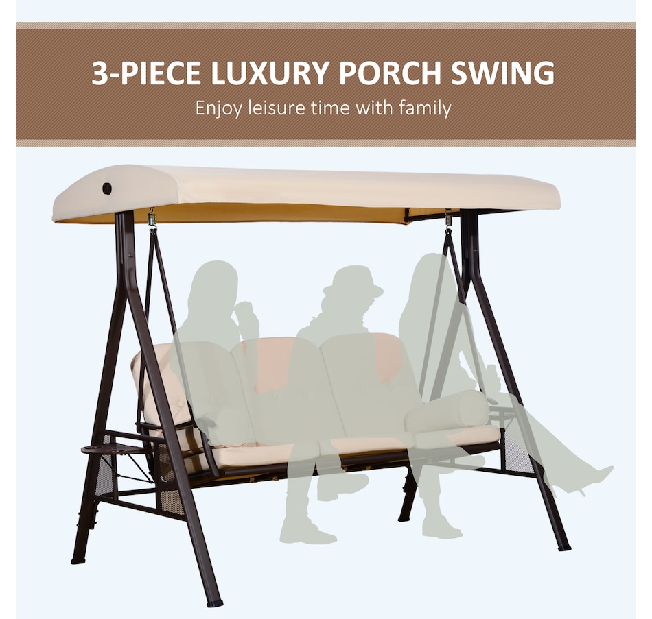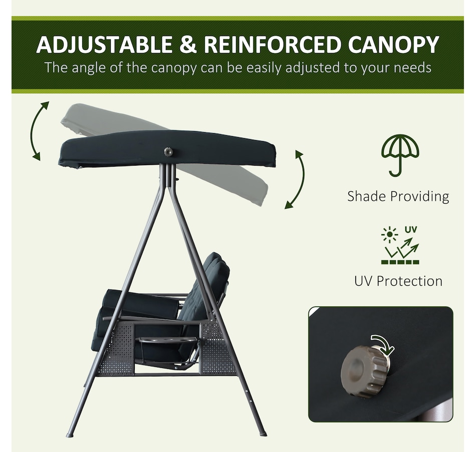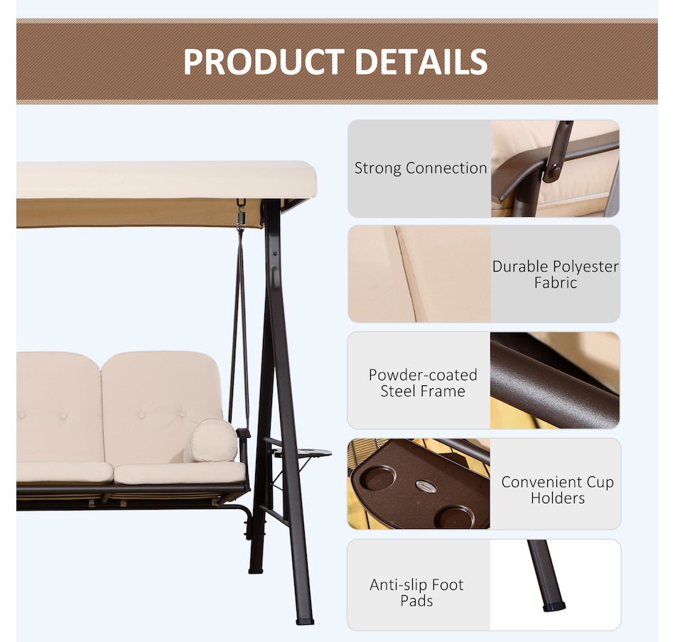 Relax and enjoy with friends and family in outdoor swing chair for adults from Outsunny. The 3 seat swing frame is made of powder coated steel with a polyester canopy for extra shade. The adjustable outside swing tilt canopy provides maximum shade, foldable cup holders for convenience, and two extra round pillows for added comfort. Sit back, grab your favorite drink, and let the summer breeze take you away in this relaxing Outsunny covered swing.